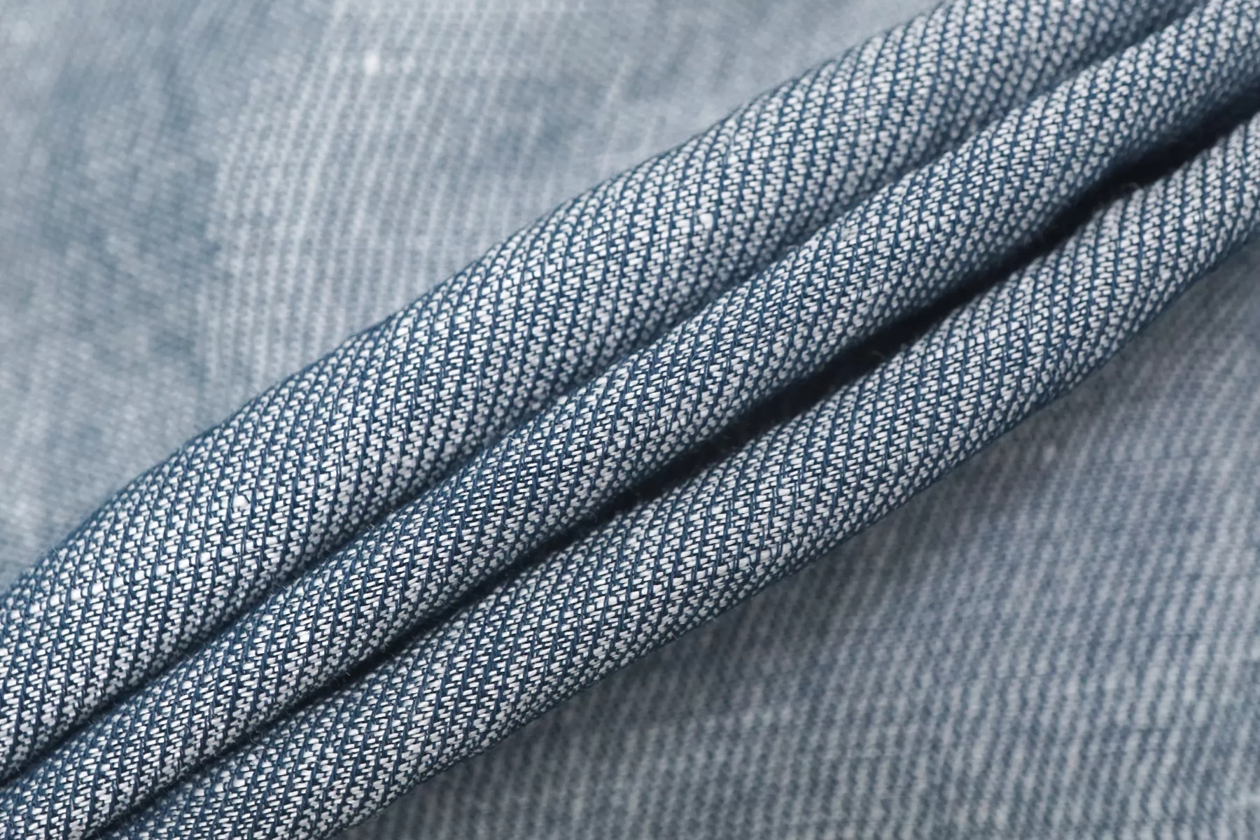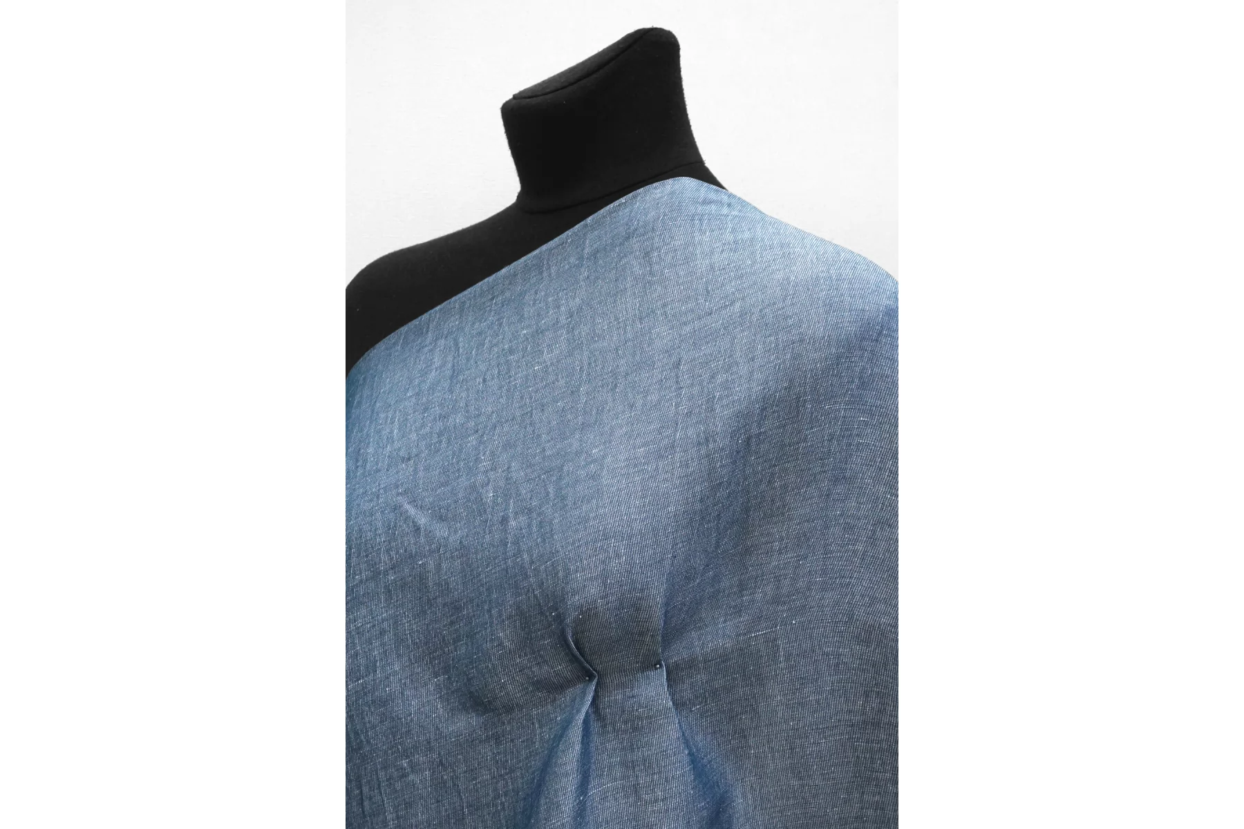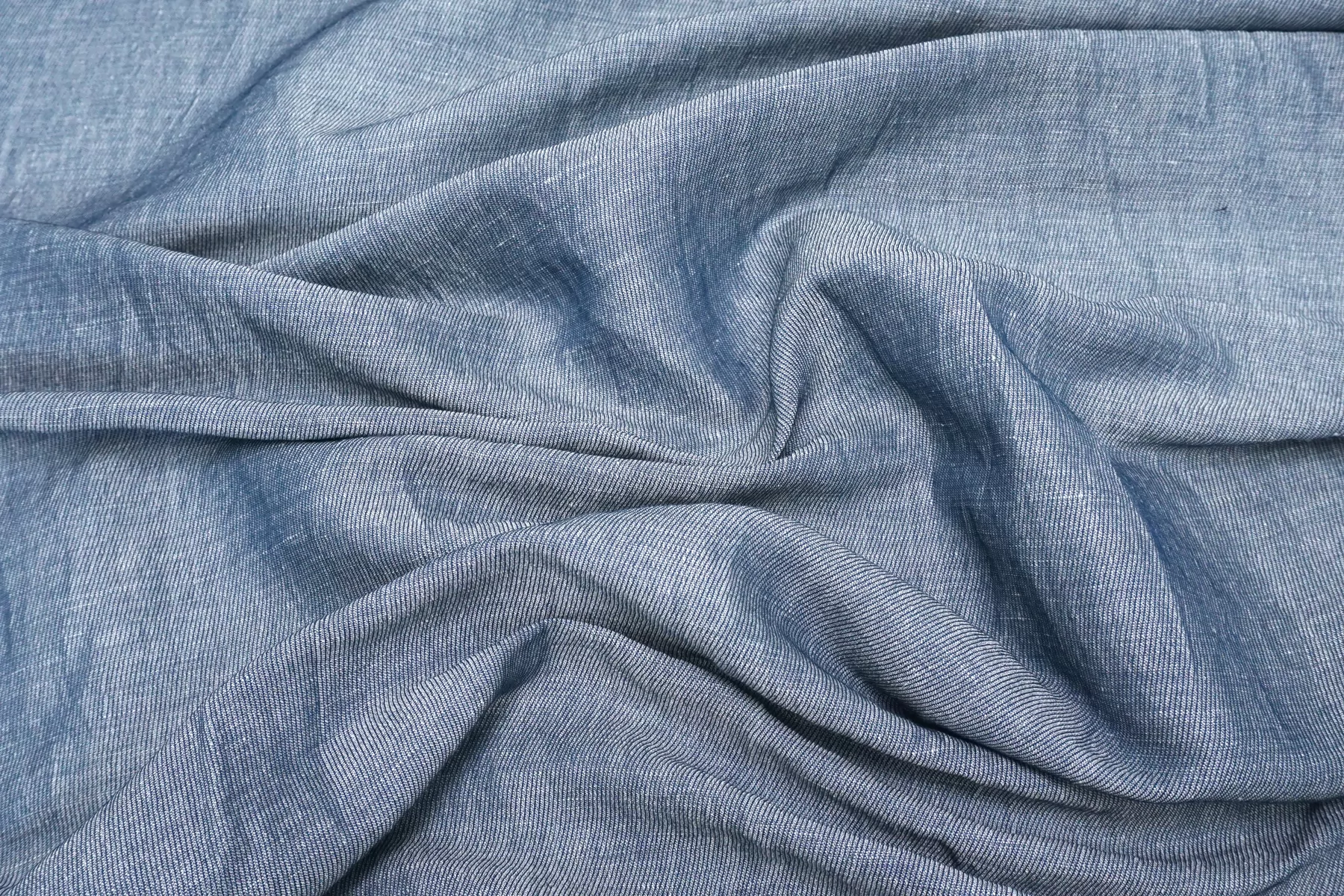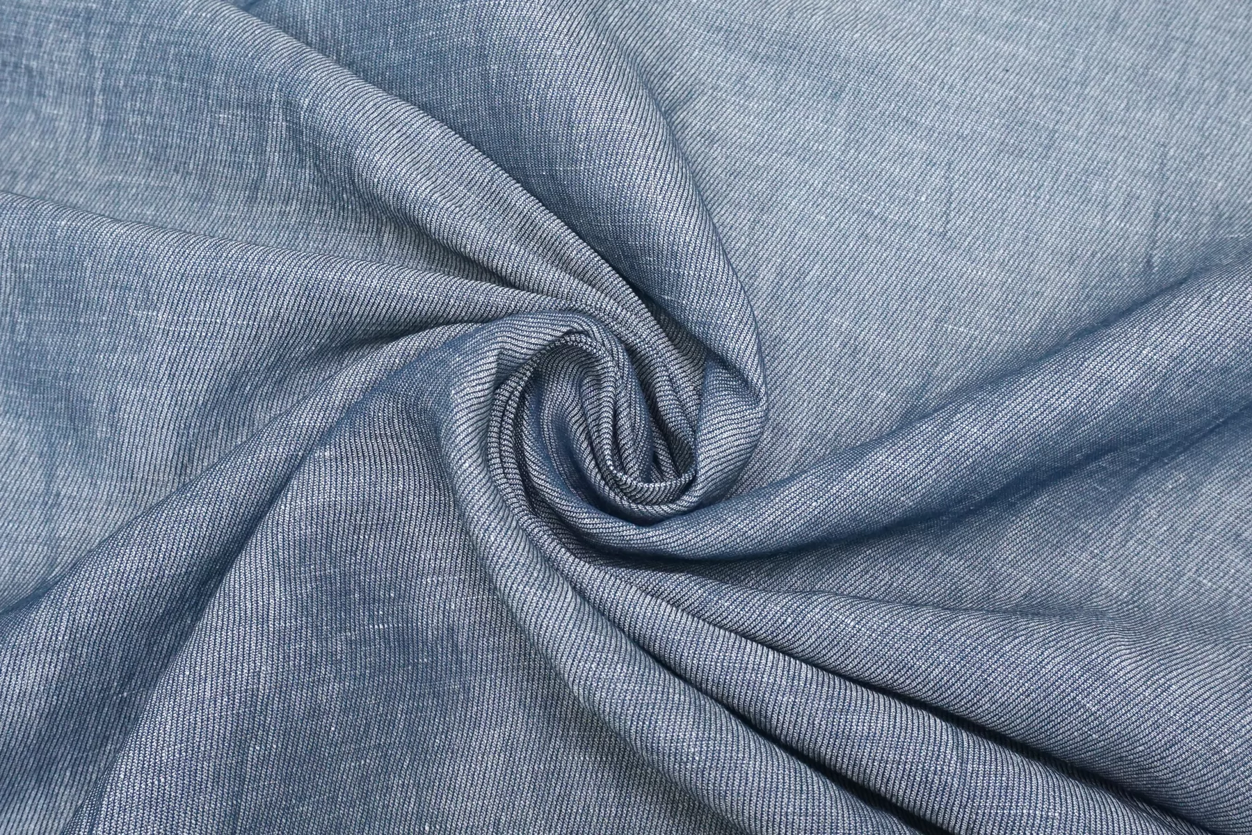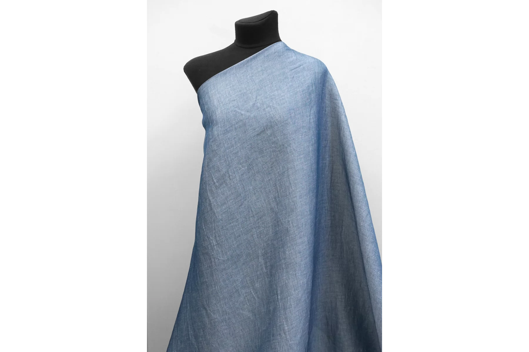 Прекрасный костюмно-плательный лен с вискозой диагонального плетения под джинсу из переплетения нитей светло-синего и белого цвета. Лицевая сторона гладкая, скользящая, красиво переливается. Изнаночная сторона слегка шероховаатая наощупь. Тонкая. Не просвечивает, немного держит форму, слегка мнется за счет присутствия льна, с красивой мягкой пластикой. Красиво драпируется. Подойдет для пошива жакета, костюма, демисезонной юбки, брюк, платья. Учитывайте возможную усадку.