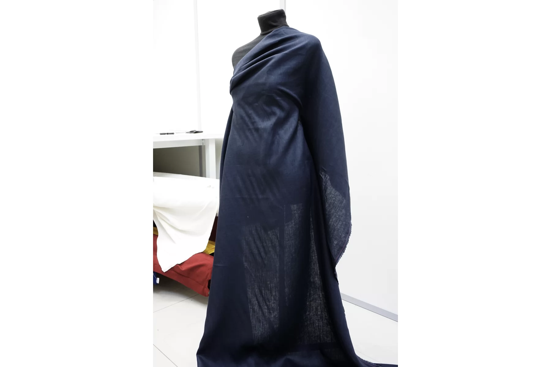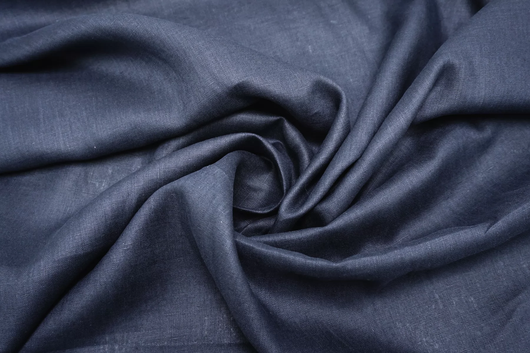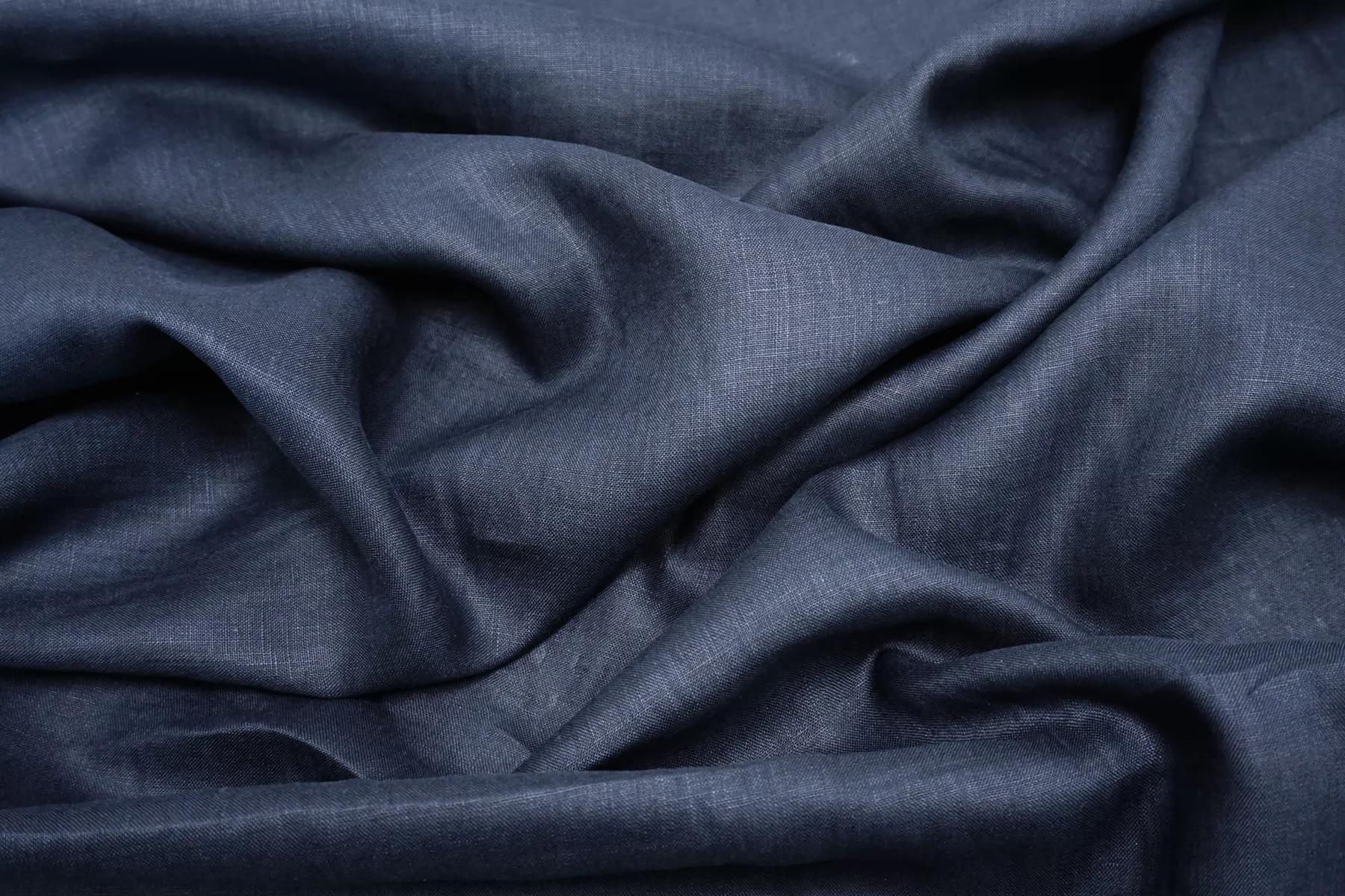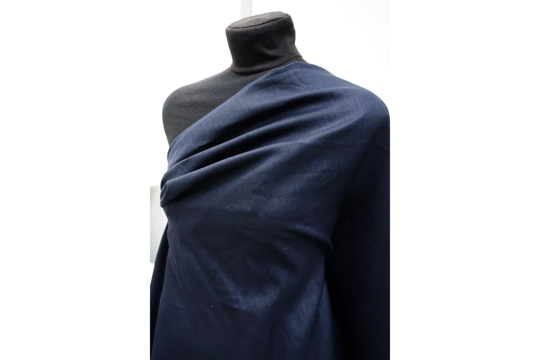 Шикарный костюмно-плательный лён темно-синего оттенка. Приятный и очень мягкий наощупь, немного суховатый, что свойственно льну, пластичный. Мнется. Не тянется. Просвечивает немного в один слой. Хорошо драпируется и красиво смотрится в складке. Прекрасно подойдет на костюмы, платья, юбки и не только. При необходимости используйте подкладочный материал.
