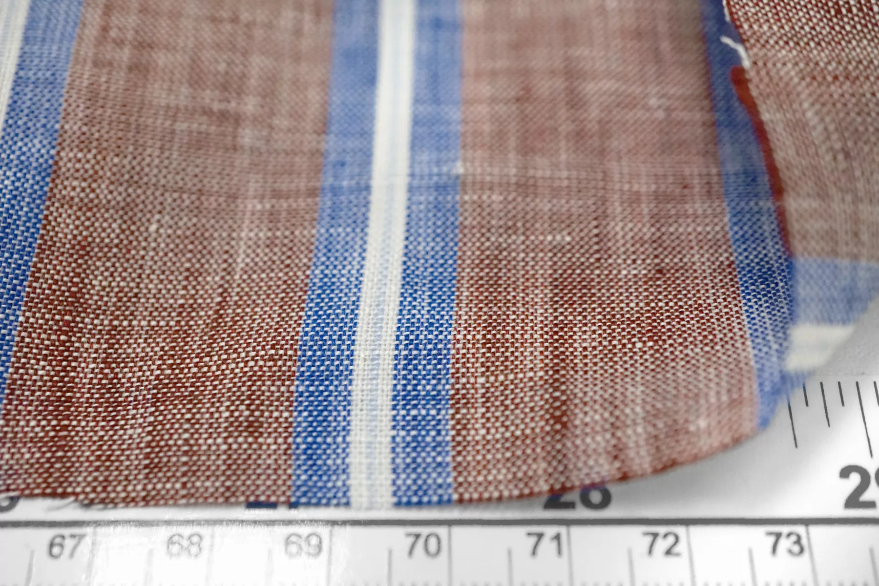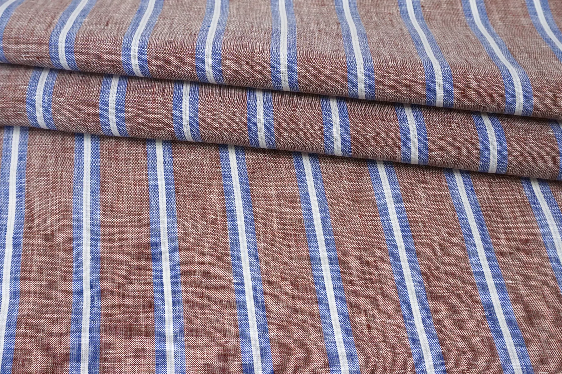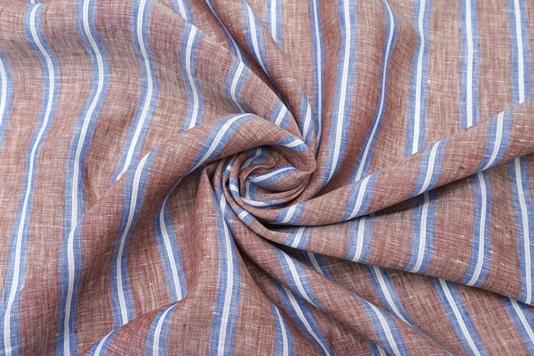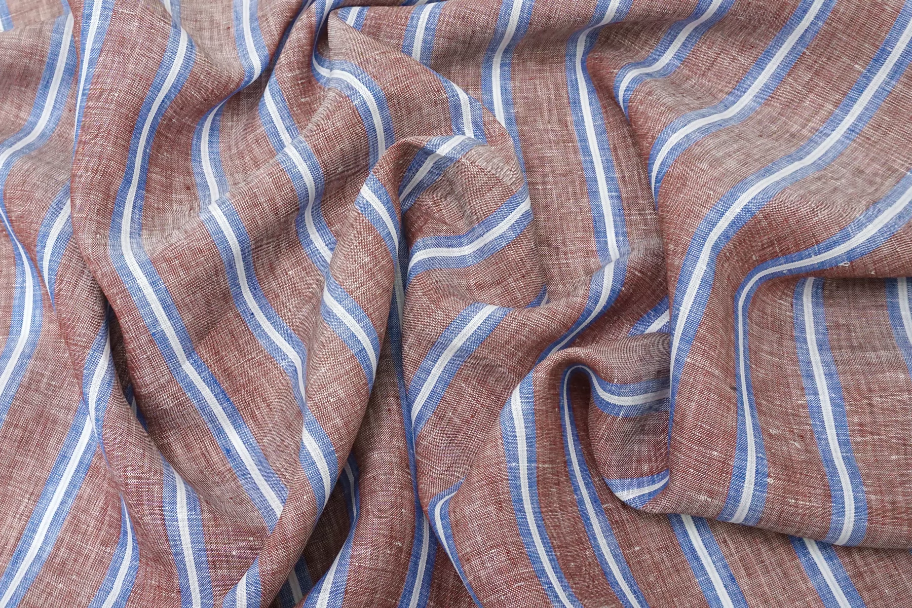 Прекрасный костюмно-плательный лён полотняного плетения, нити бордового, белого, сине-голубого и белого цвета, узор-полоска расположен вдоль кромки. Приятный и очень мягкий наощупь, немного суховатый, что свойственно льну, пластичный. Мнется. Не тянется. Минимально просвечивает немного в один слой. Хорошо драпируется и красиво смотрится в складке. Прекрасно подойдет на костюмы, платья, юбки и не только. При необходимости используйте подкладочный материал.