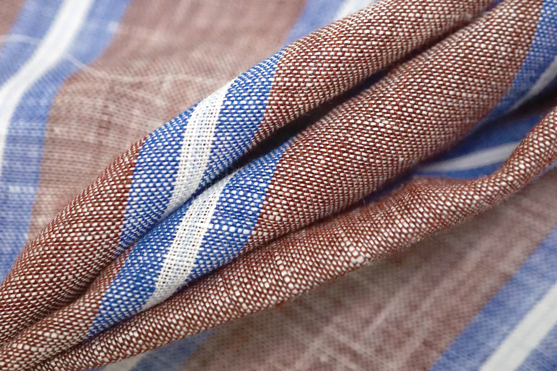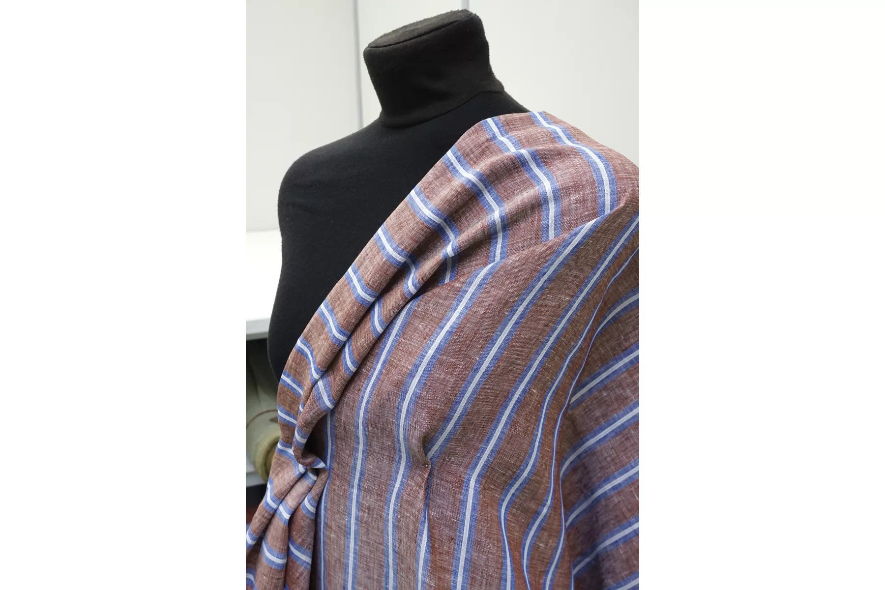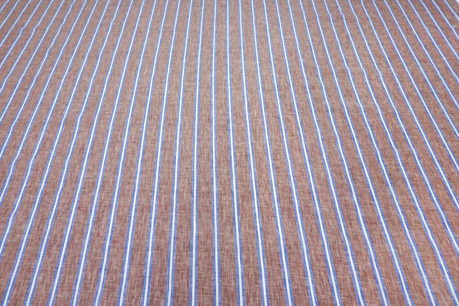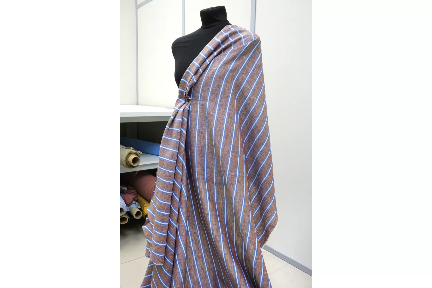 Прекрасный костюмно-плательный лён полотняного плетения, нити бордового, белого, сине-голубого и белого цвета, узор-полоска расположен вдоль кромки. Приятный и очень мягкий наощупь, немного суховатый, что свойственно льну, пластичный. Мнется. Не тянется. Минимально просвечивает немного в один слой. Хорошо драпируется и красиво смотрится в складке. Прекрасно подойдет на костюмы, платья, юбки и не только. При необходимости используйте подкладочный материал.