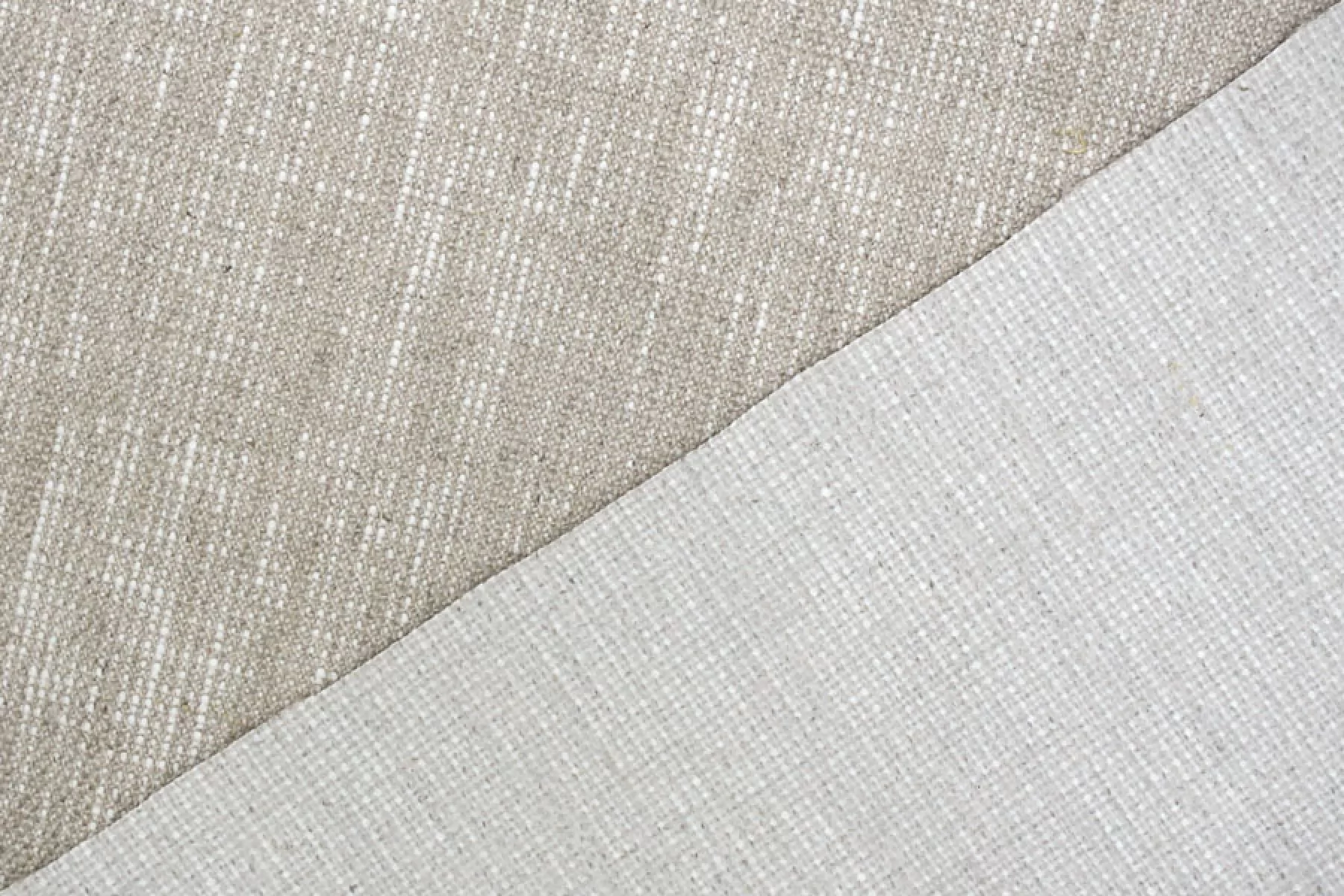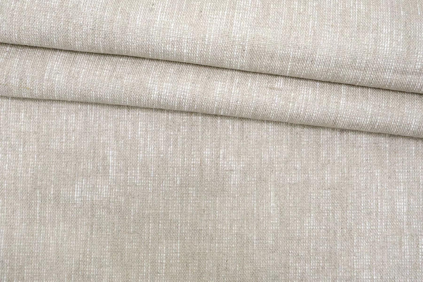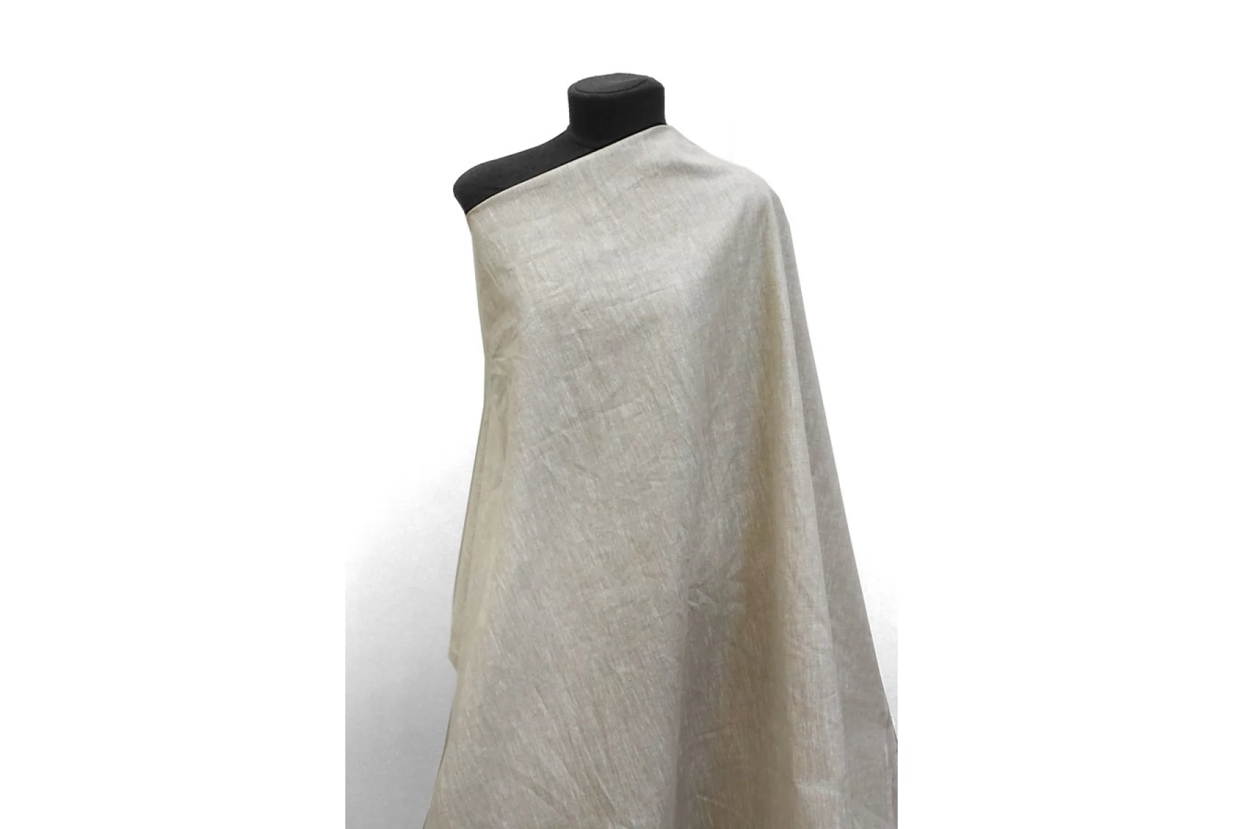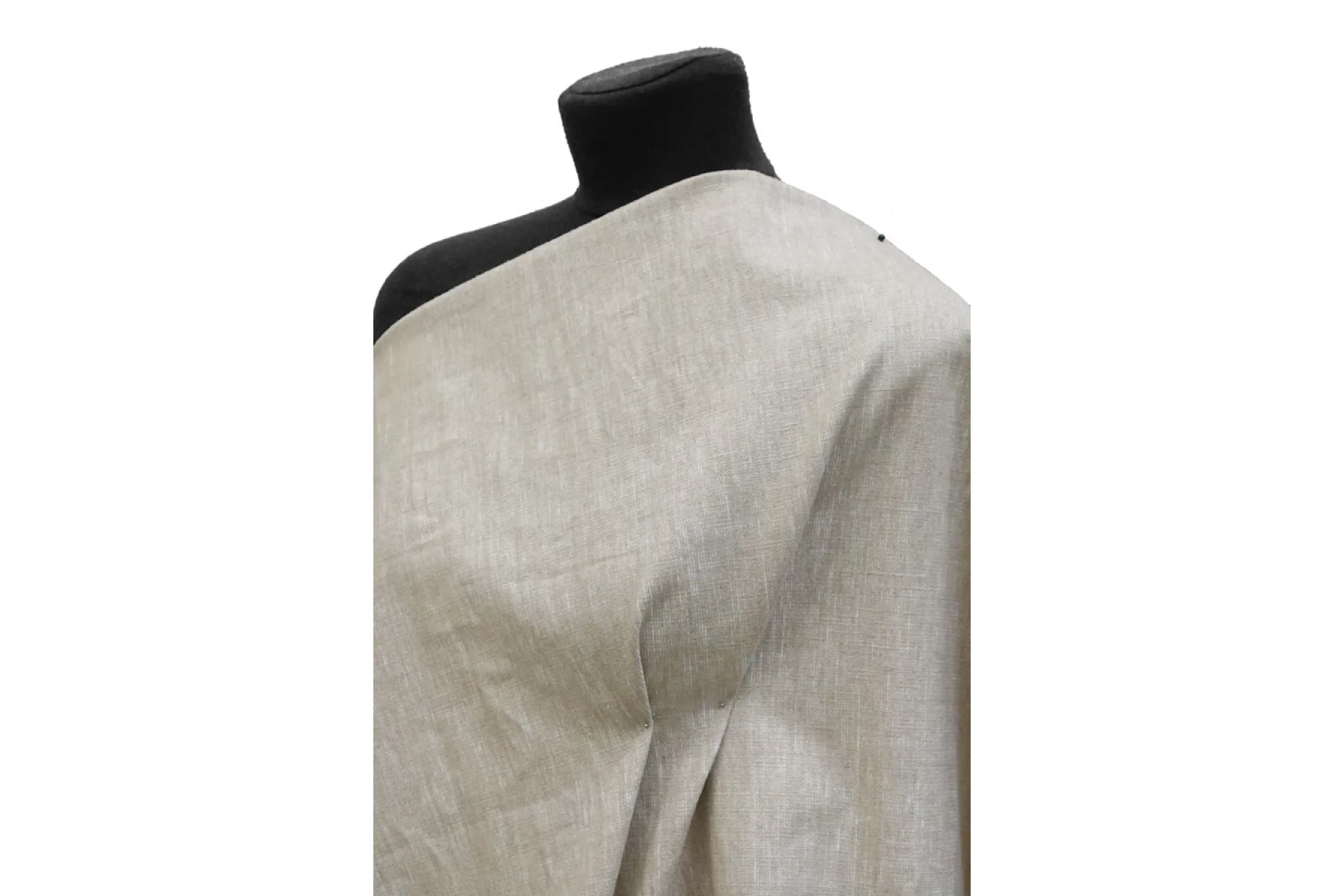 Костюмный лён полотняного переплетения, светлого серо-бежевого оттенка. Изнаночная сторона с пропиктой, позволяющей держать воду. Тактильно материал гладкий и приятный. Обладает красивым лоском. Хорошо держит форму. Не просвечивает. Не тянется. Мнется. Отличный вариант на жакеты, тренчи, куртки.