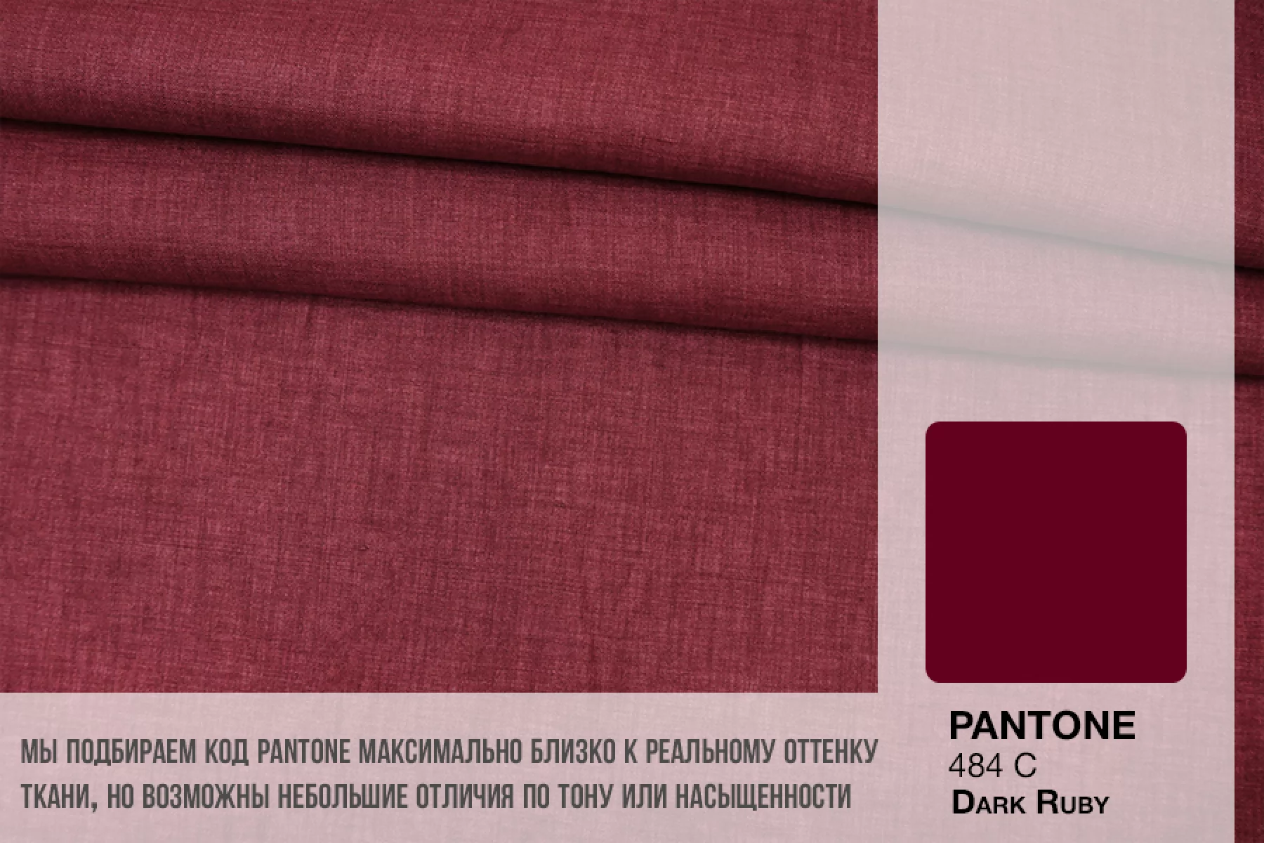 Лёна плательно-рубашечной плотности, в красивом, чуть приглушённом вишнёво-винном оттенке. Материал гладкий, тонкий, чувствуется сухость льна. Мнется. Немного просвечивает силуэт, не тянется. Пластичный, но при этом держит форму. Прекрасный вариант на рубашки, юбки, платья. Материал дает усадку.