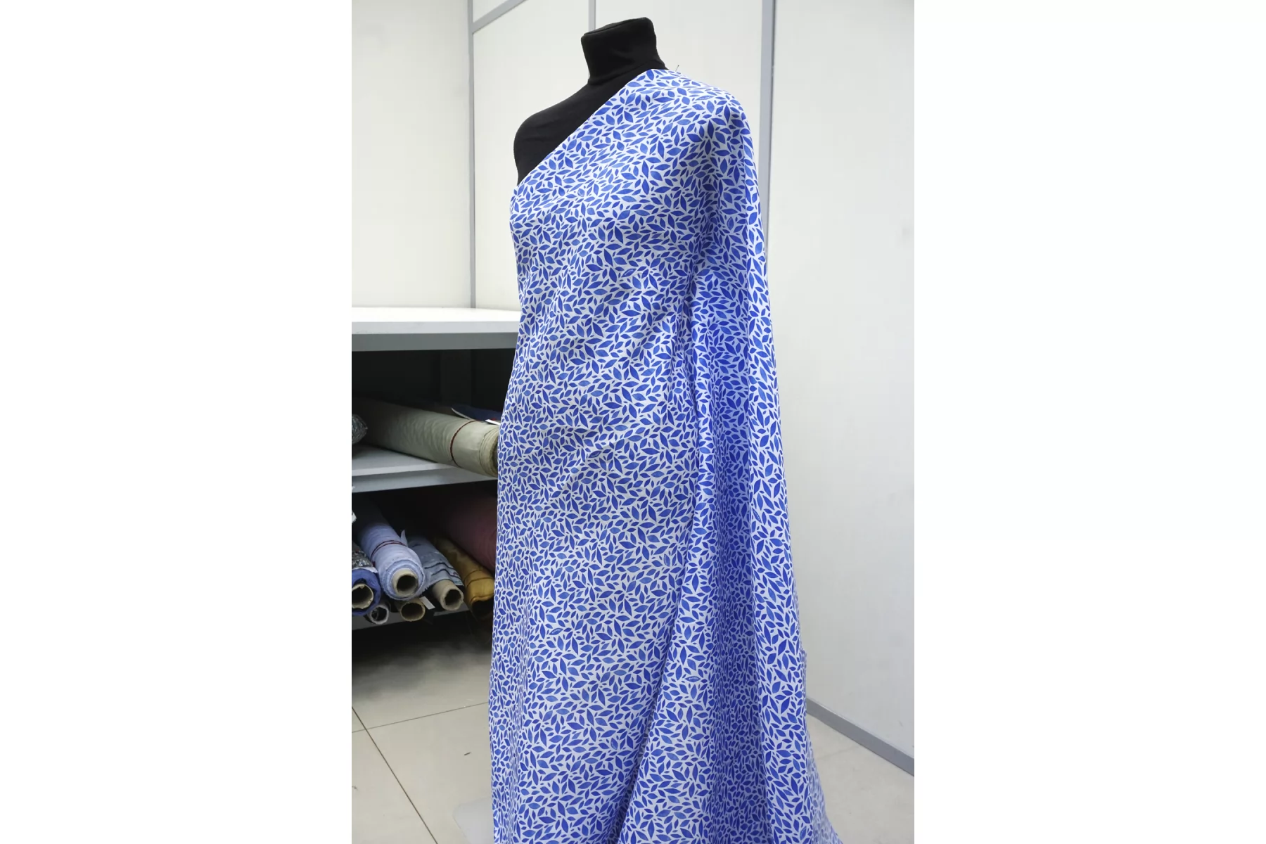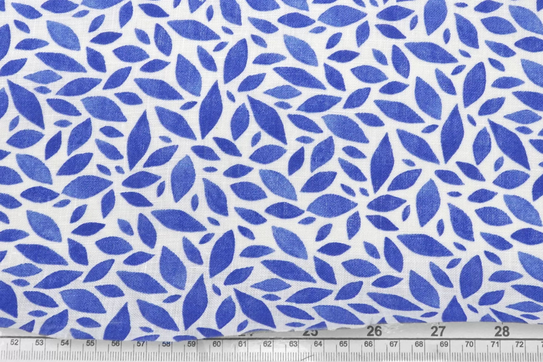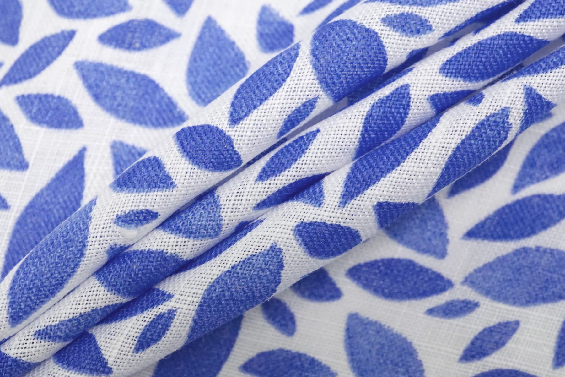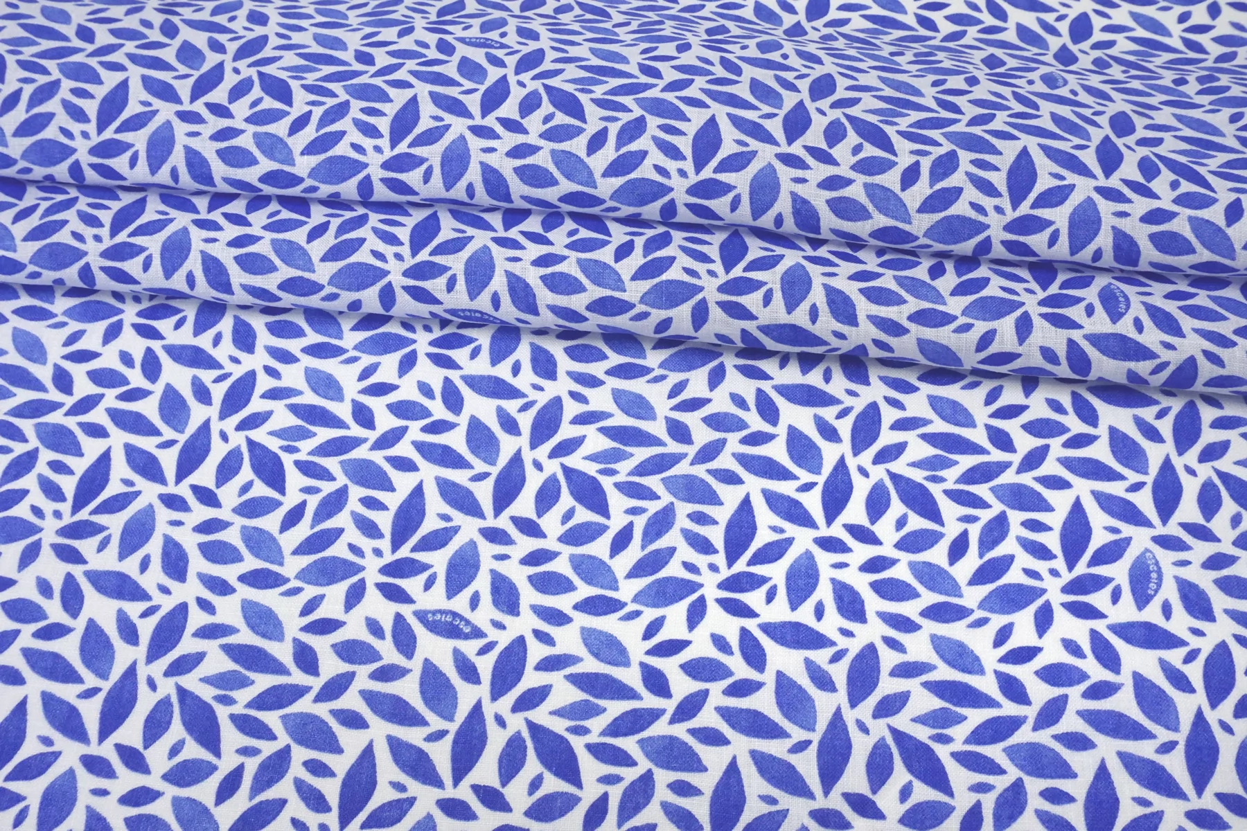 Итальянский лён полотняного плетения, рубашечно-плательной плотности, с синим принтом на белом фоне. Присутствуют классические льняные утолщения нити. Ткань тонкая, тактильно суховатая, просвечивает, мнется. Плетение не плотное. Отличный вариант для летнего изделия - платья, юбки, сарафана, рубашки.