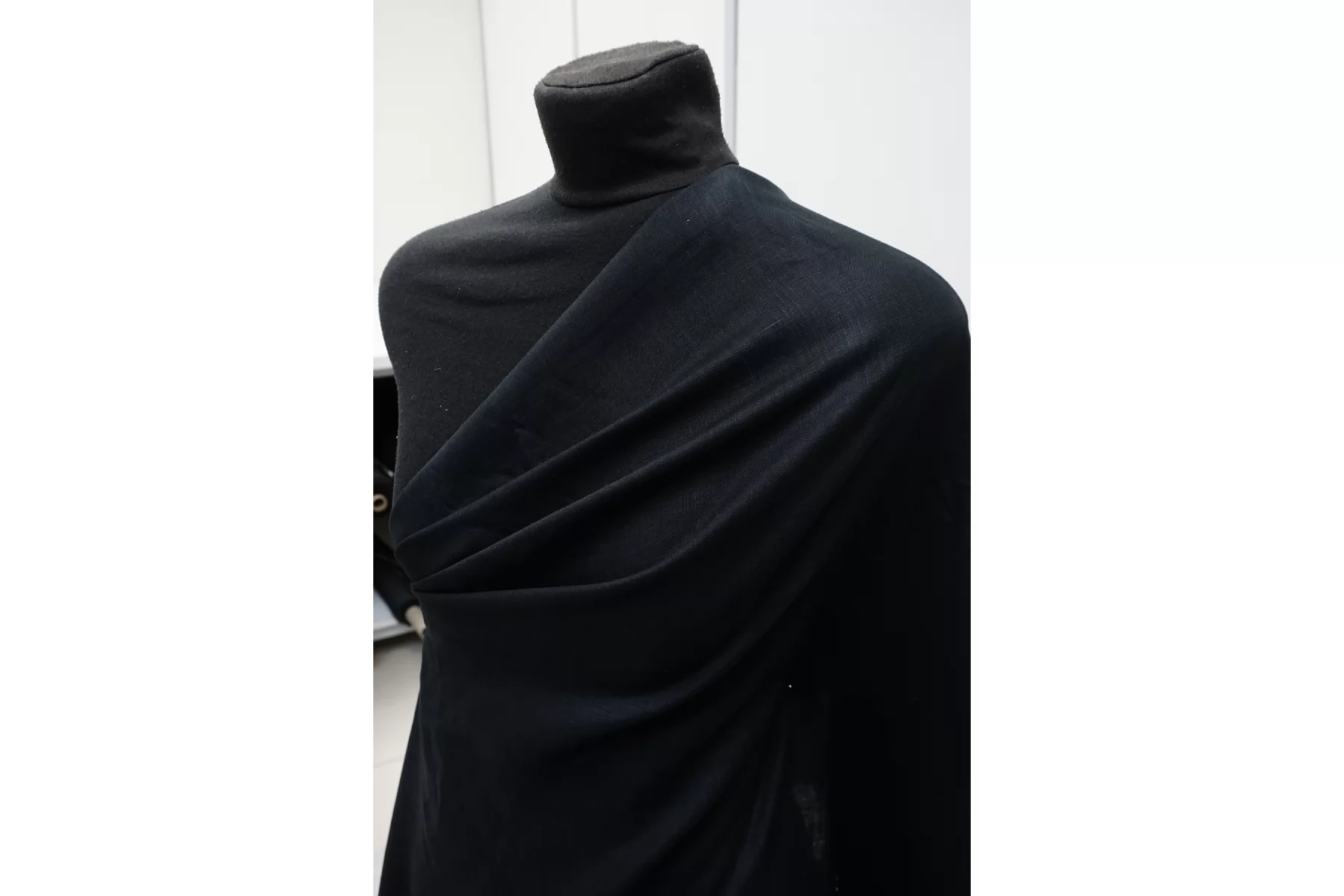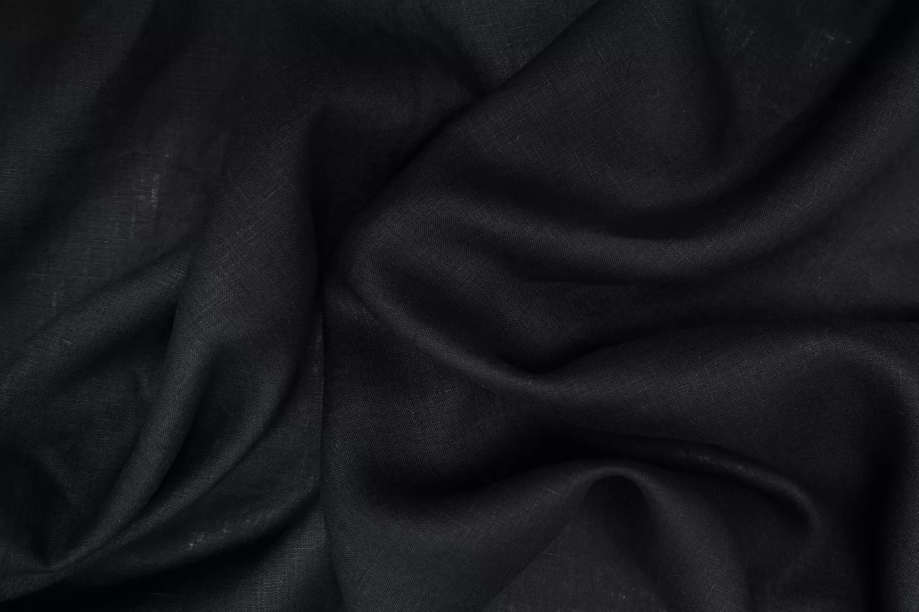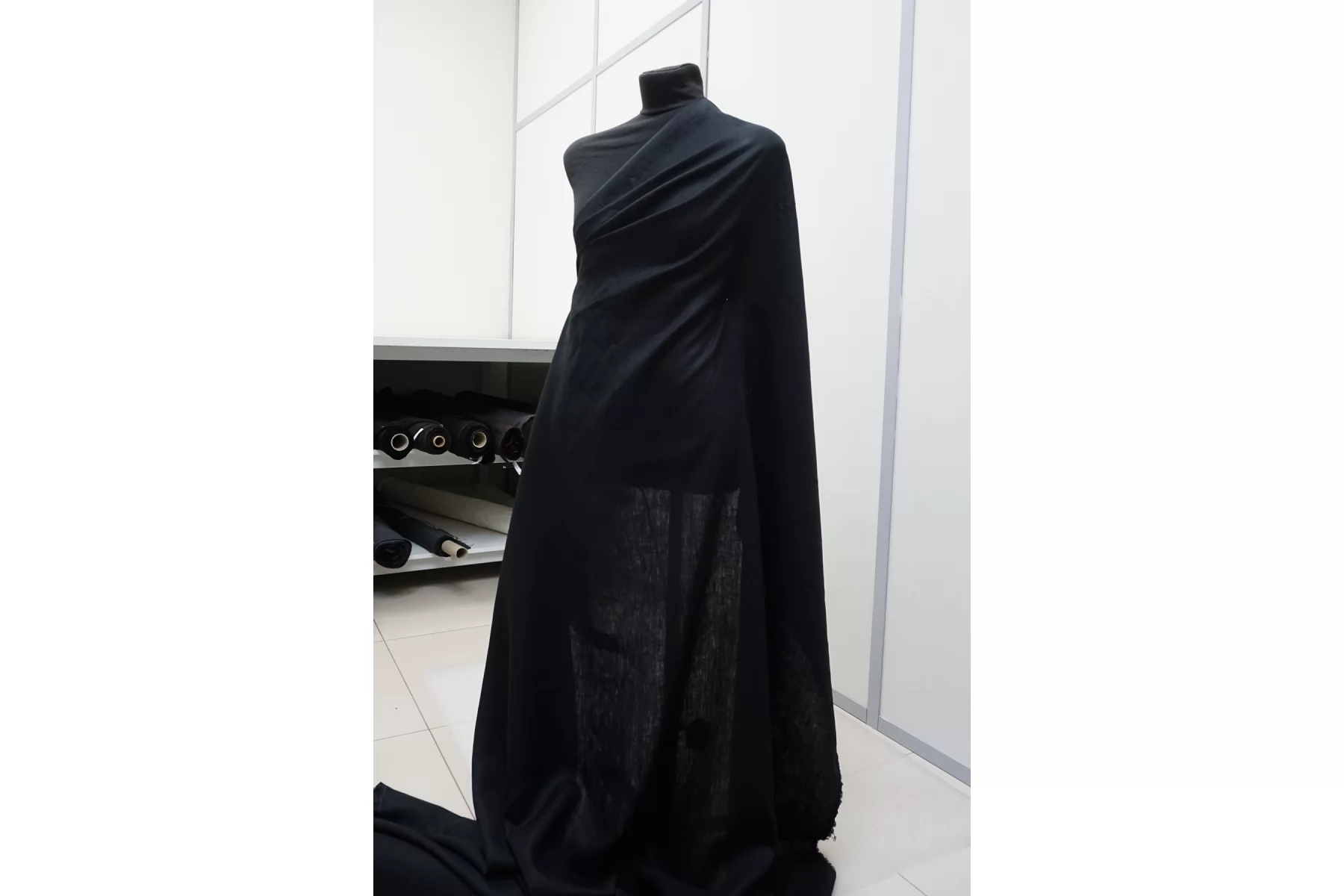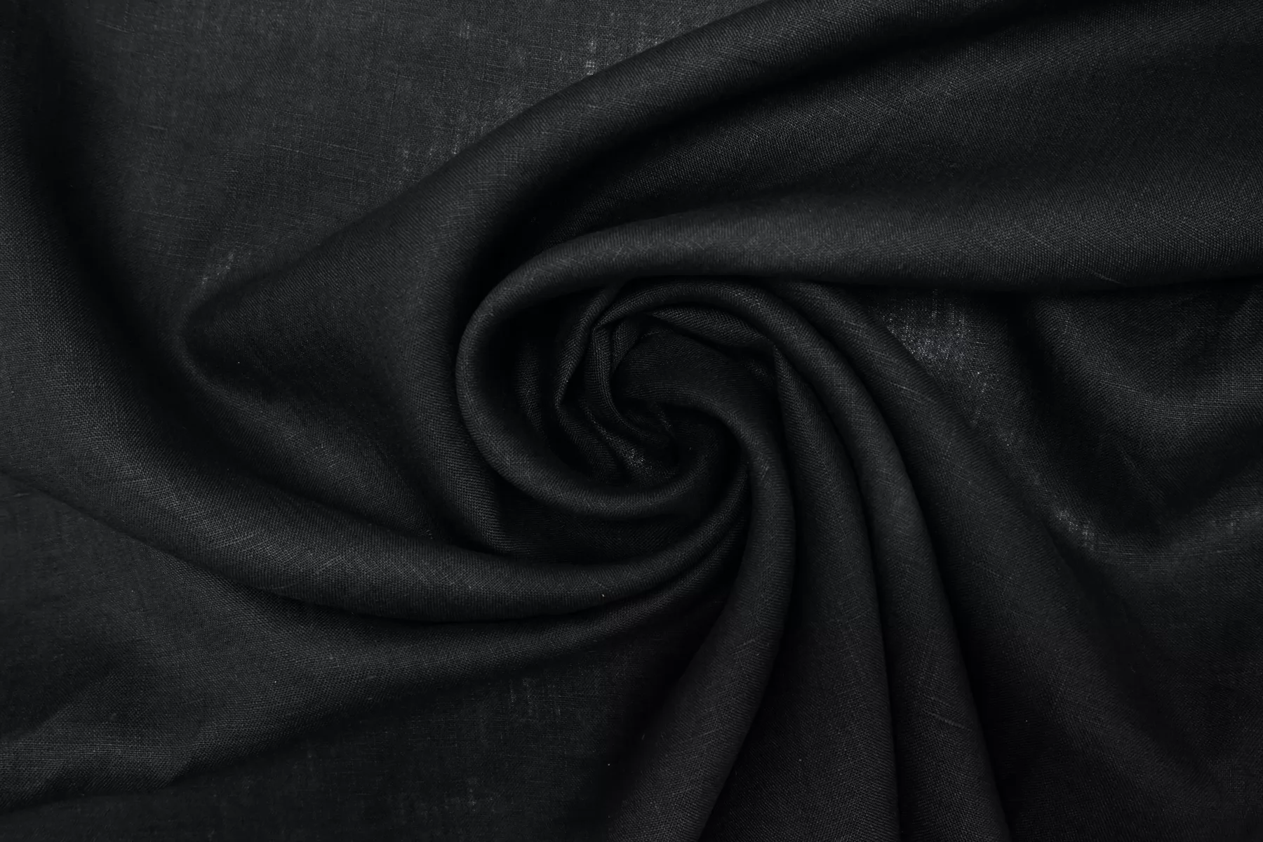 Лён плательно-рубашечной плотности, в чёрном цвете с синим подтоном. Тактильно приятный, слегка сухой. Не тянется. Просвечивает. Хорошо драпируется, форму держит умеренно. Шьем платья, юбки, рубашки верхнего слоя и не только. При необходимости используйте подкладочный материал. Обязательно учитывайте усадку 5-10%