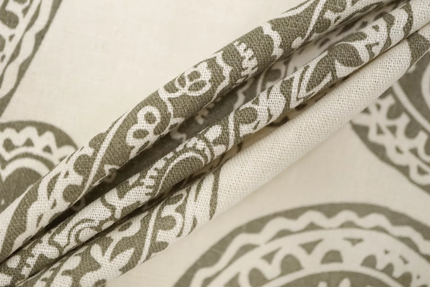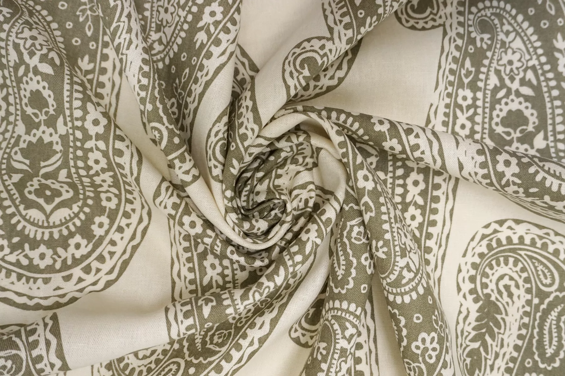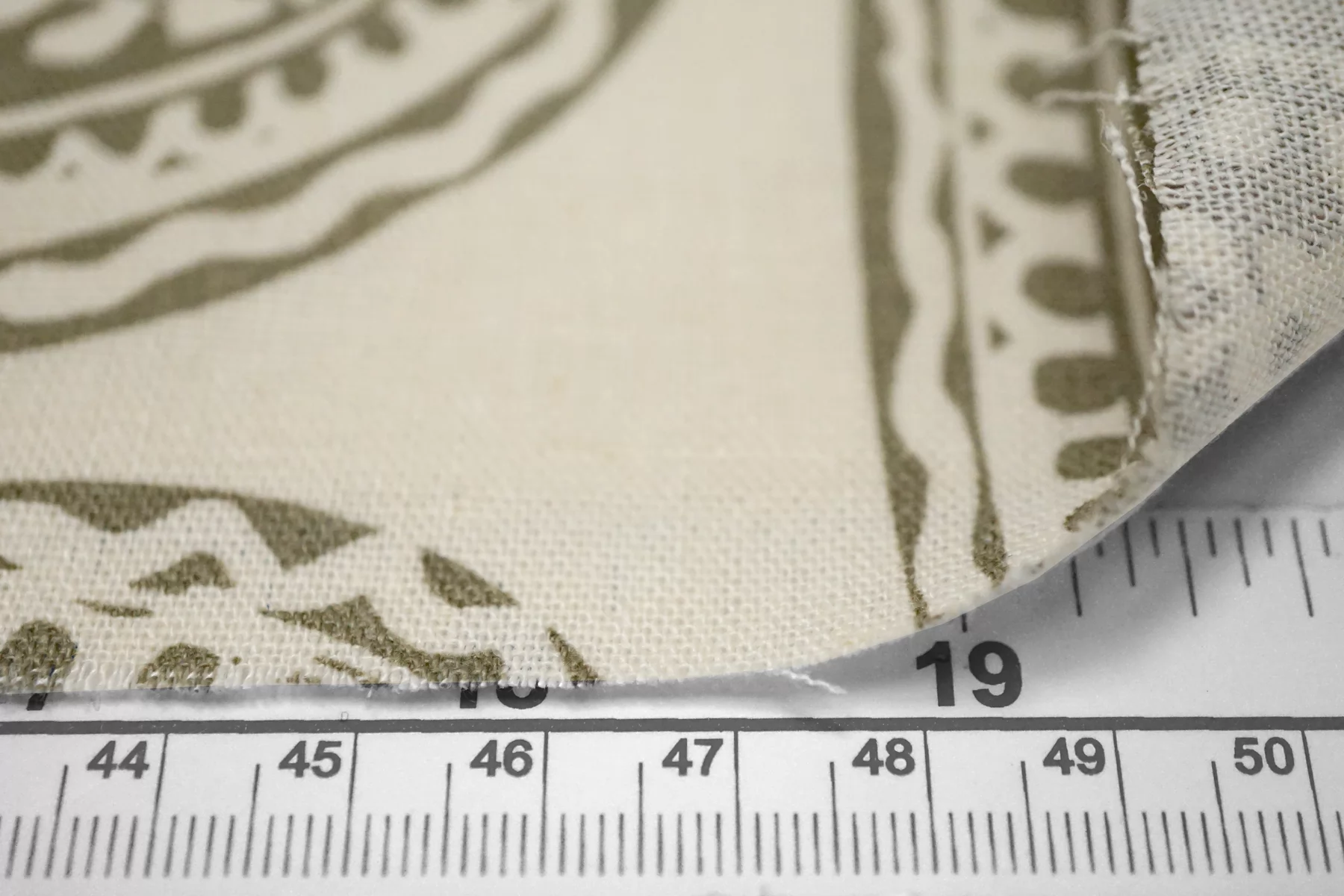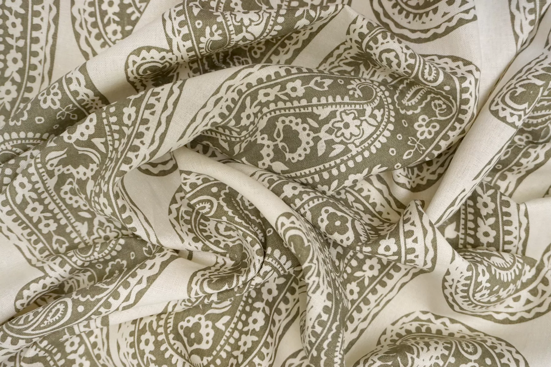 Костюмно-плательный лён с хлопком с орнаментальным зелёным принтом на молочном фоне. Не тянется, слегка просвечивает. Материал немного умягчен, приятный тактильно. Держит форму умеренно, пластичный. Отличный вариант для летнего изделия - платья, юбки, летнего костюма, сарафана, кимоно, рубашки.
