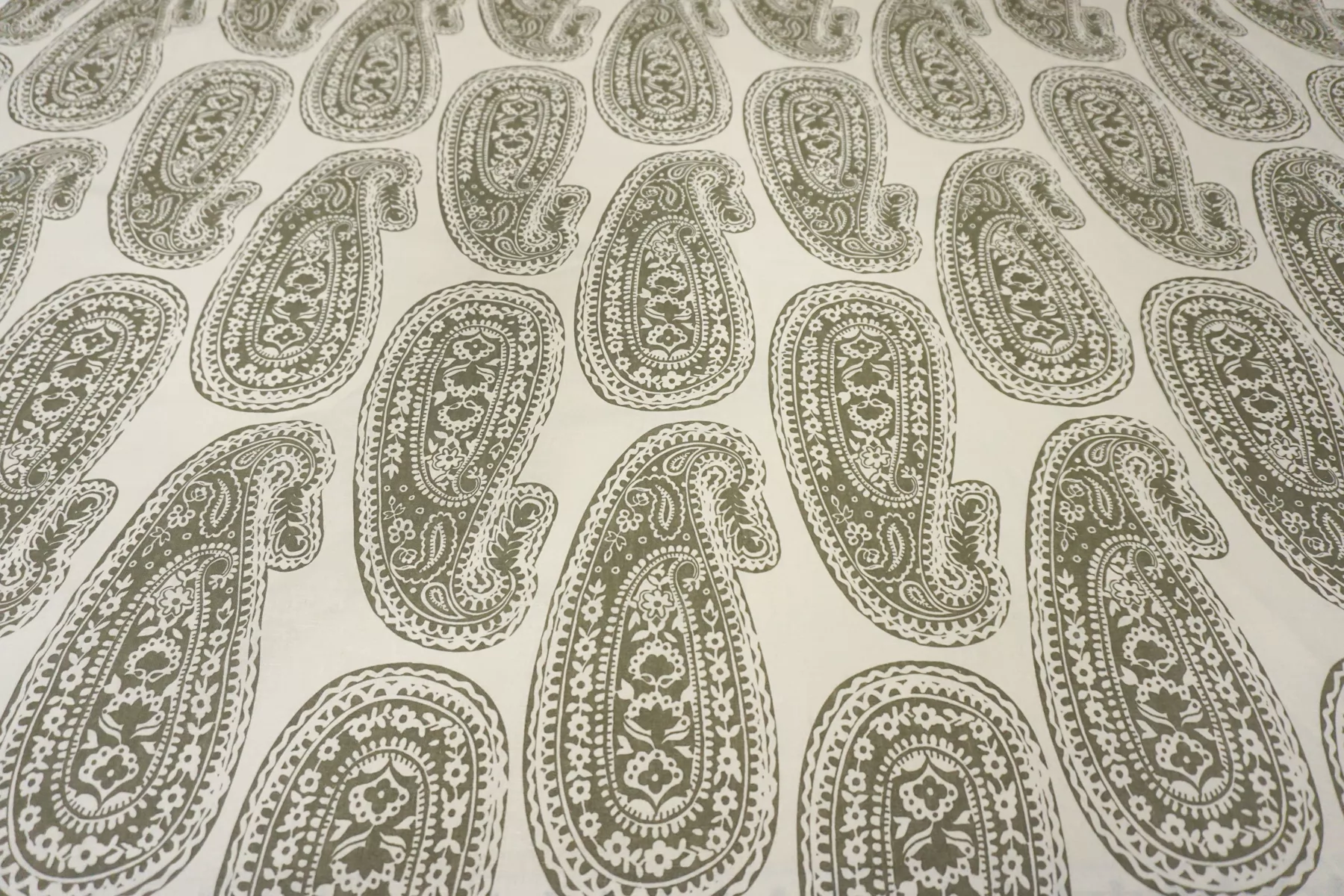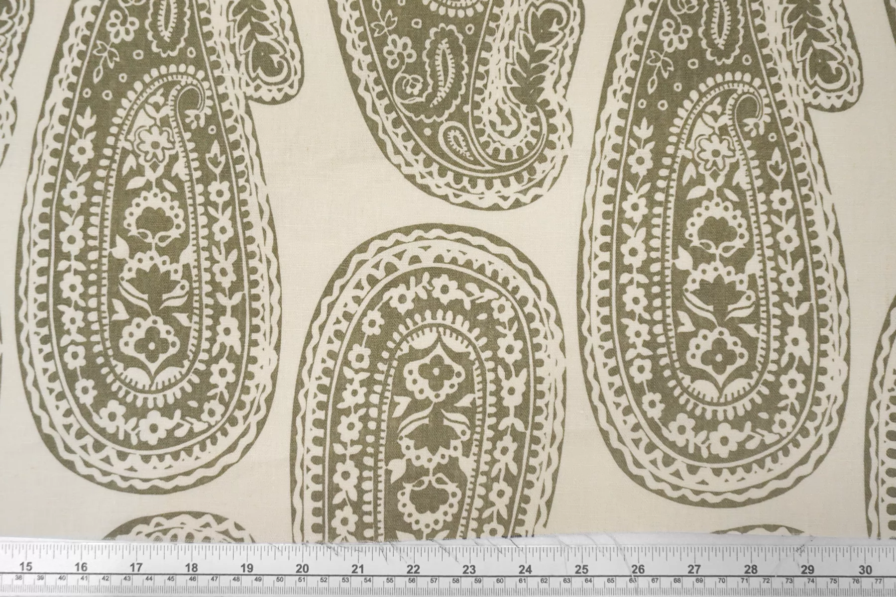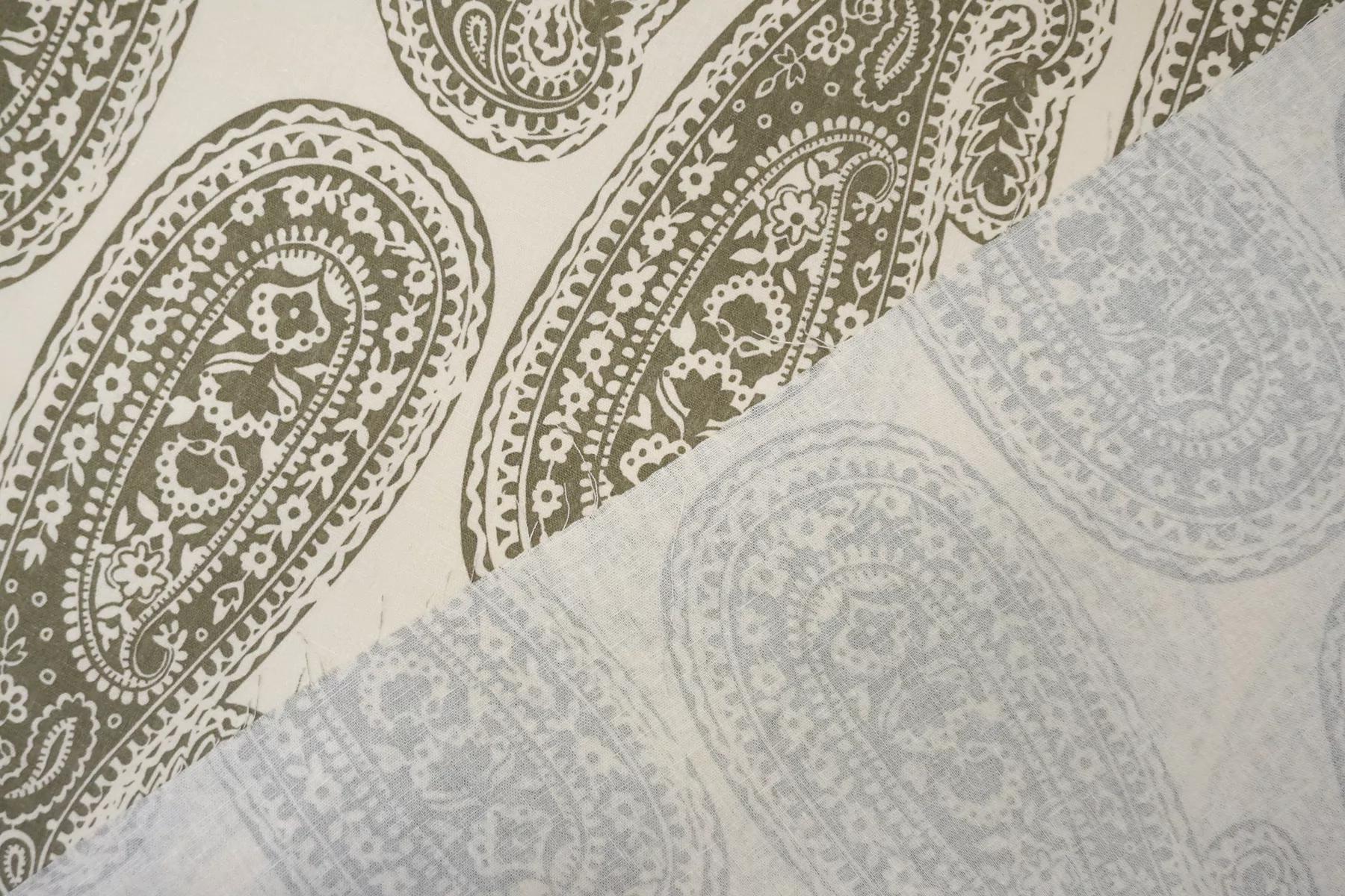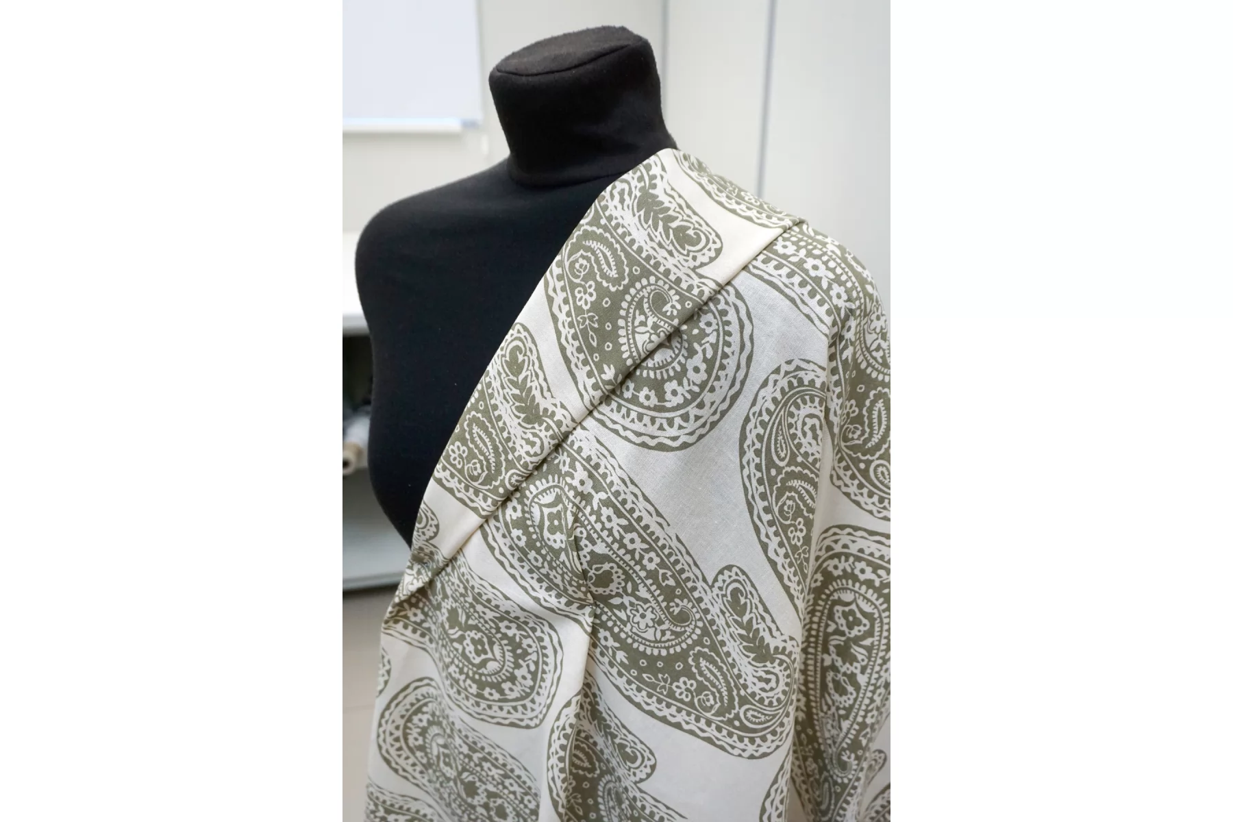 Костюмно-плательный лён с хлопком с орнаментальным зелёным принтом на молочном фоне. Не тянется, слегка просвечивает. Материал немного умягчен, приятный тактильно. Держит форму умеренно, пластичный. Отличный вариант для летнего изделия - платья, юбки, летнего костюма, сарафана, кимоно, рубашки.