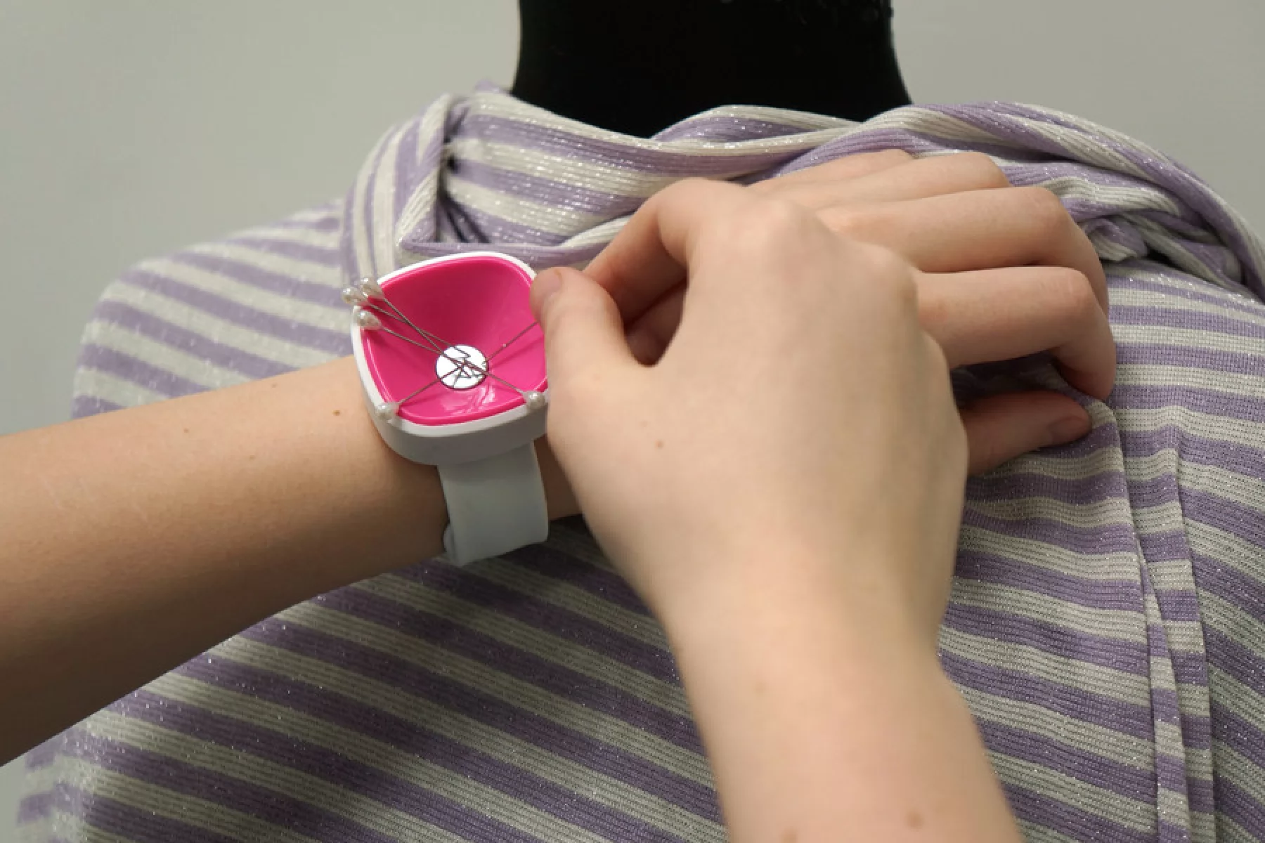 Магнитная игольница на запястье "Hemline" изготовлена из пластика и силикона. Изделие крепко удерживает иглы и булавки благодаря специальному магниту. Обладает легким весом, проста и интересна в использовании. Надевается на запястье, ремешок подходит на разную ширину. У браслета универсальный размер и гибкий ремешок, поэтому легко надевается и снимается. В комплекте предусмотрено 6 портновских булавок.