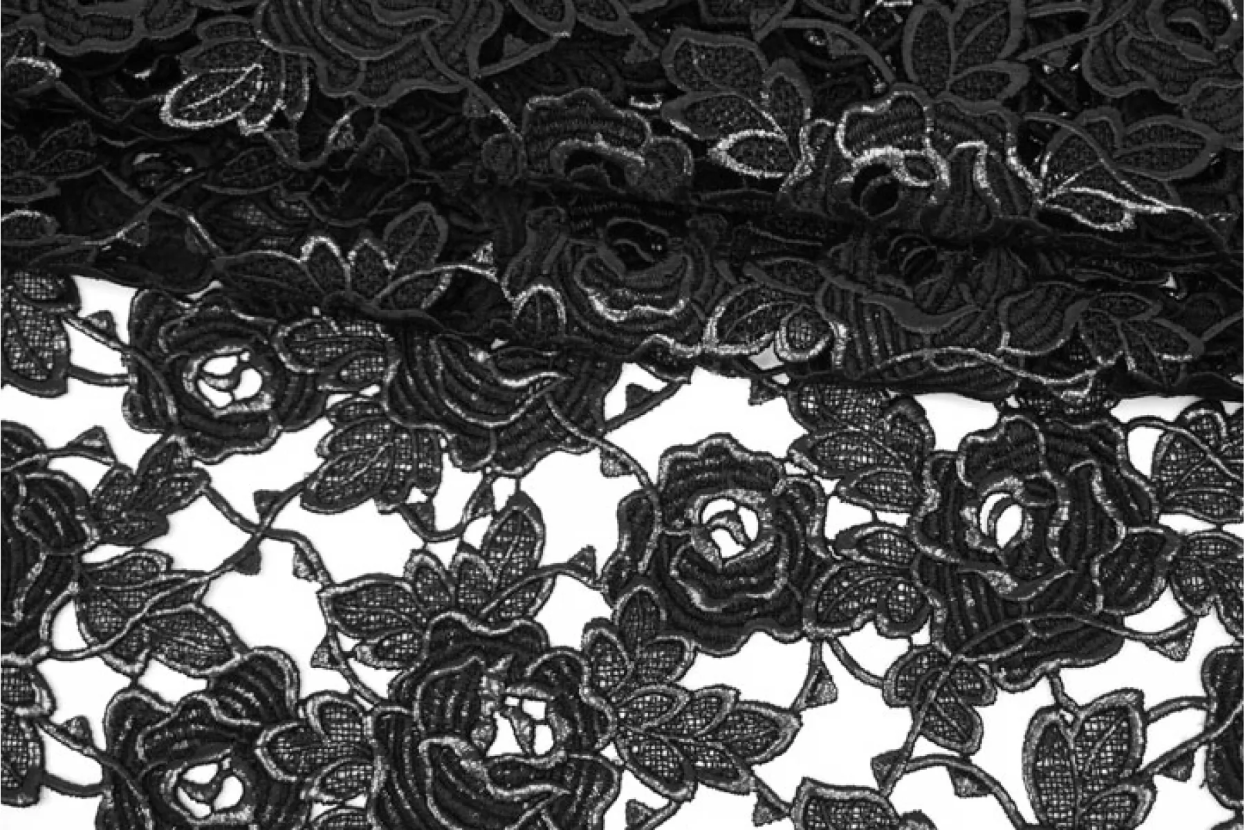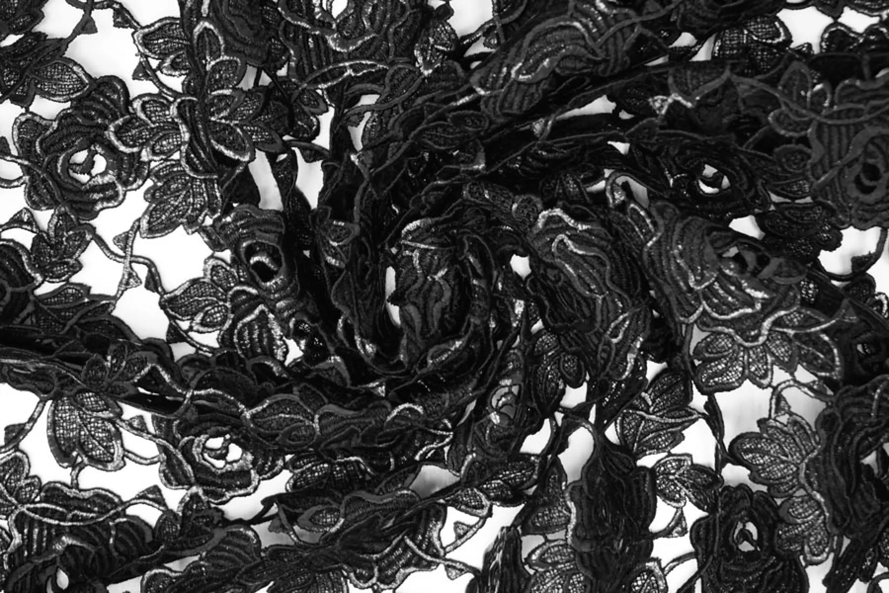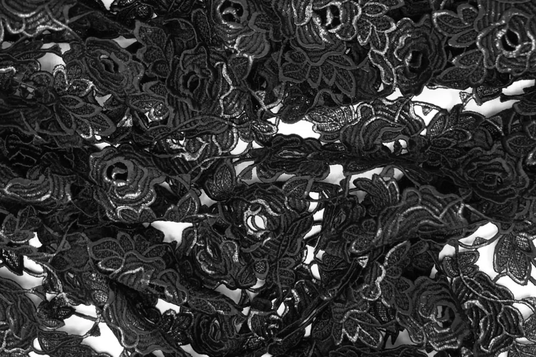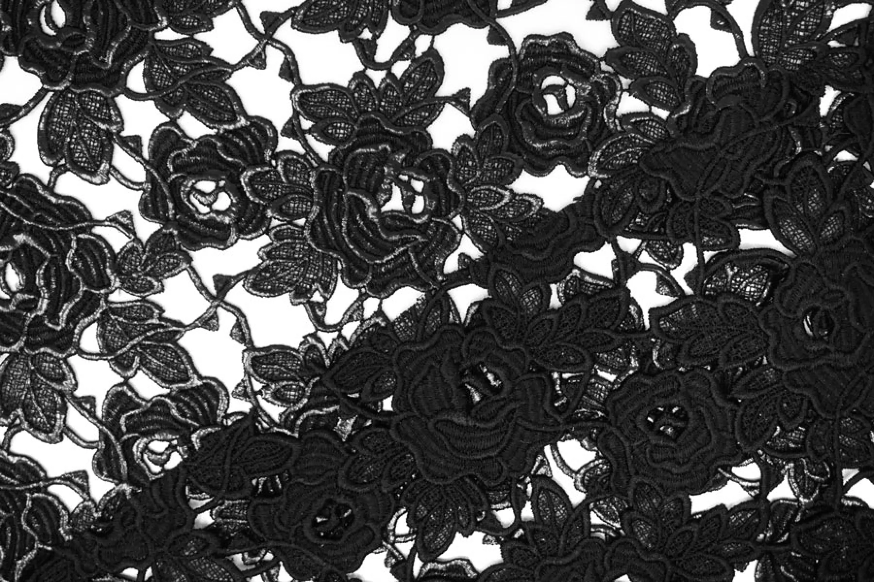Очень интересное хлопковое макраме от Redemtion черного цвета с накатом с цветочным узором среднего размера. Материал жестковатый на ощупь, накат гладкий. Материал немного пластичный. Немного держит форму. Имеет приятный блеск благодаря накату. Не тянется. Хорошо подойдет на нарядные варианты одежды, декорирования или отделки как одежды, так и аксессуаров.