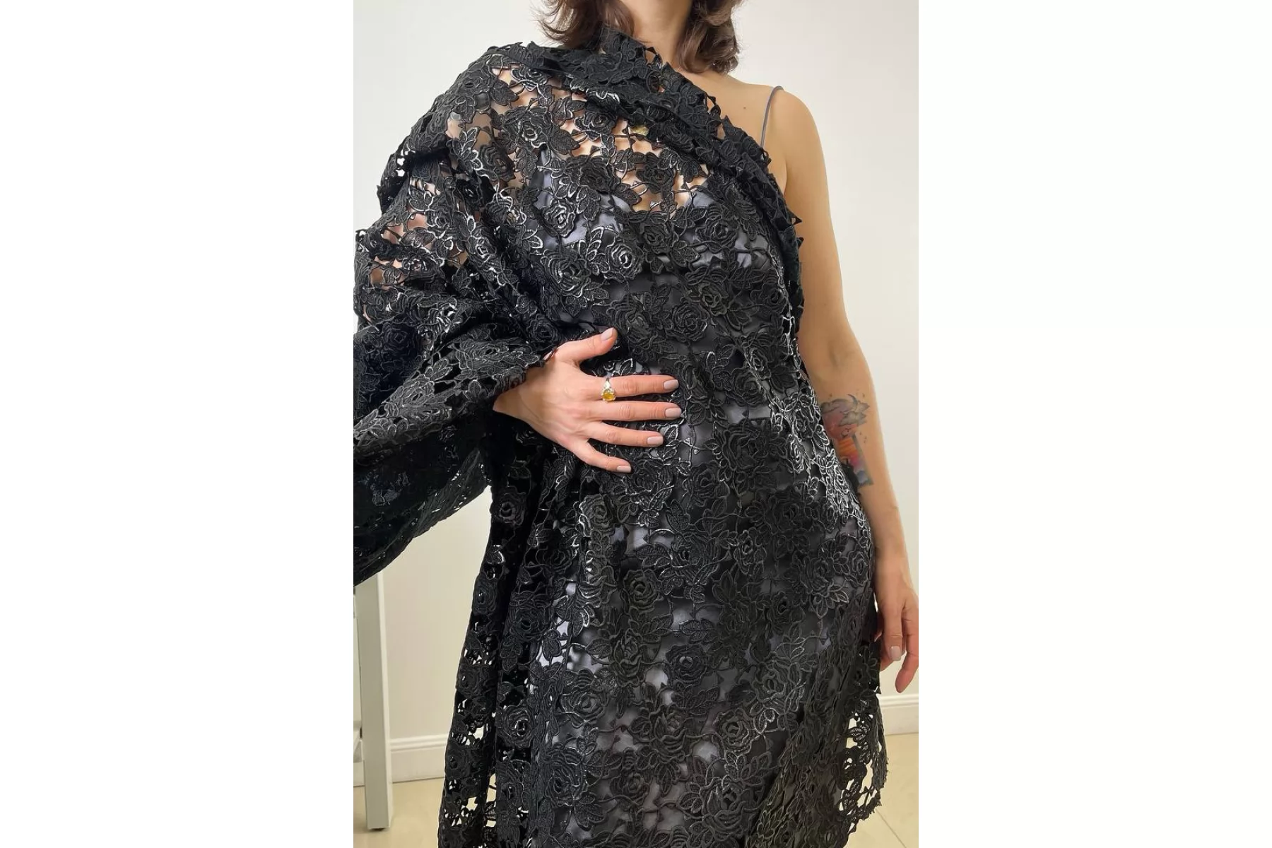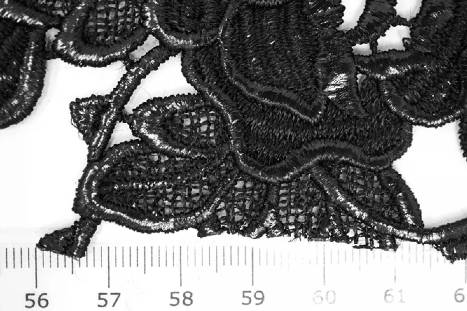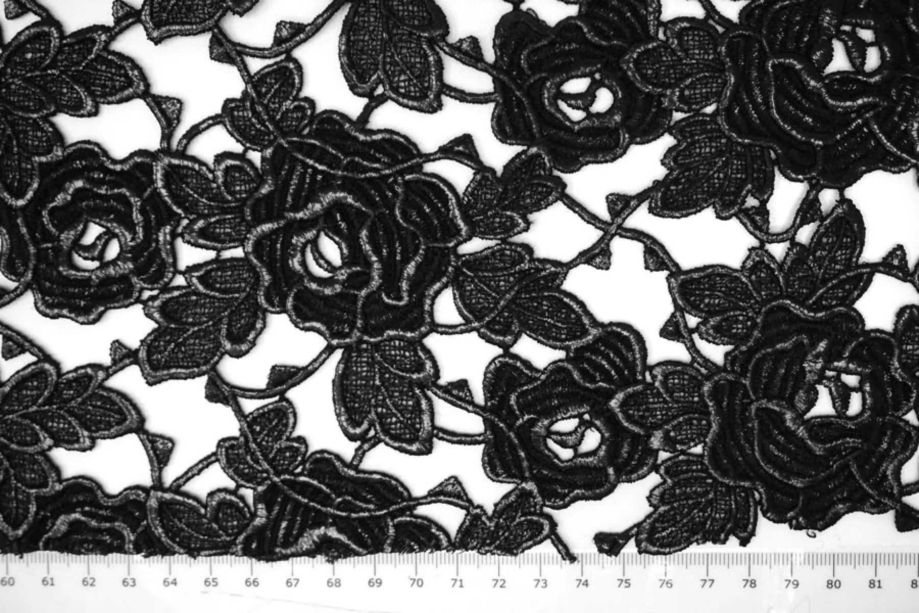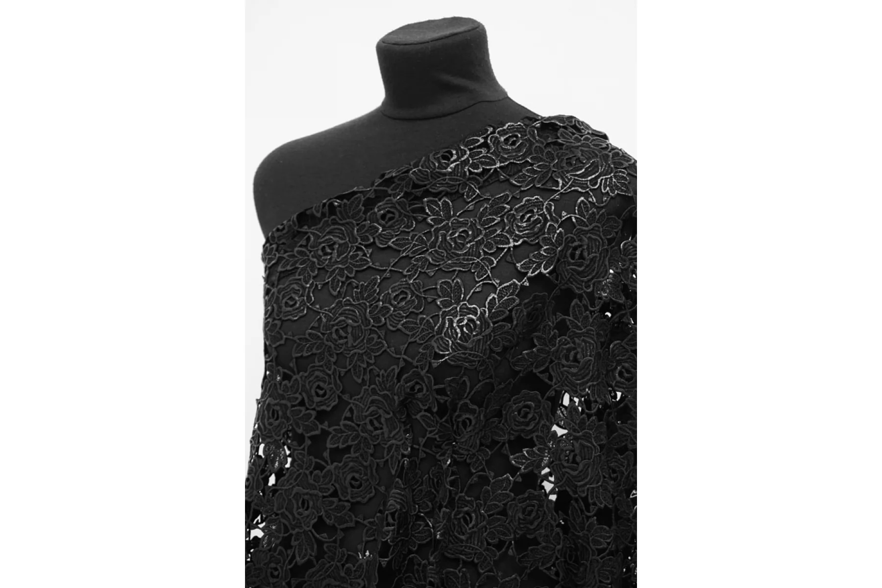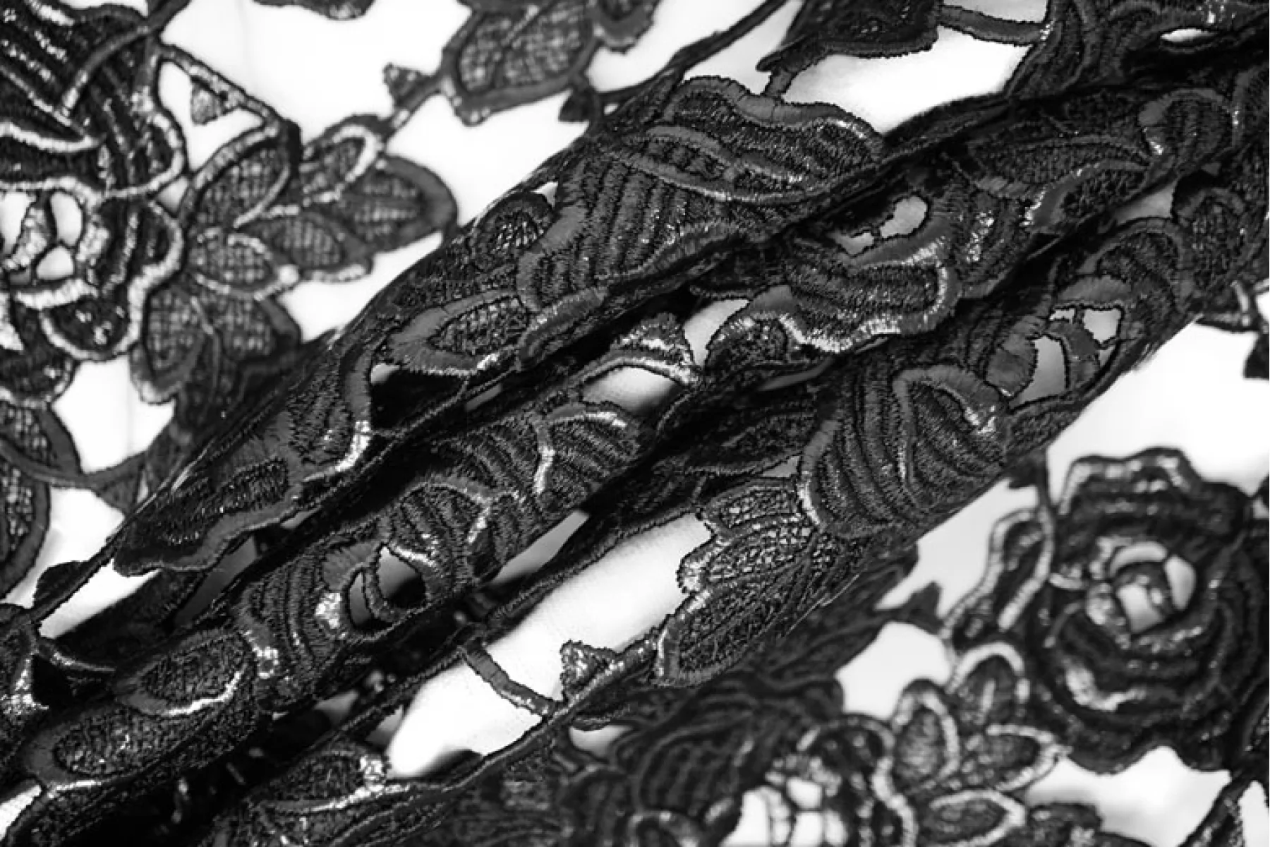 Очень интересное хлопковое макраме от Redemtion черного цвета с накатом с цветочным узором среднего размера. Материал жестковатый на ощупь, накат гладкий. Материал немного пластичный. Немного держит форму. Имеет приятный блеск благодаря накату. Не тянется. Хорошо подойдет на нарядные варианты одежды, декорирования или отделки как одежды, так и аксессуаров.