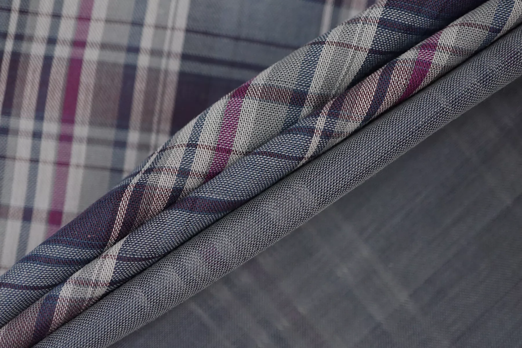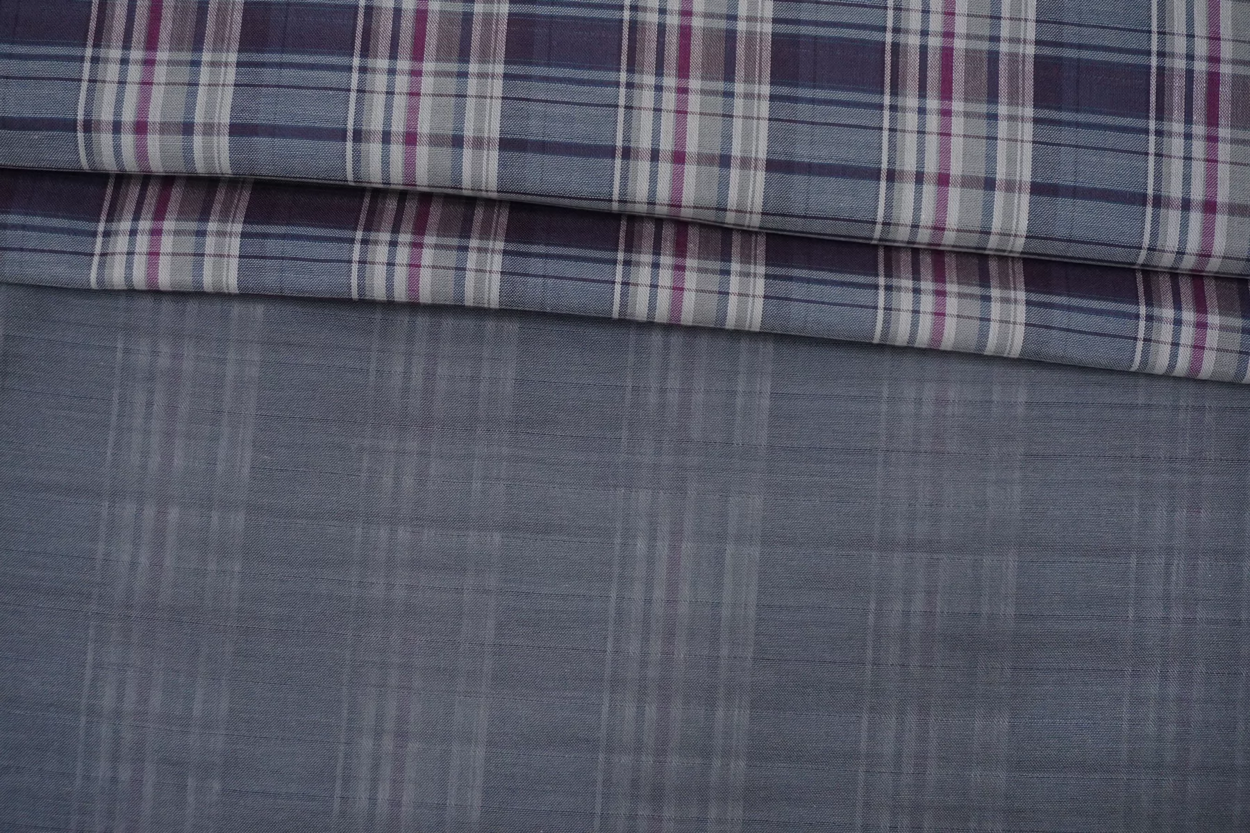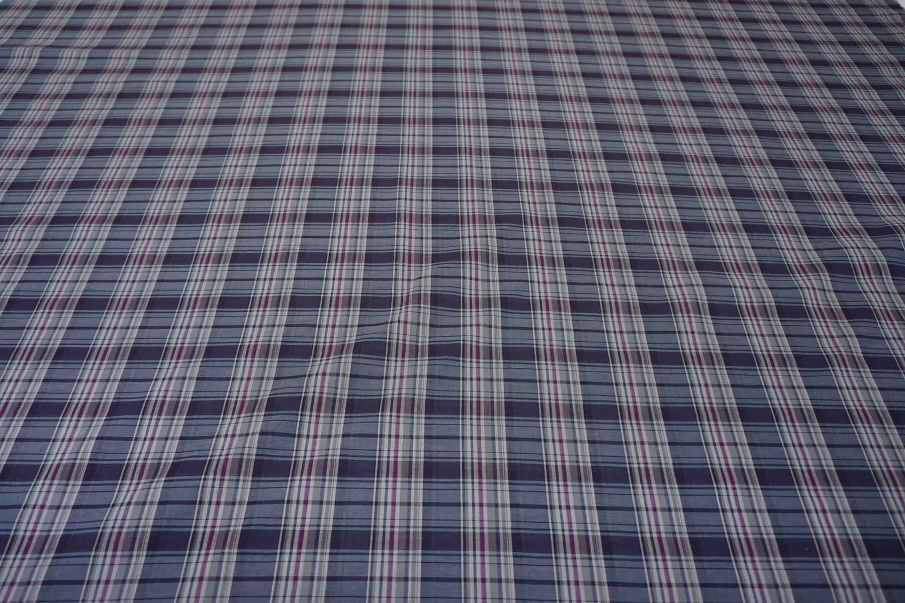 Двухслойная марлевка из хлопка, с узором-клеткой из нитей синего, белого, серого и фиолетового цвета. Слои повреждаются при разделении. Оборотная сторона серая. Материал мягкий и приятный наощупь. Просвечивает средне, пластичный, легкий. Подойдет для пошива рубашки, туники, платья, юбки (на подкладе или многослойной).