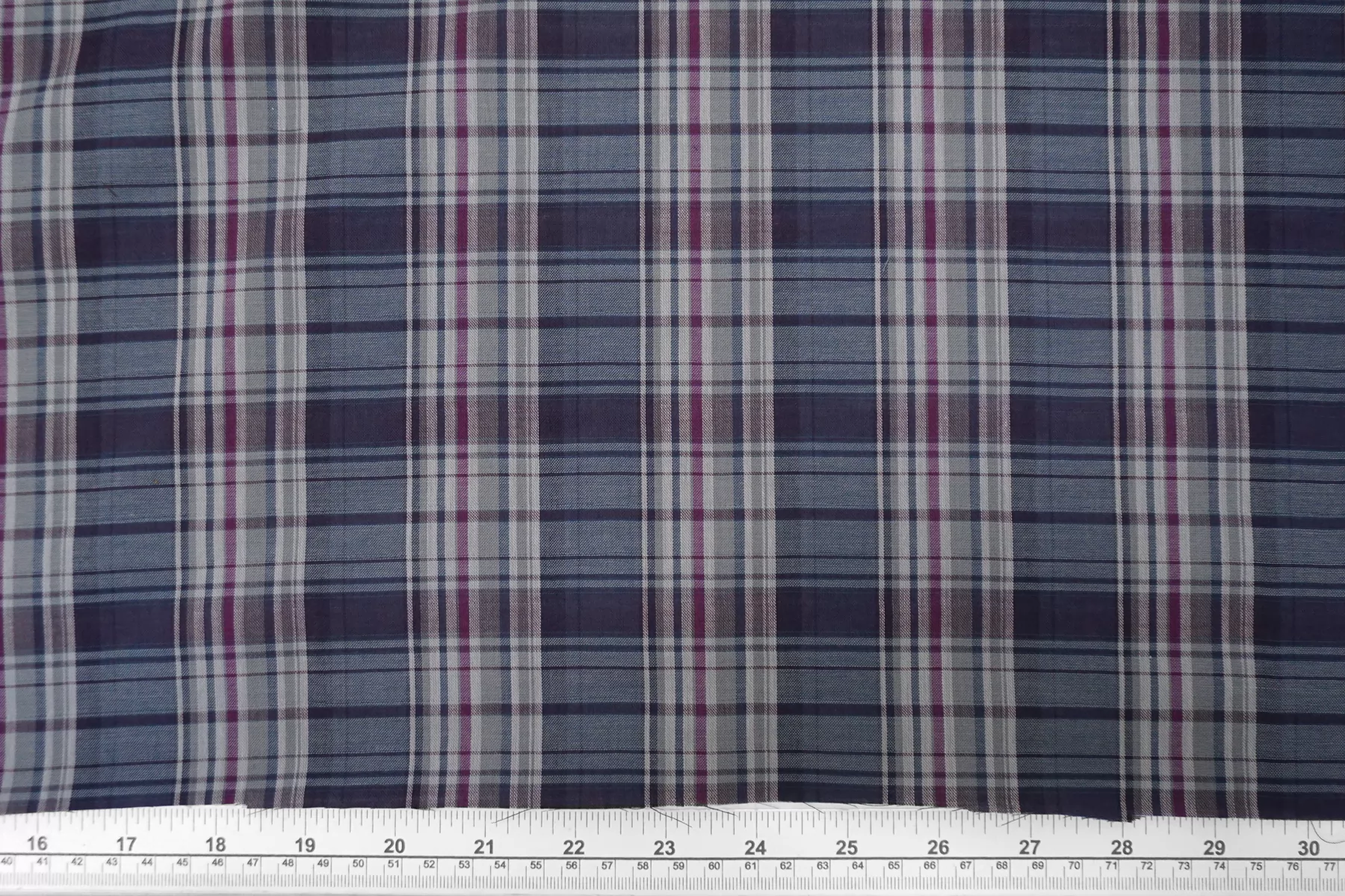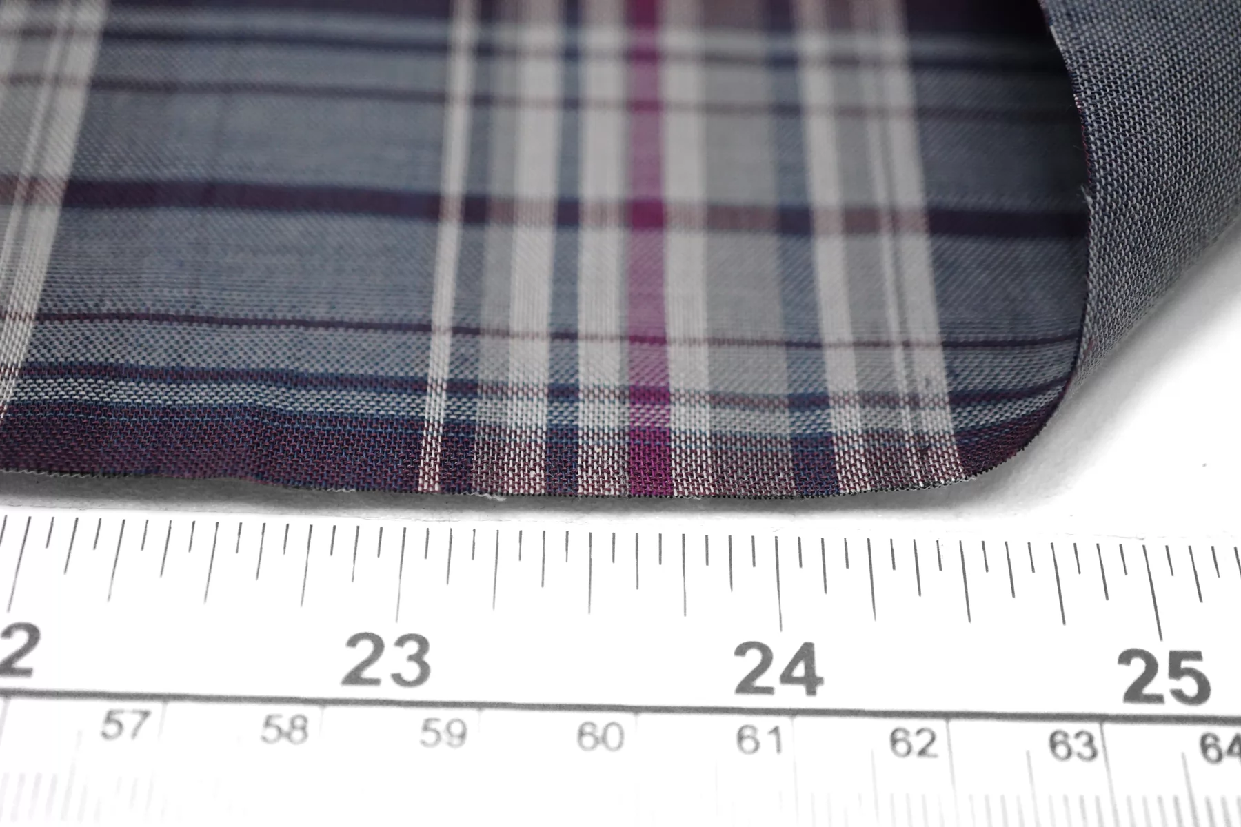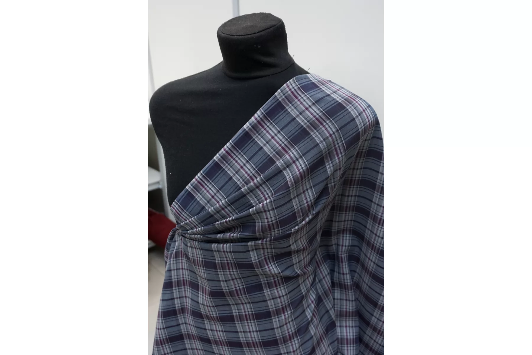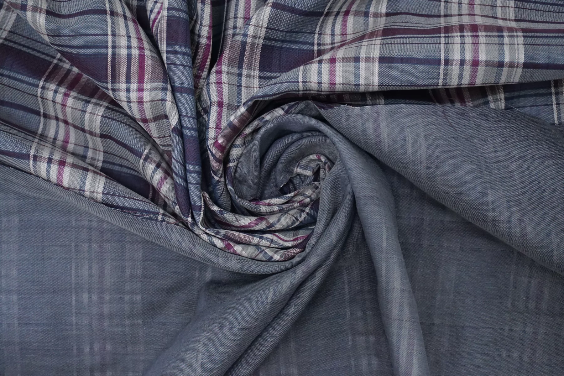 Двухслойная марлевка из хлопка, с узором-клеткой из нитей синего, белого, серого и фиолетового цвета. Слои повреждаются при разделении. Оборотная сторона серая. Материал мягкий и приятный наощупь. Просвечивает средне, пластичный, легкий. Подойдет для пошива рубашки, туники, платья, юбки (на подкладе или многослойной).