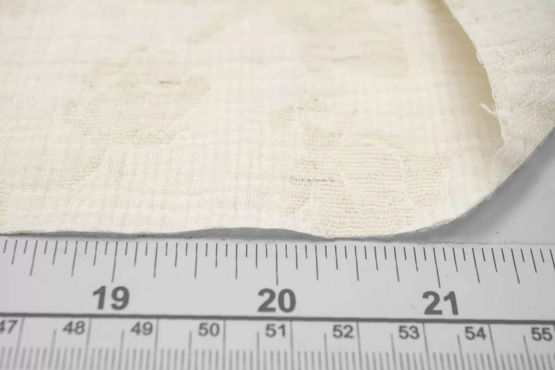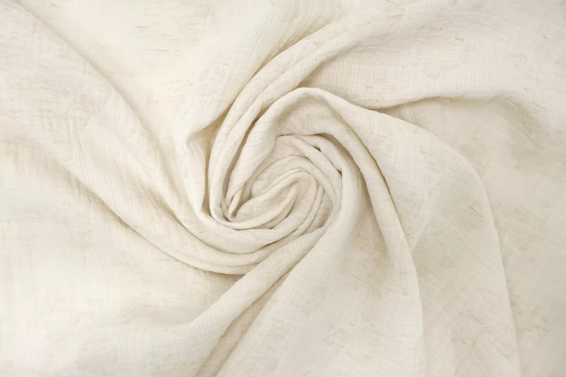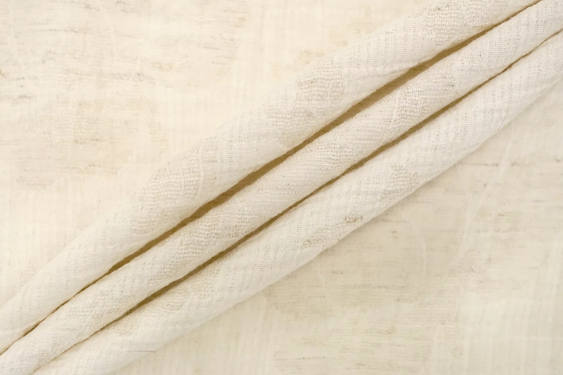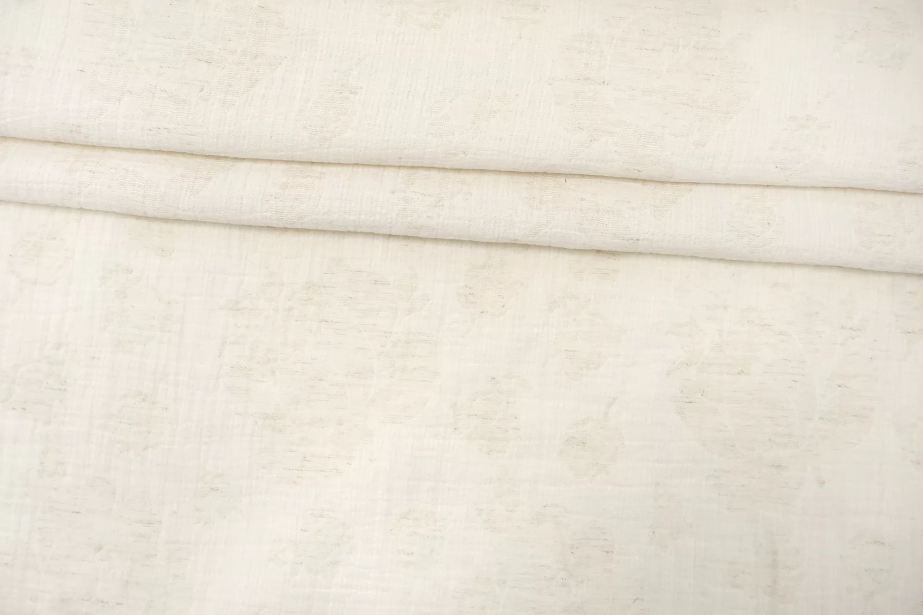 Итальянская марлевка из хлопка с небольшой добавкой льна, с жаккардовым цветочным узором. Цвет натуральный молочно-бежевый, с вкраплениями. Материал мягкий, чуть суховатый. Просвечивает, пластичный, легкий. Подойдет для пошива туники, платья, юбки (на подкладе или многослойной).