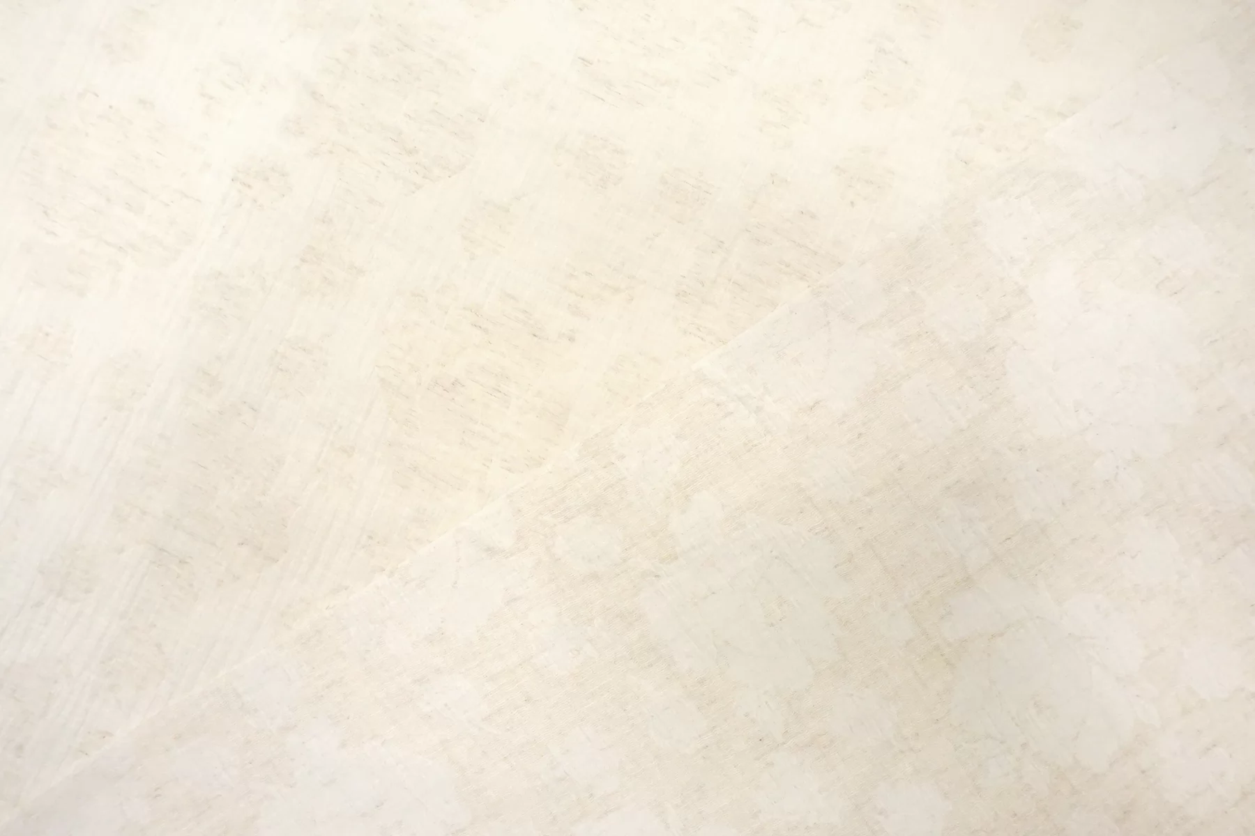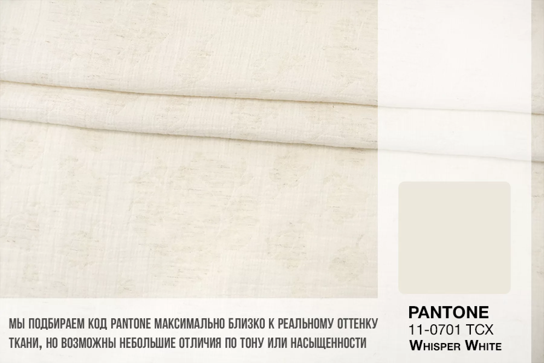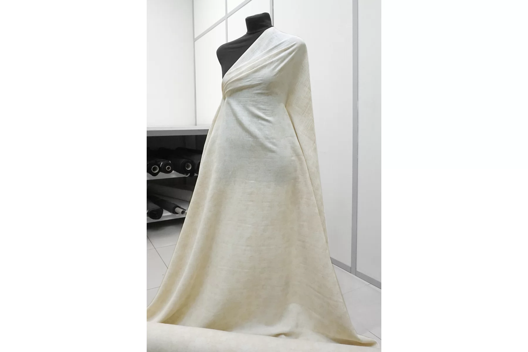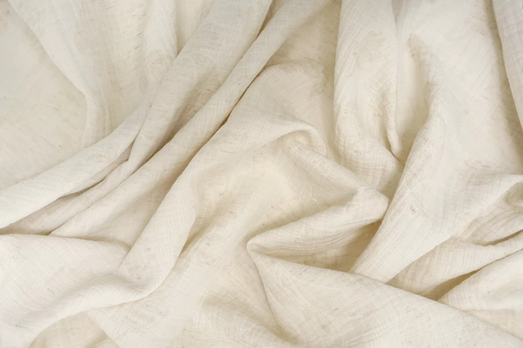 Итальянская марлевка из хлопка с небольшой добавкой льна, с жаккардовым цветочным узором. Цвет натуральный молочно-бежевый, с вкраплениями. Материал мягкий, чуть суховатый. Просвечивает, пластичный, легкий. Подойдет для пошива туники, платья, юбки (на подкладе или многослойной).