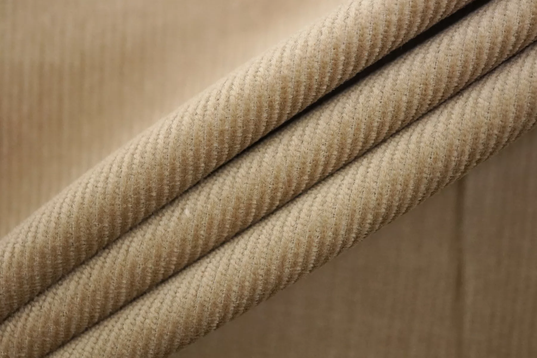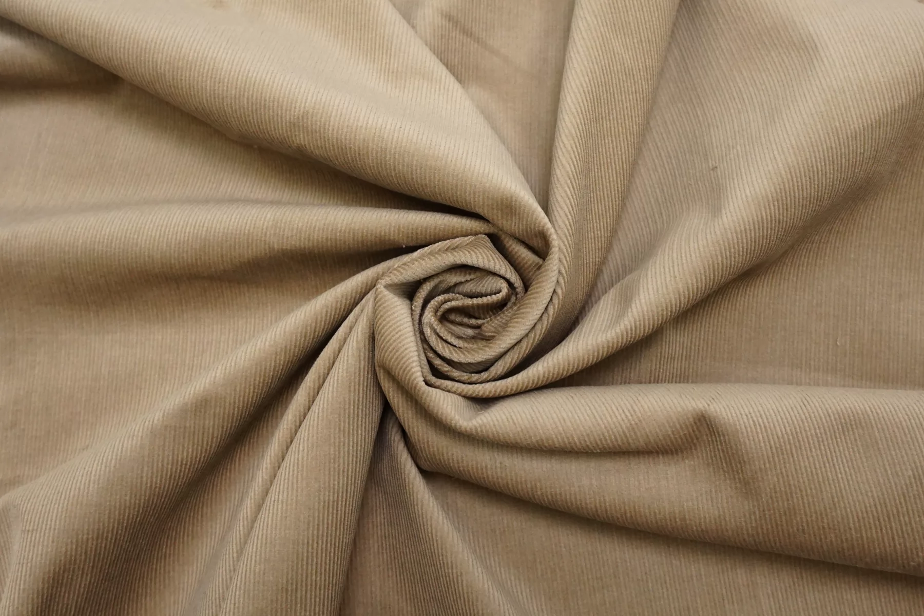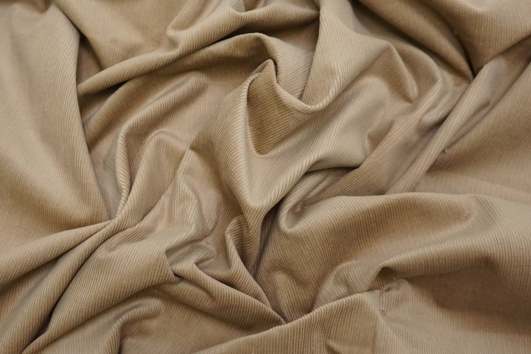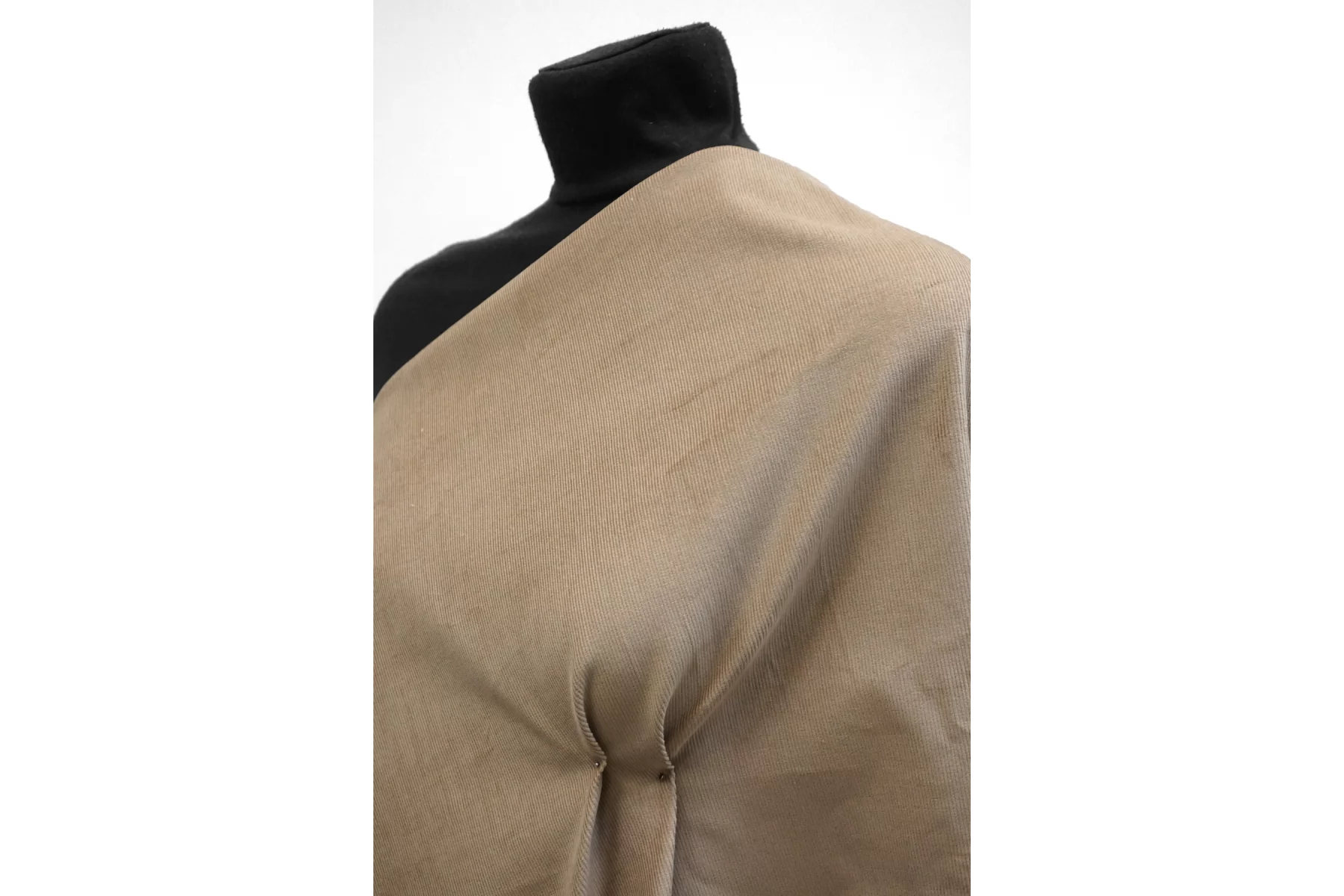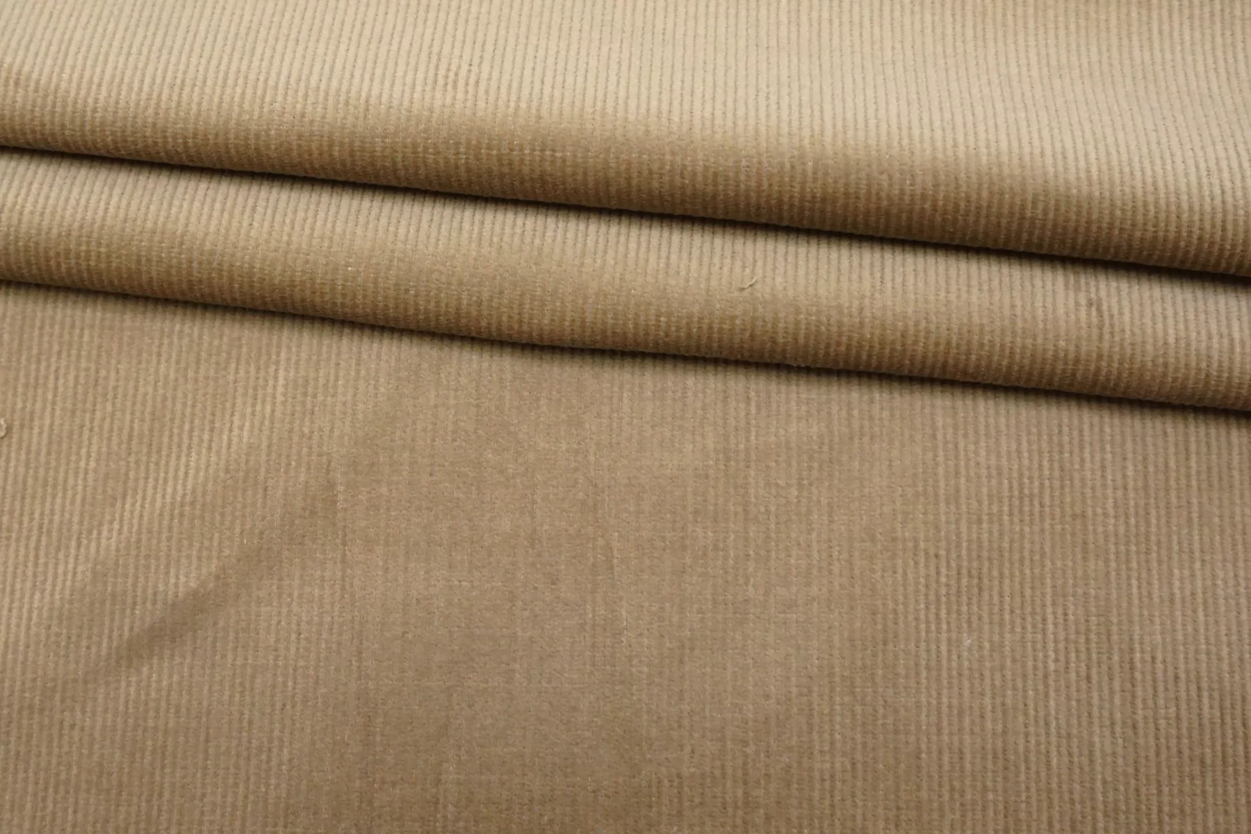 Шикарный костюмно-плательный микровельвет в серо-бежевом цвете. Ширина рубчиков 1,5 мм. Материал плотный, но тонкий. Приятный и мягкий тактильно, тянется. Пластичный. Практически не мнется. Хорошо драпируется и неплохо держит форму. Отличный вариант для пошива костюма, шорт, юбки, мягкого жакета, рубашки. Кроить в одном направлении.