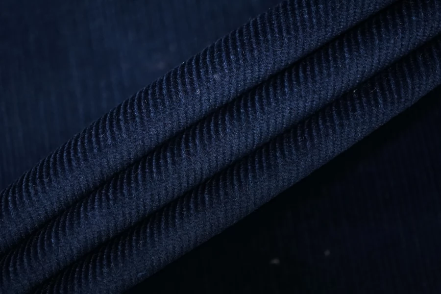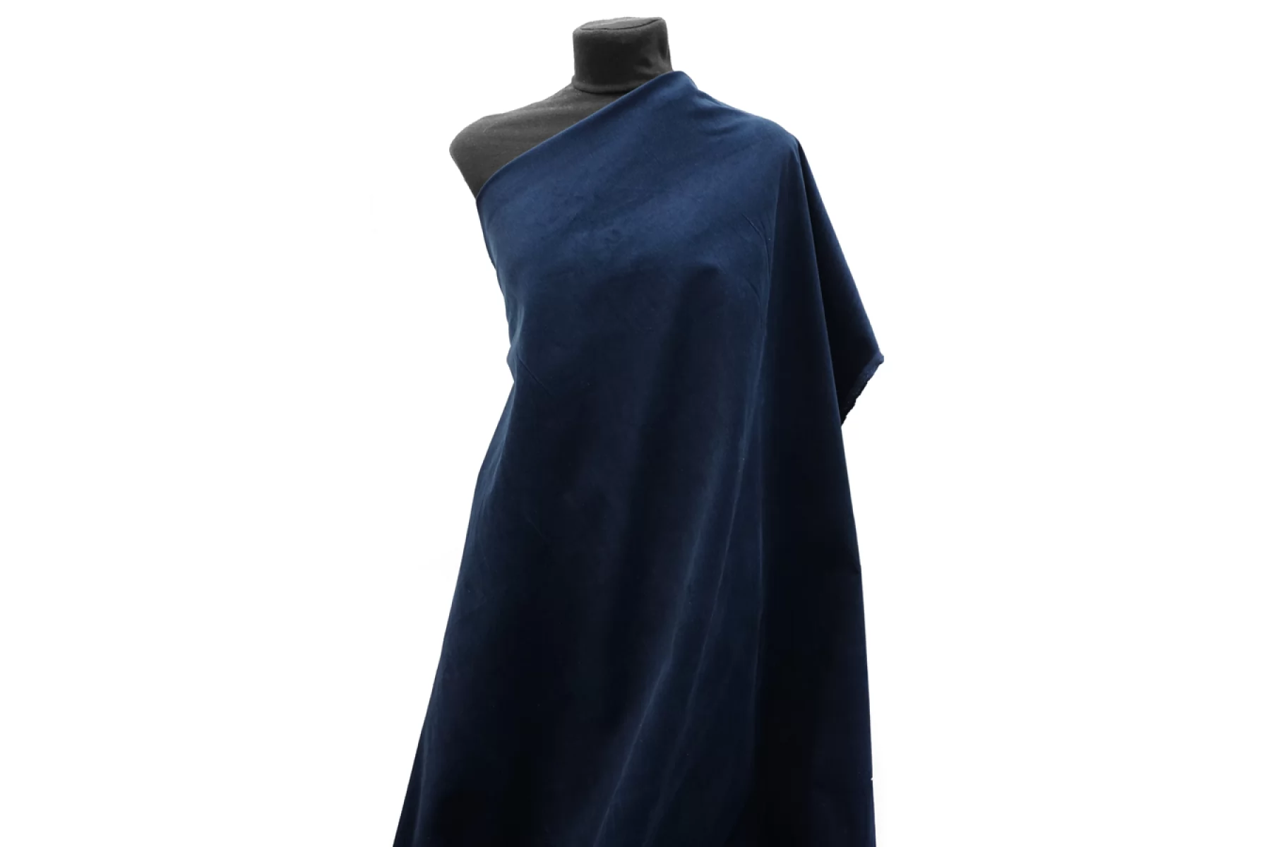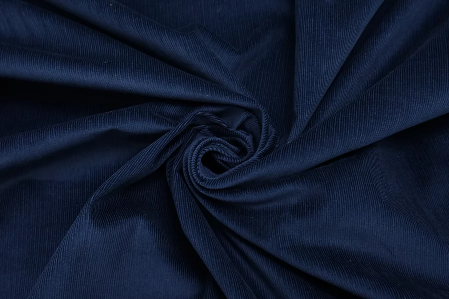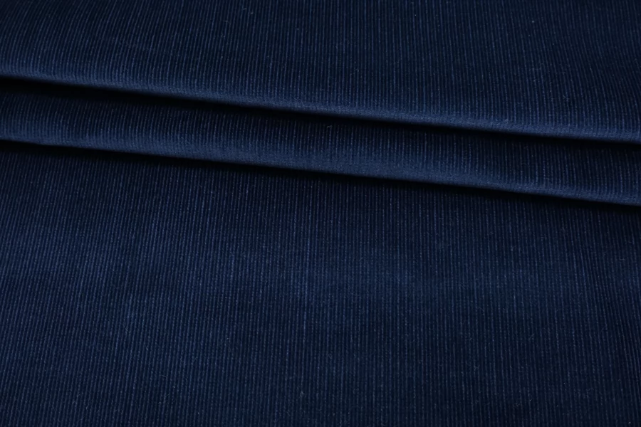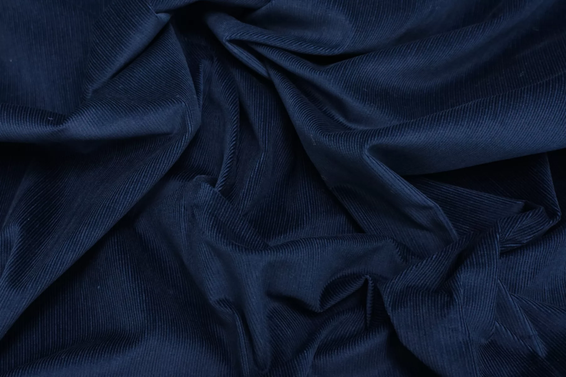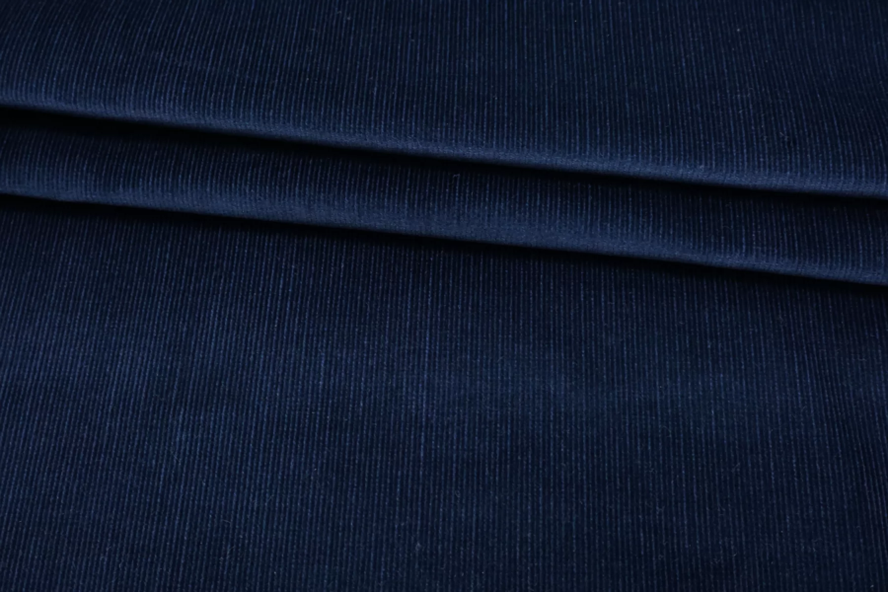 Внимание! Под определённым углом видны белёсые полосы см. фото. Шикарный костюмно-плательный микровельвет в красивом, глубоком тёмно-синем цвете. Ширина рубчиков 1,5 мм. Материал плотный, но тонкий. Приятный и мягкий тактильно, тянется. Пластичный. Практически не мнется. Хорошо драпируется и неплохо держит форму. Отличный вариант для пошива костюма, шорт, юбки, мягкого жакета, рубашки. Кроить в одном направлении.