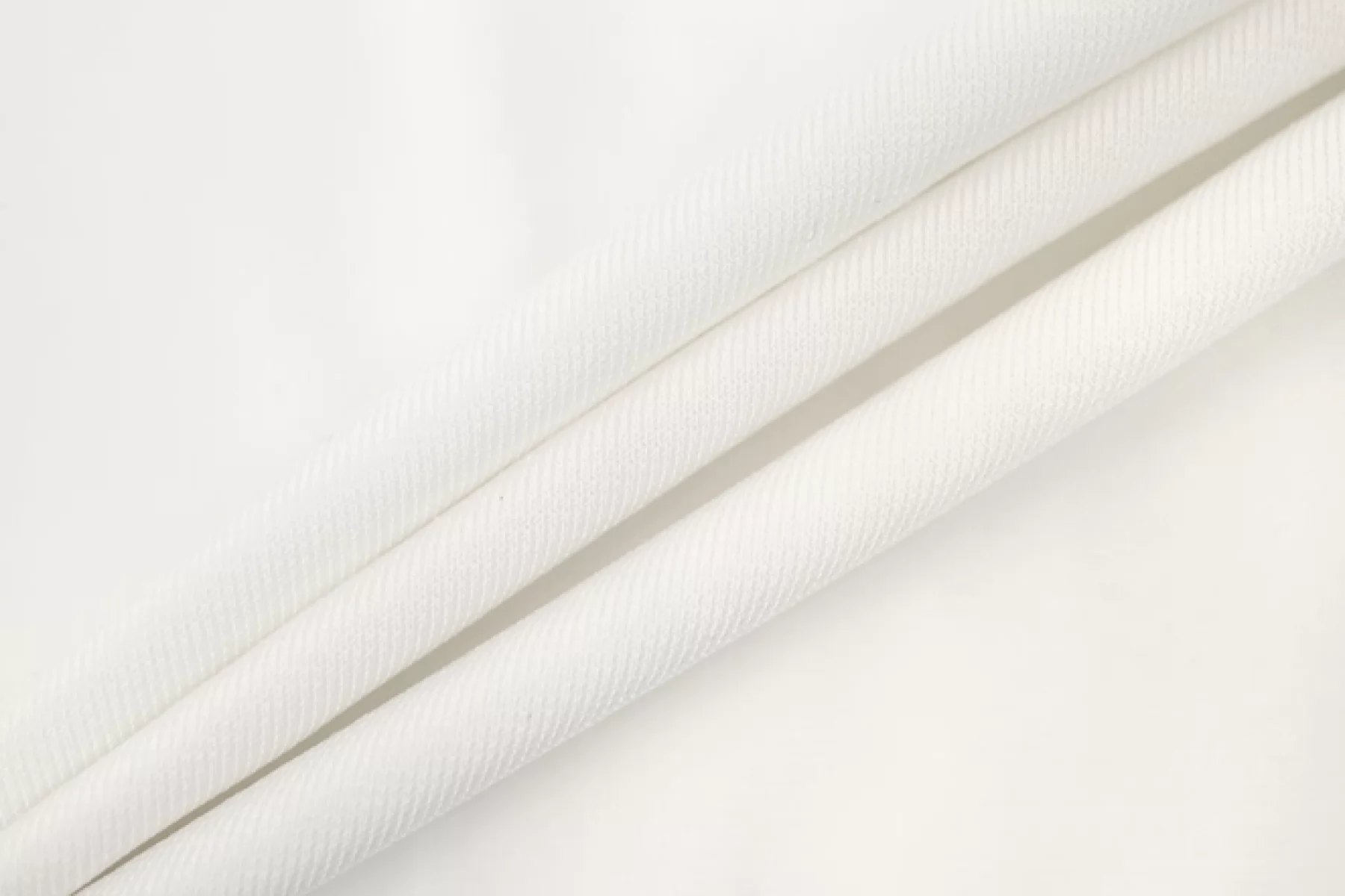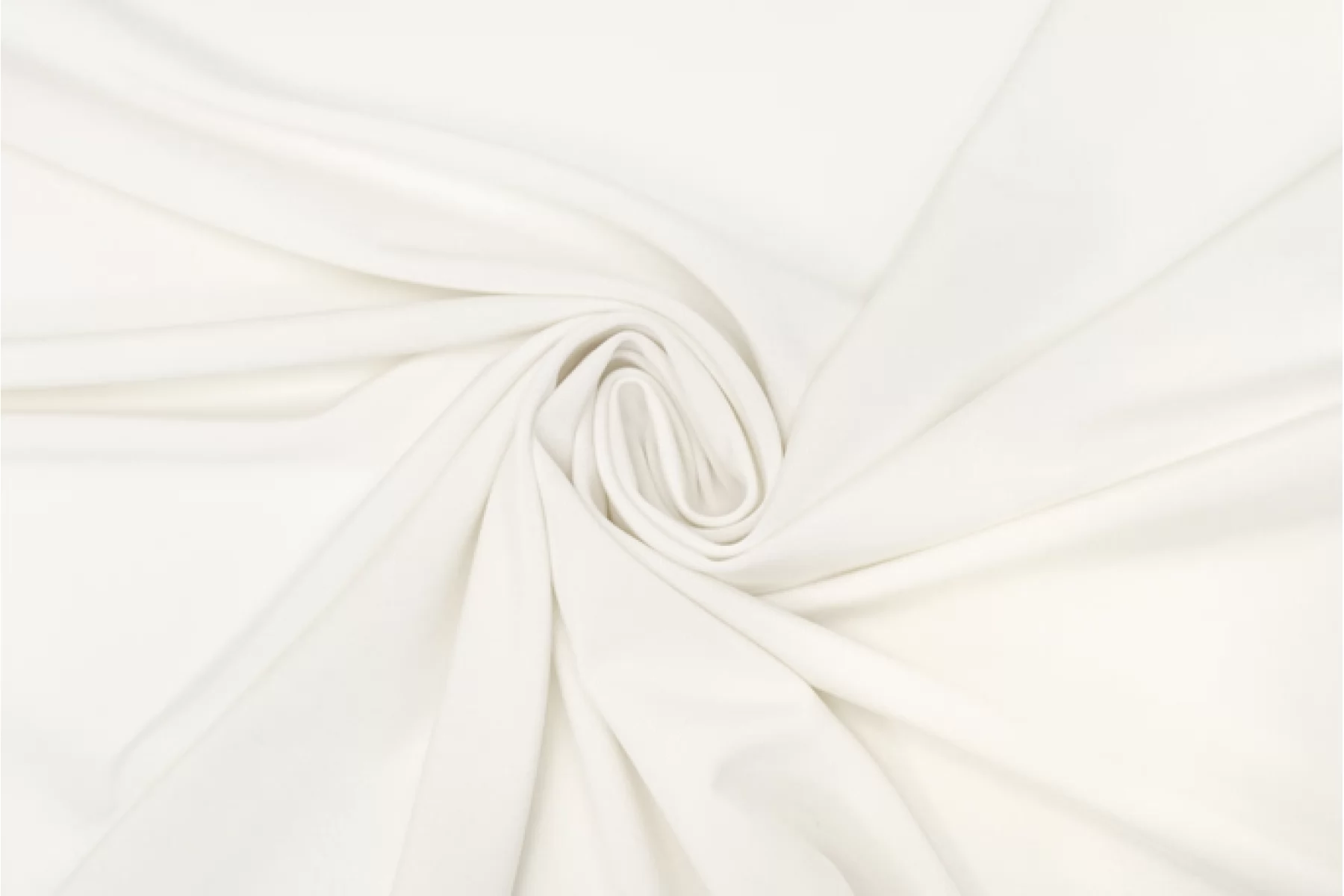 Трикотаж из вискозы в молочном оттенке, кулирная гладь. Материал легкий, скользящий, тактильно чувствуется легкая шероховатость. Прекрасно тянется. Просвечивает силуэт. Хорошо держит форму и красиво драпируется. Шьем майки, топы, футболки, легкие кофты, туники