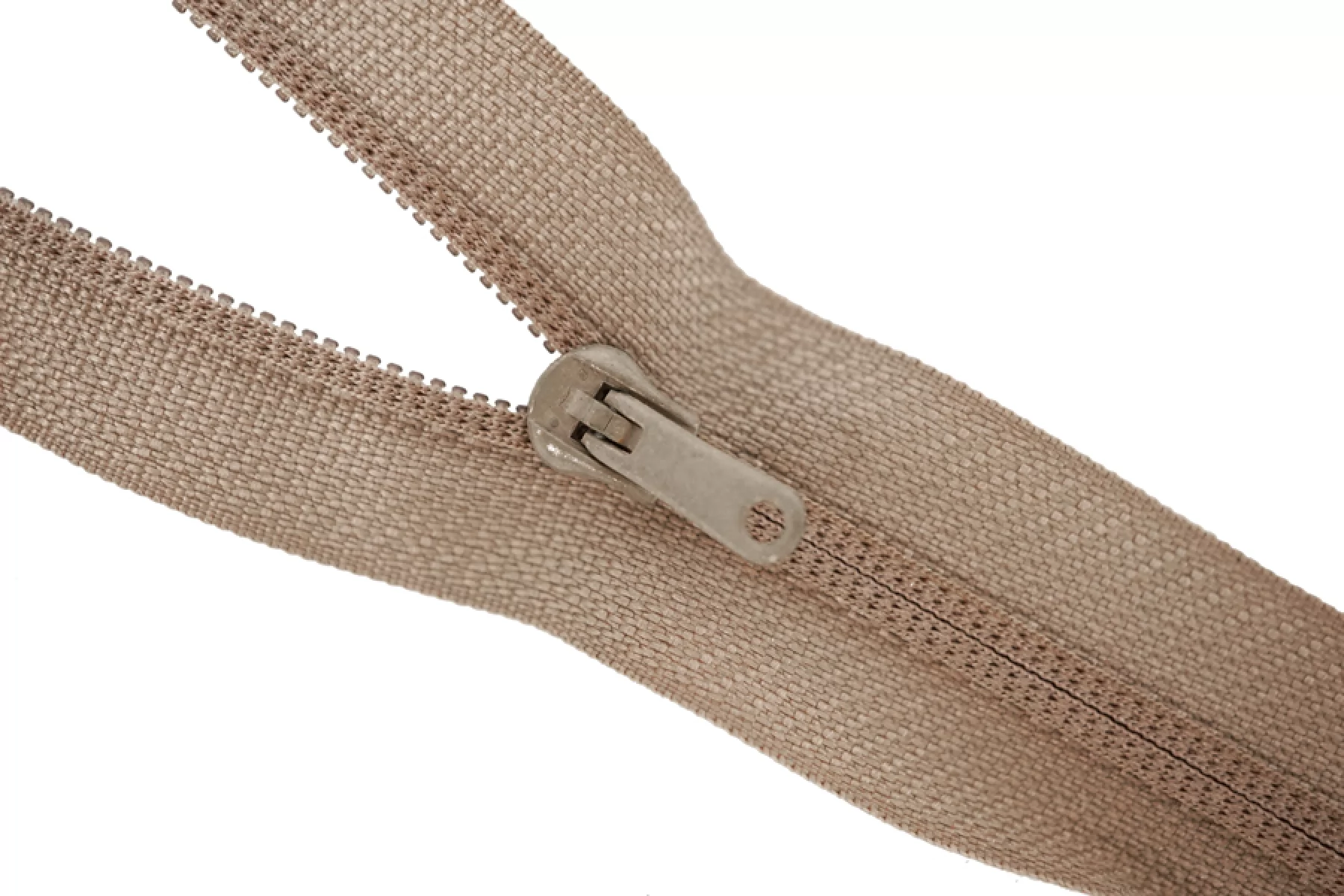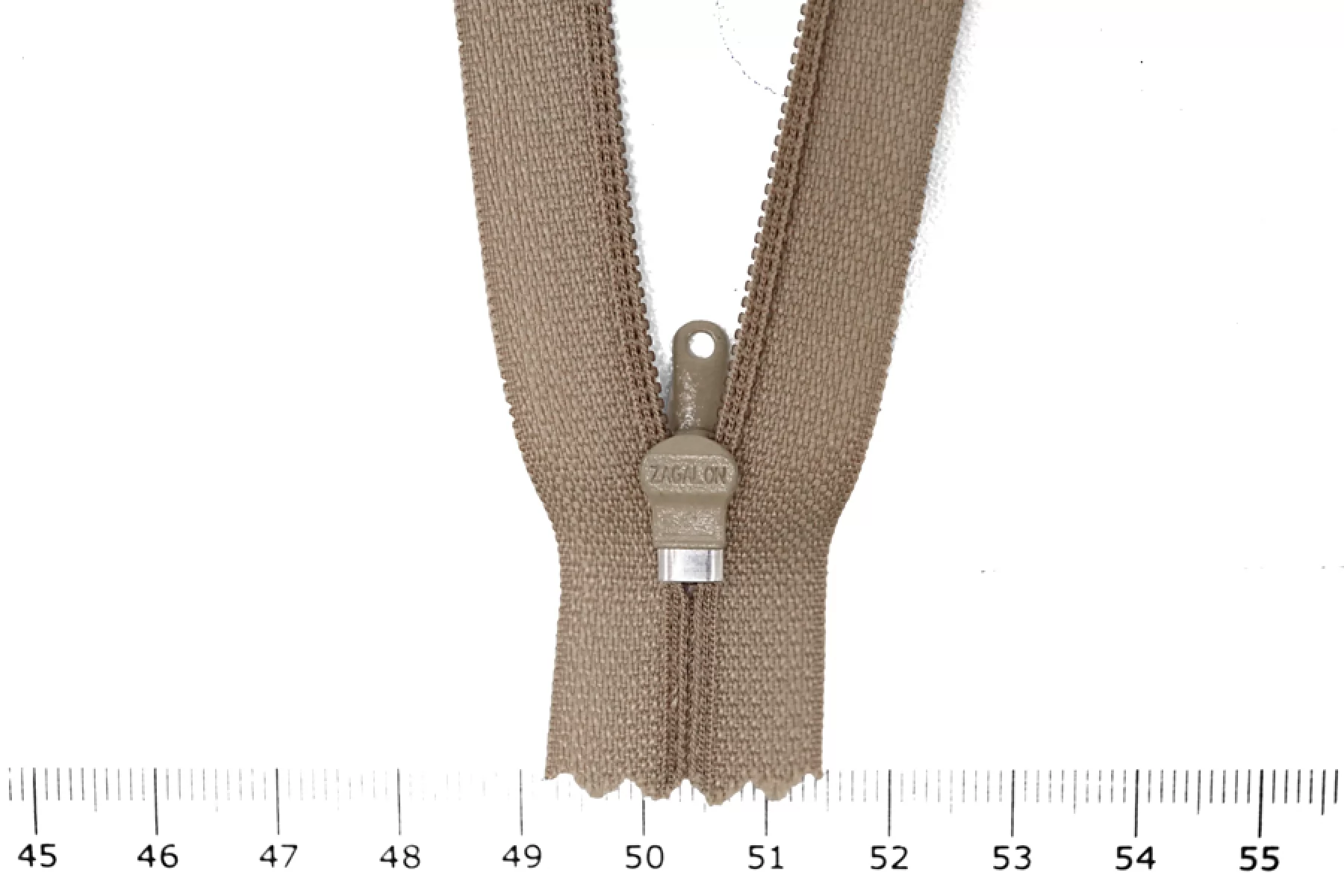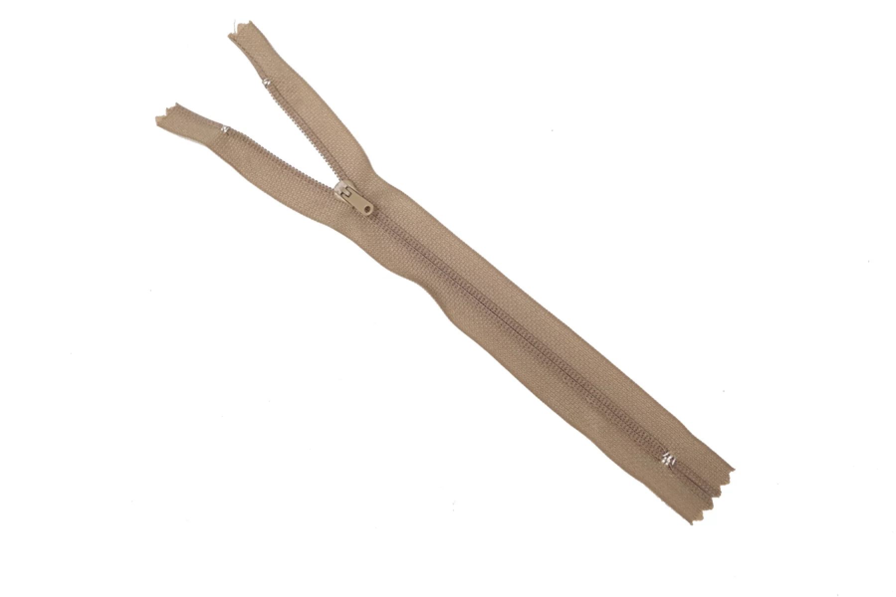 Молния брючная потайная неразъёмная, однозамковая, бежевого кофейного цвета, от Zagalon. Длина 18см. Ширина 2,2см. Ширина зубцов 4мм.