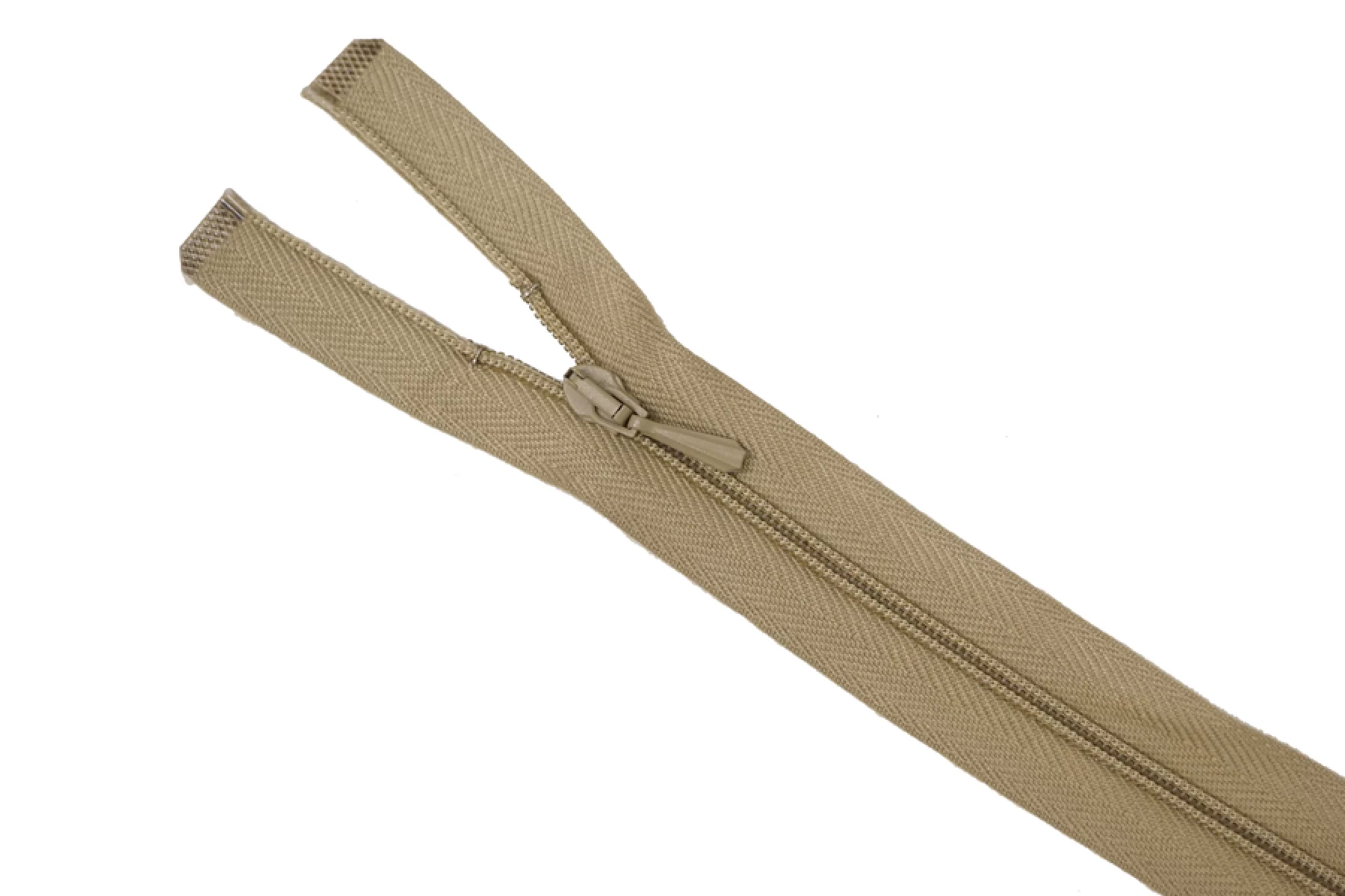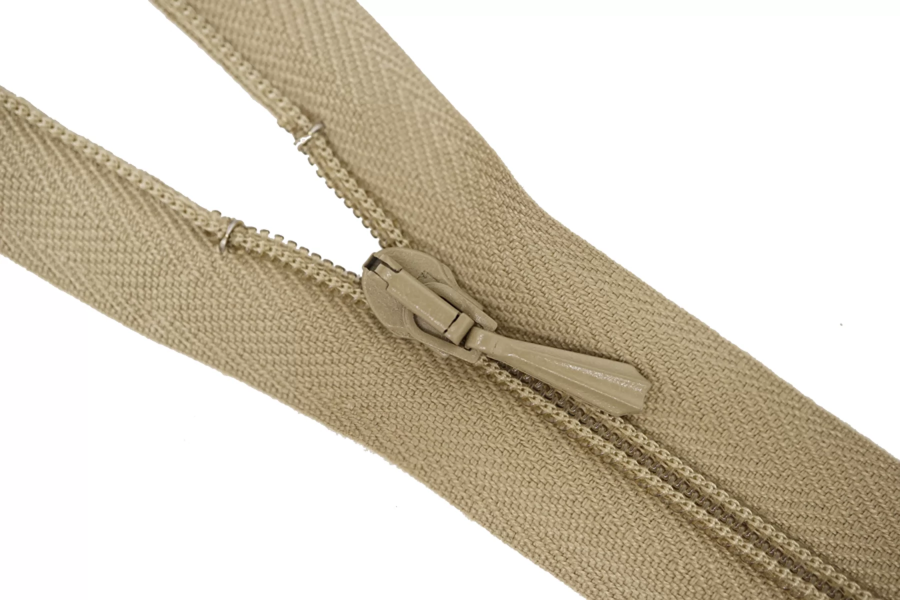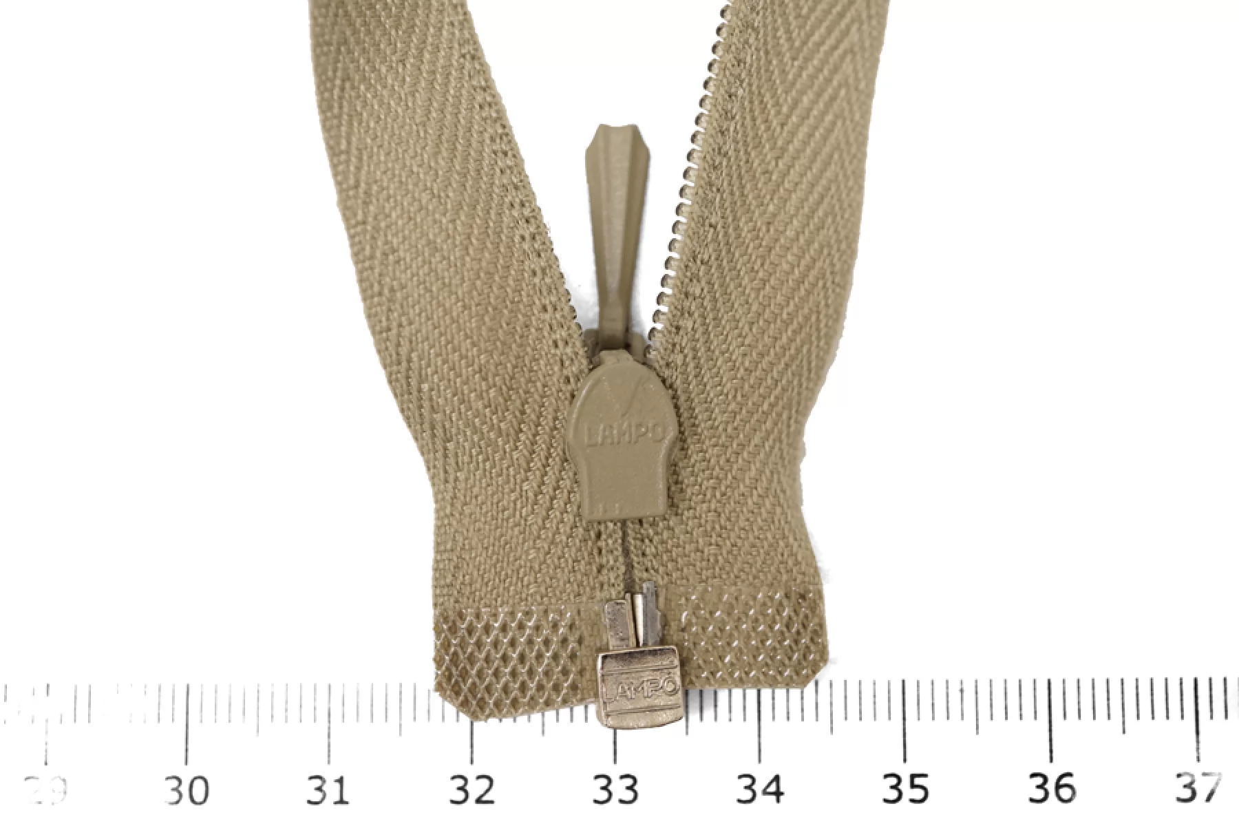 Молния брючная потайная неразъёмная, однозамковая, бежевого цвета, от Lampo. Зубцы пластиковые. Пулер металл. Длина 45см. Ширина 2,1см. Ширина зубцов 5мм.