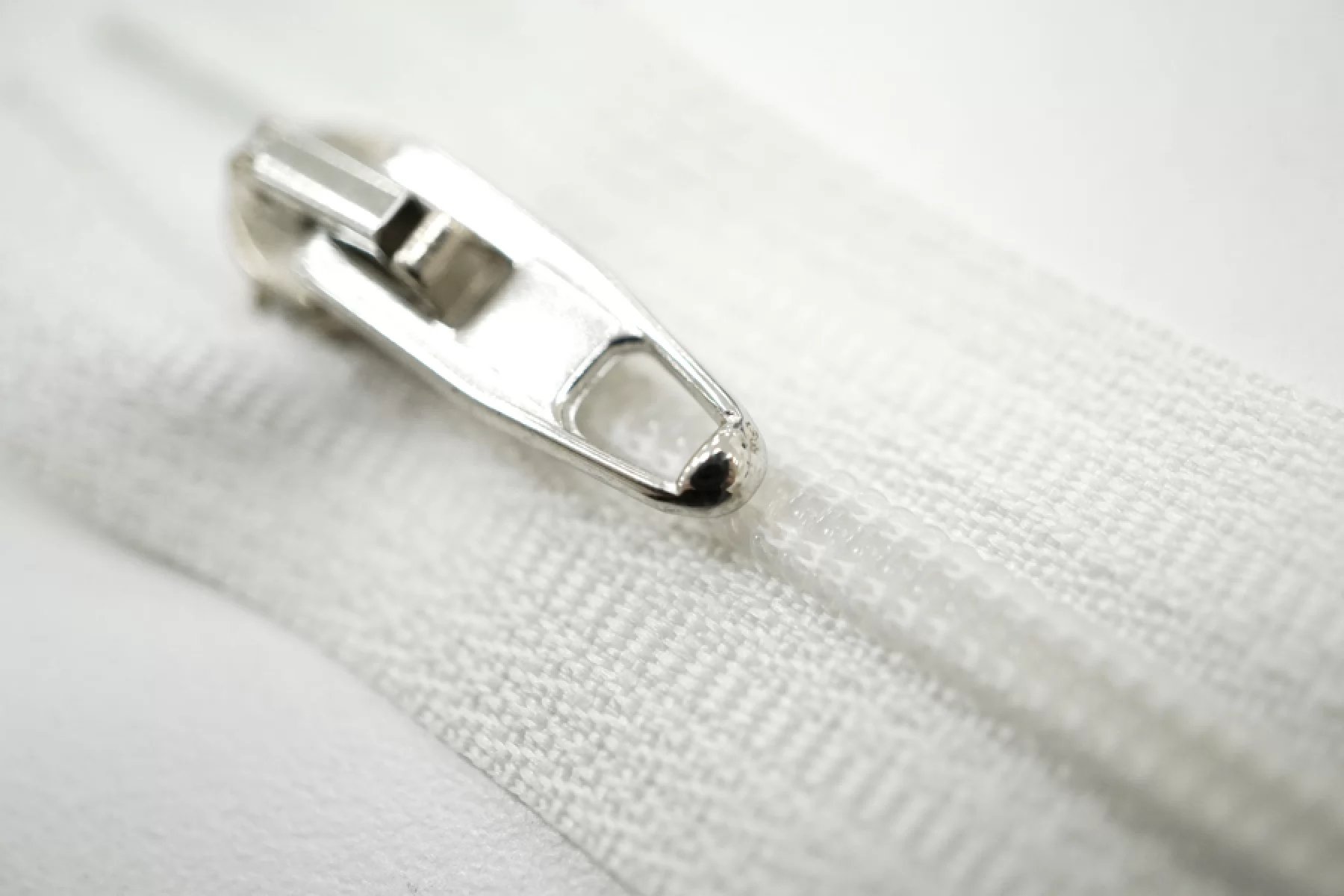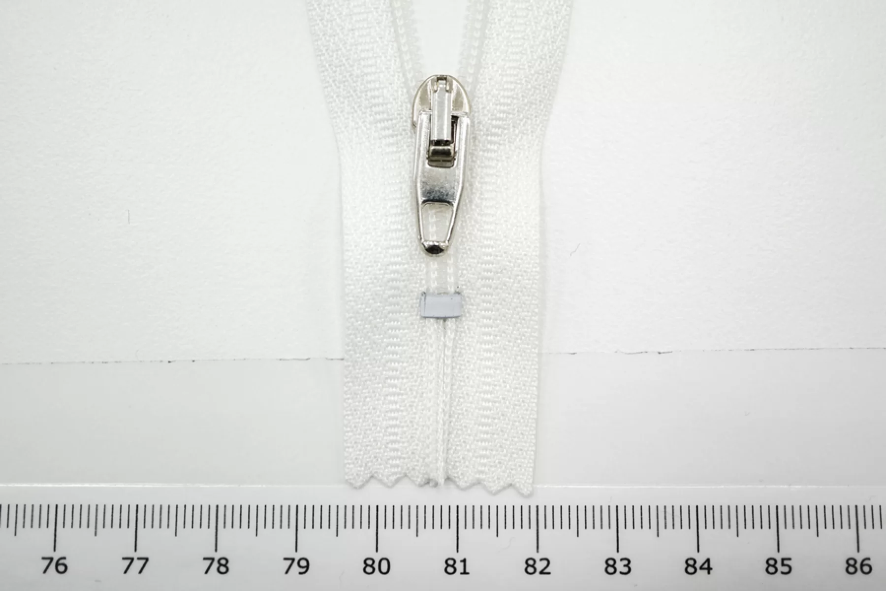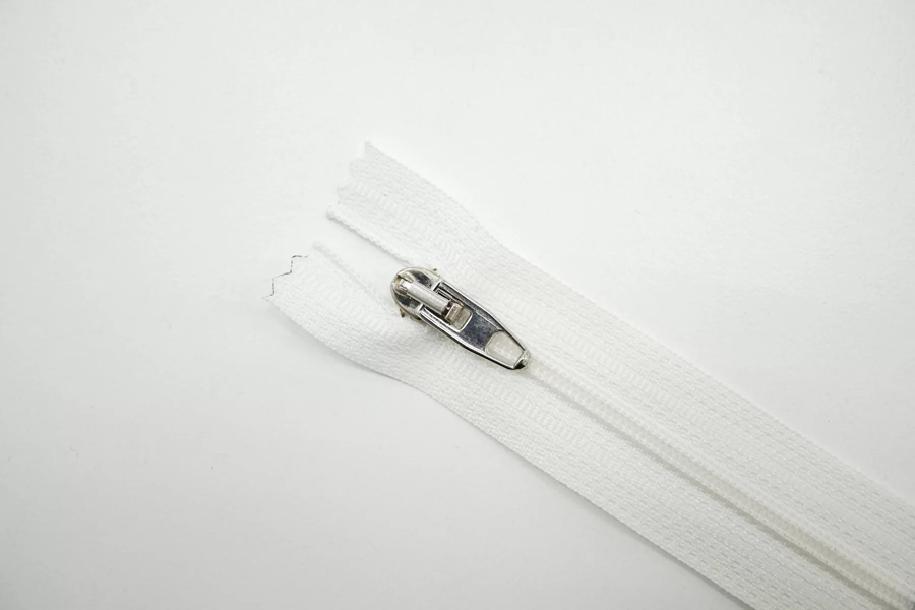 Молния брючная спиральная неразъёмная, однозамковая, белого цвета, пуллер и слайдер серебристого цвета от Riri. Длина 9 см.