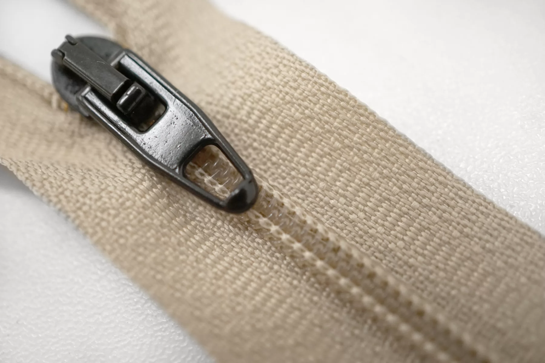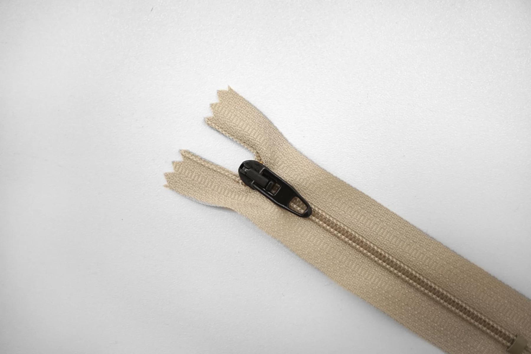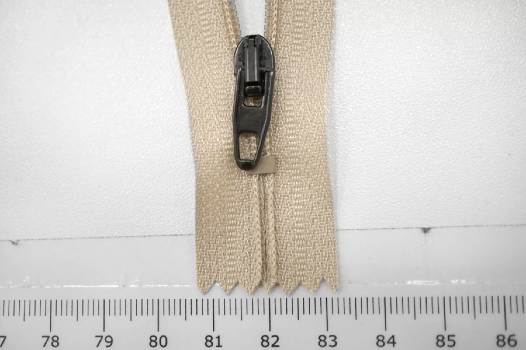 Молния брючная спиральная неразъёмная, однозамковая, бежевого цвета, пуллер и слайдер черные от Riri. Длина 16 см.