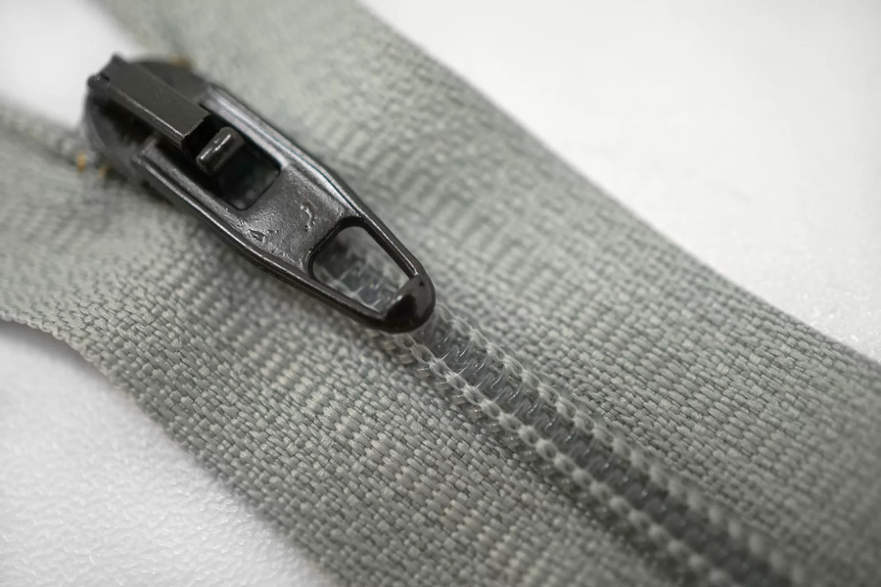 Молния брючная спиральная неразъёмная, однозамковая, серого цвета, пуллер и слайдер черные от Riri. Длина 9 см.