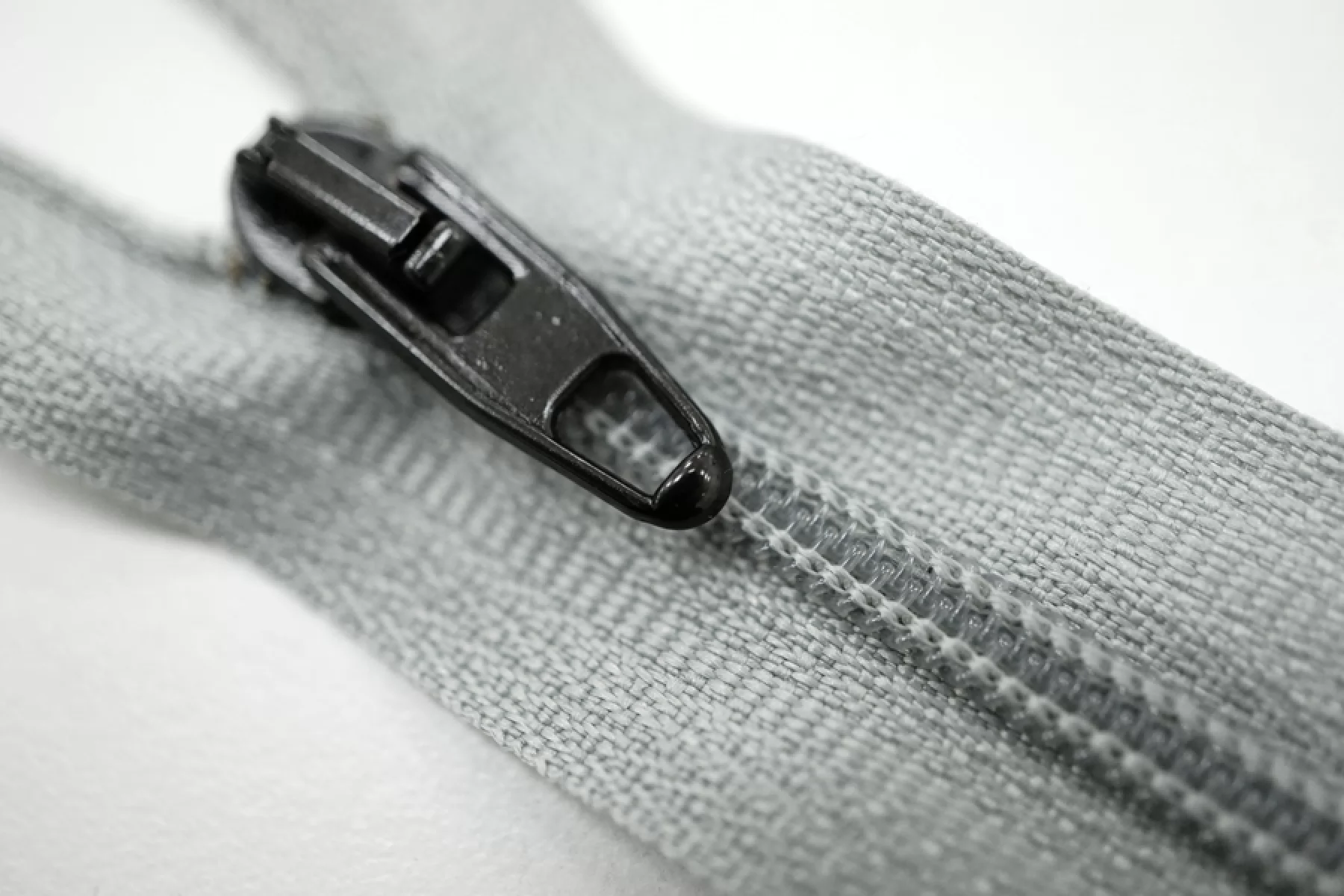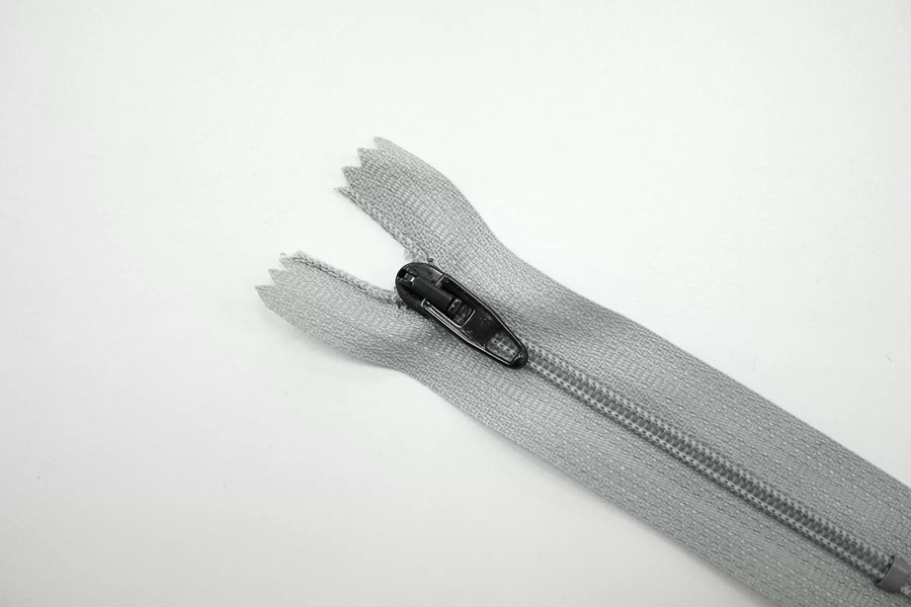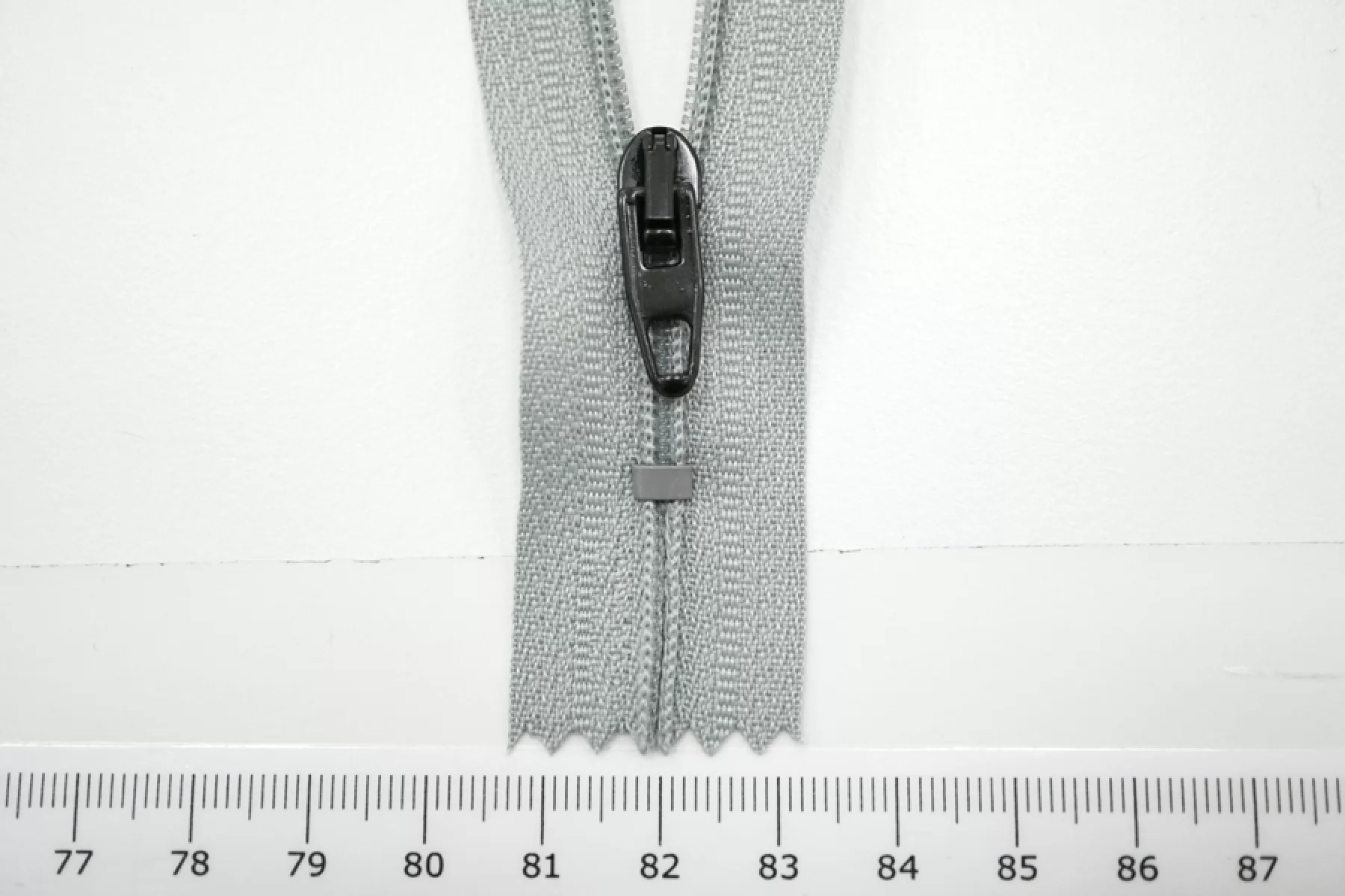 Молния брючная спиральная неразъёмная, однозамковая, серо-голубого цвета, пуллер и слайдер черного цвета от Riri. Длина 8,5 см.