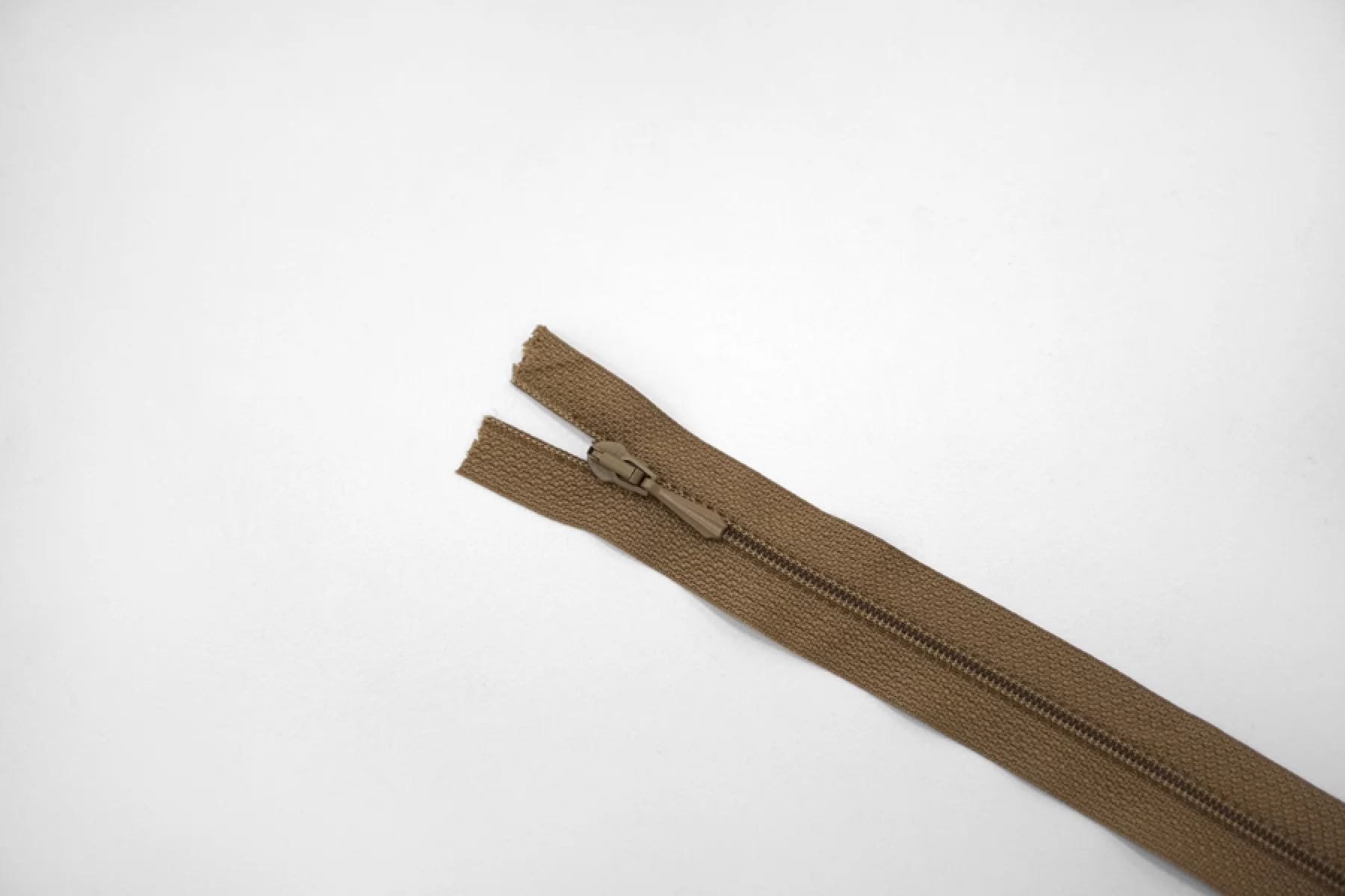 Молния брючная спиральная неразъёмная, однозамковая, темно-бежевого цвета от Lampo. Длина 16 см.