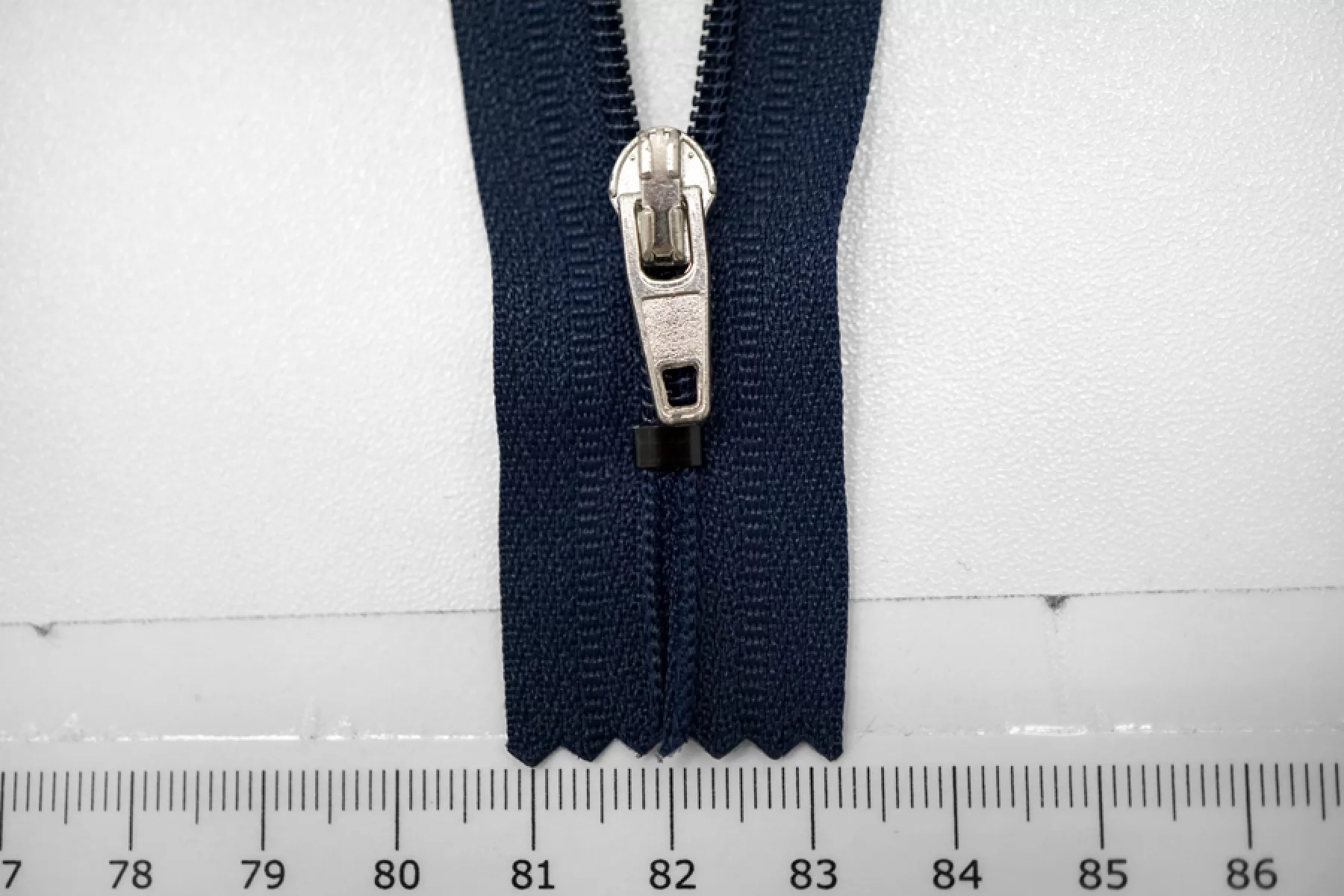 Молния брючная спиральная неразъёмная, однозамковая, темно-синего цвета, пуллер и слайдер серебристые от Riri. Длина 16 см.
