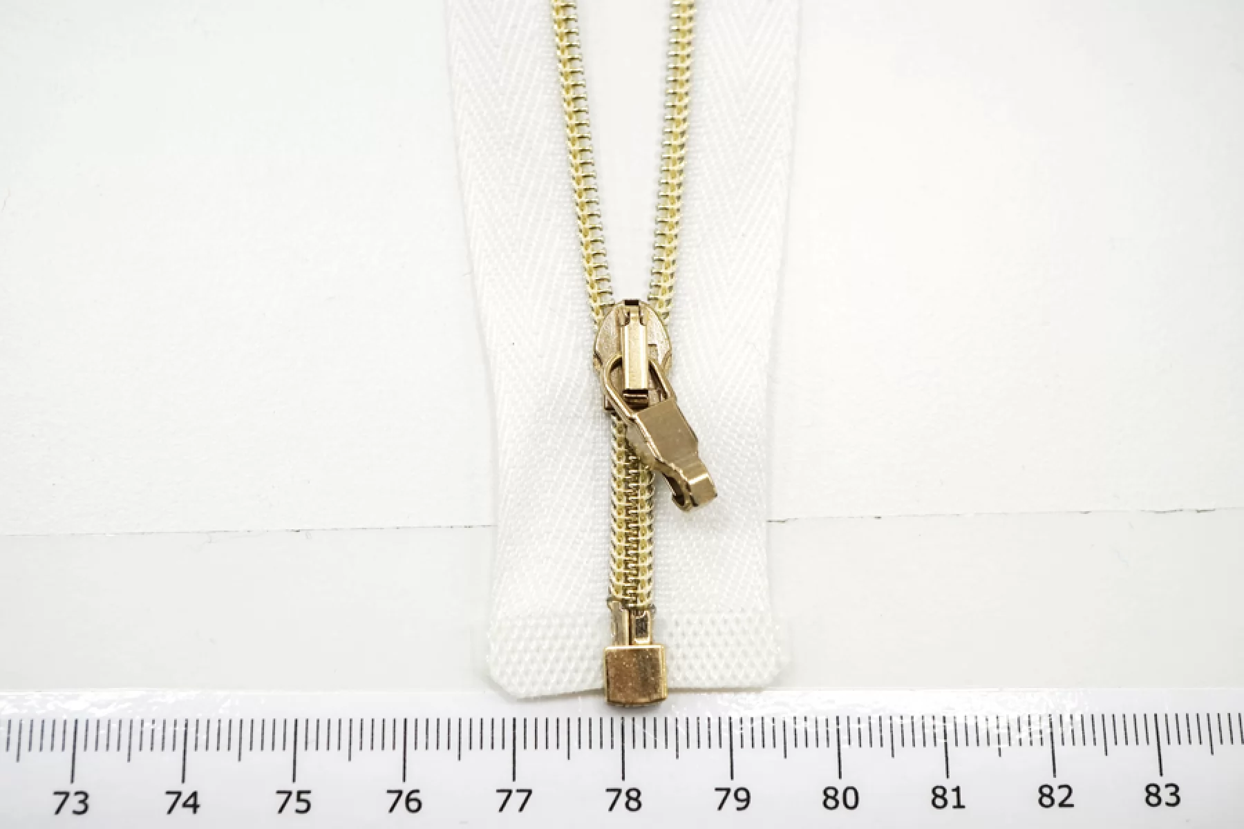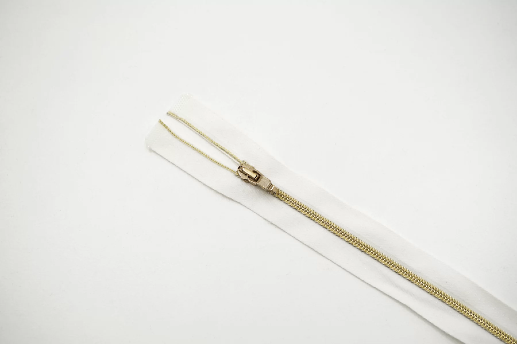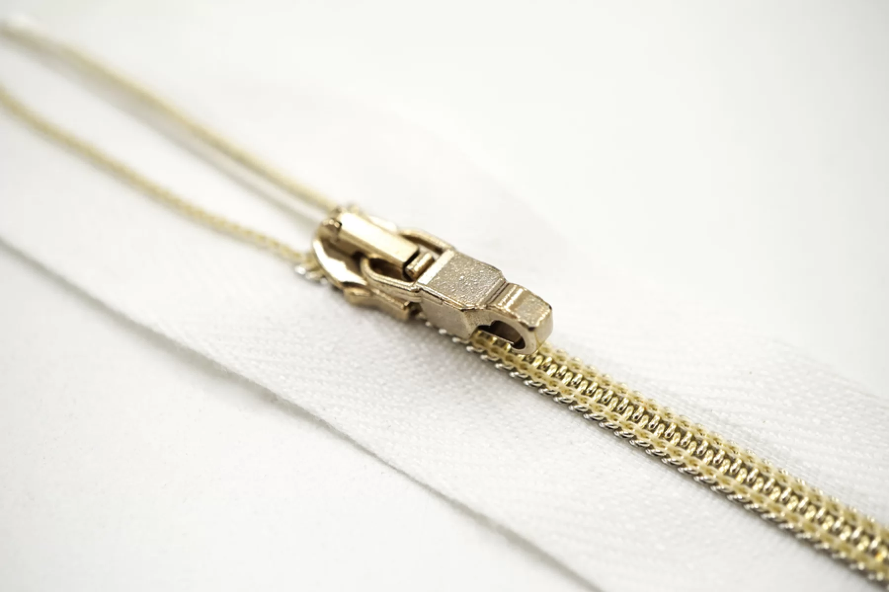 Молния декоративная спиральная разъёмная, однозамковая, белого цвета, пуллер в виде карабина, слайдер и зубцы золотистые от Lampo. Длина 44 см.