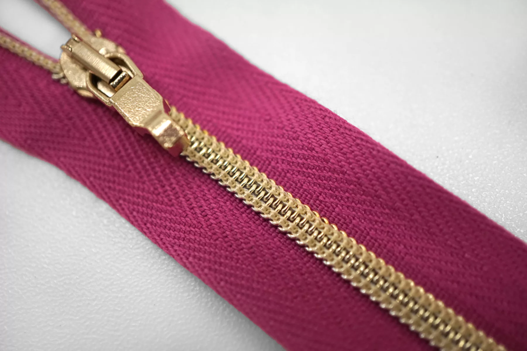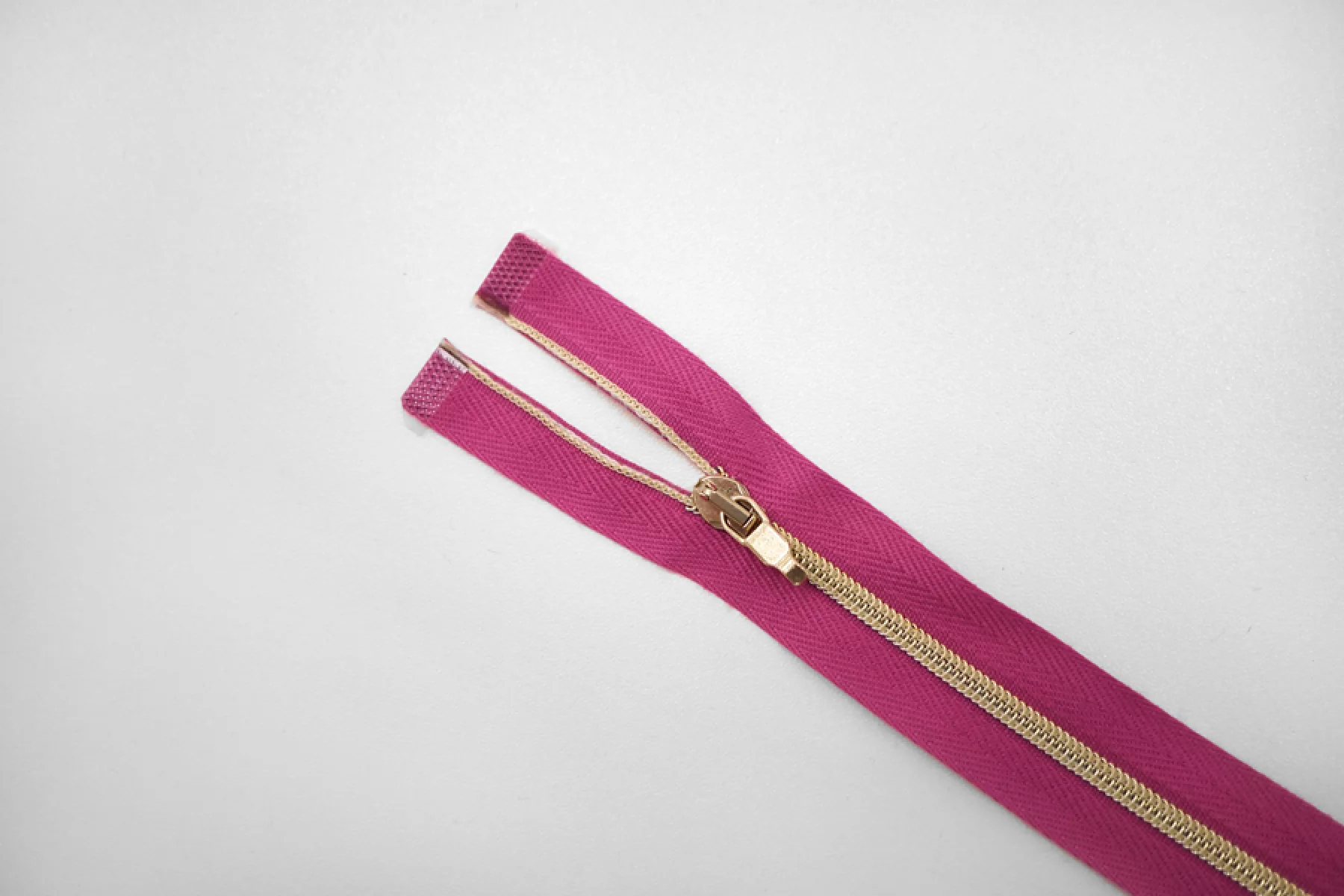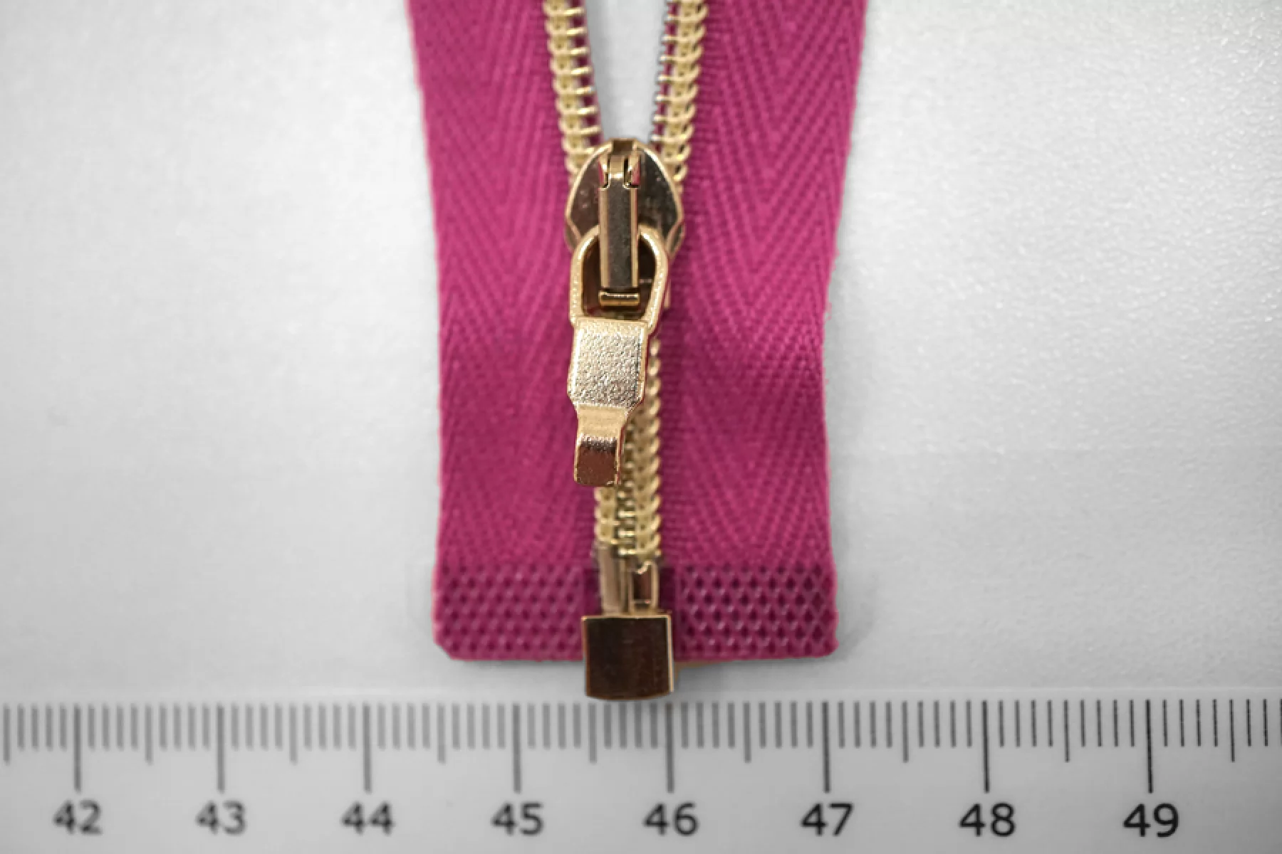 Молния декоративная спиральная разъёмная, однозамковая, цвета фуксии, пуллер в виде карабина, слайдер и зубцы золотистые от Lampo. Длина 48 см.