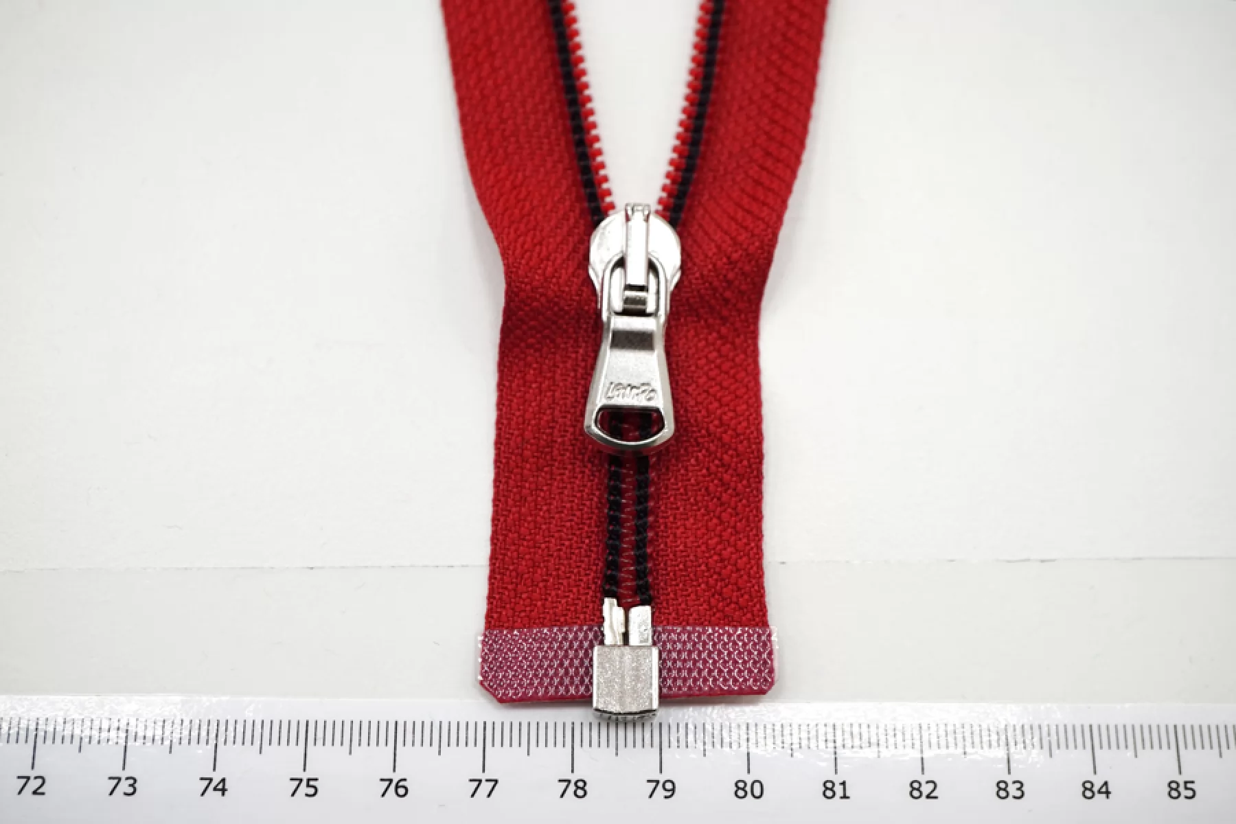 Молния декоративная спиральная разъёмная, однозамковая, красного цвета, на зубцах темно-синяя отделка нитью от Lampo. Длина 49 см.