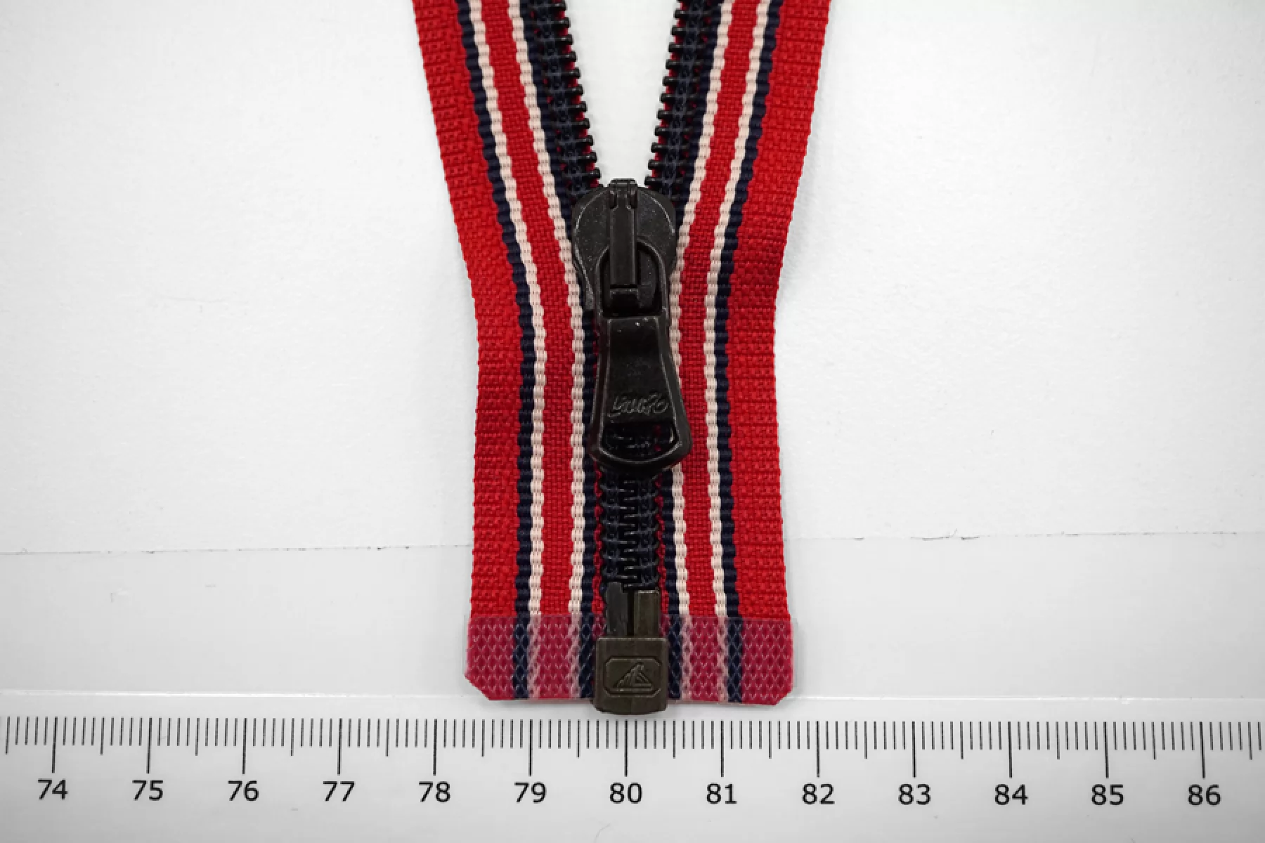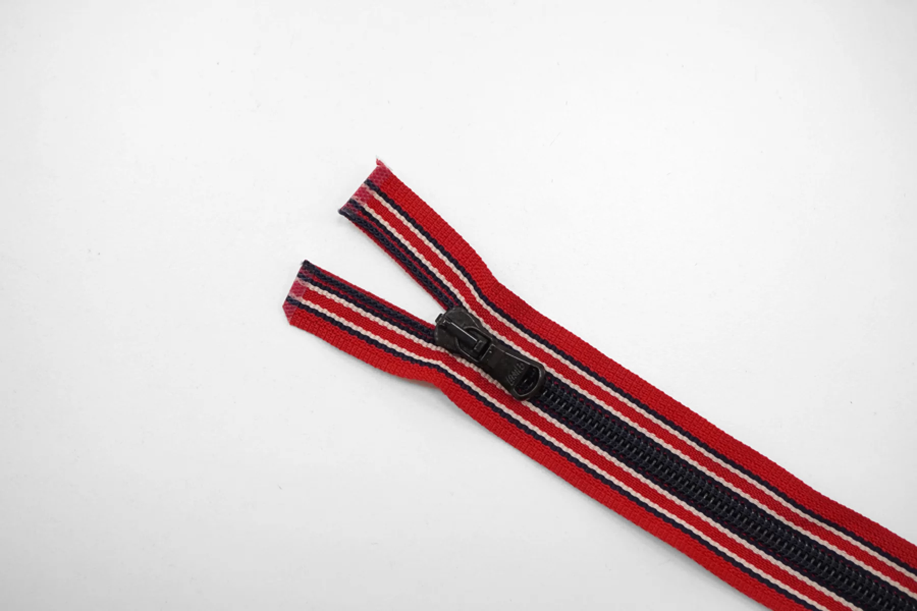 Молния декоративная спиральная разъёмная, однозамковая, красного цвета в синюю и белую полоски, пуллер и зубцы черного цвета Lampo. Длина 40 см.