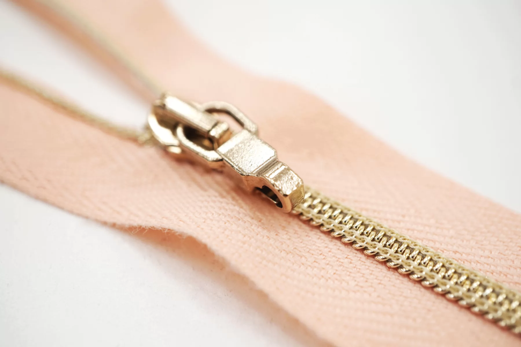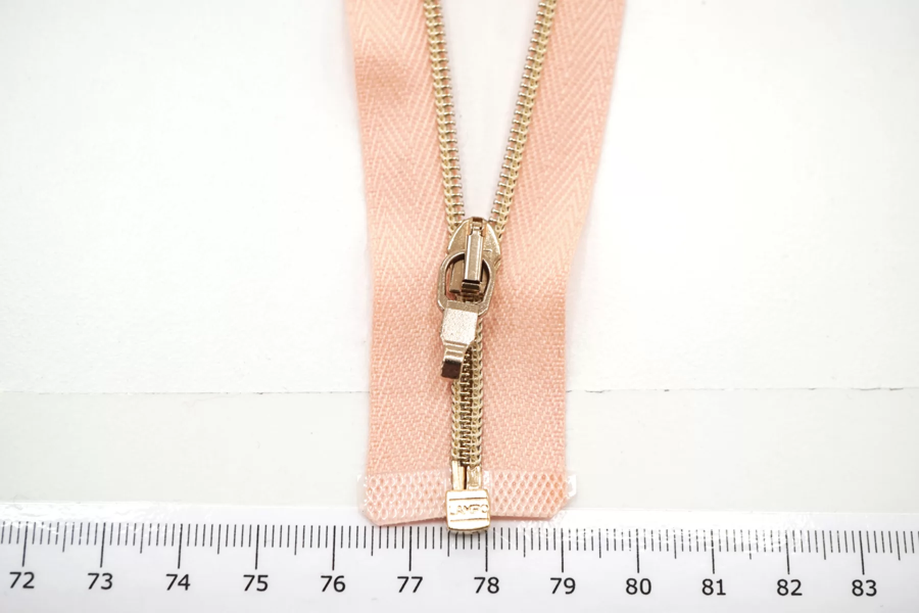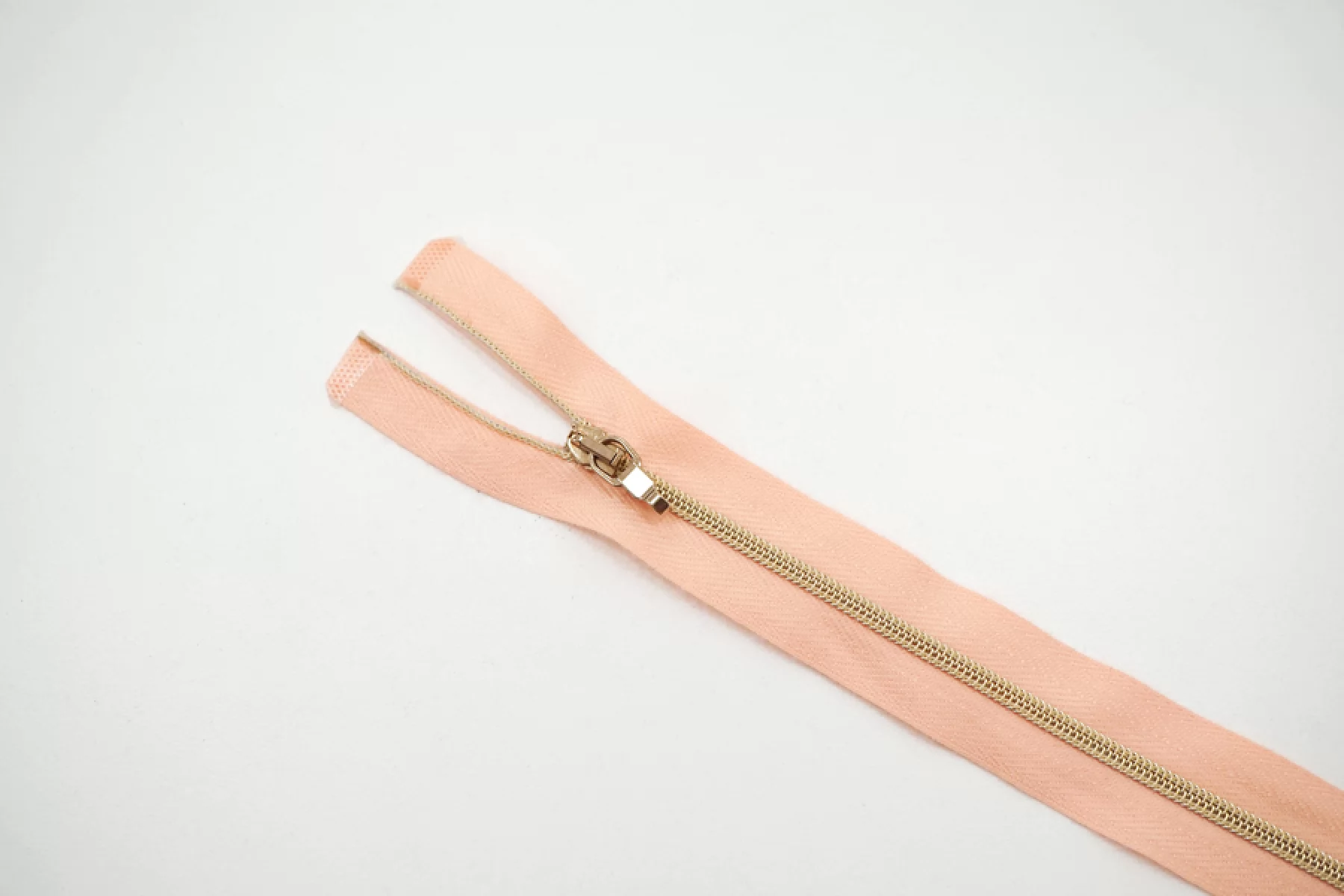 Молния декоративная спиральная разъёмная, однозамковая, нежного персикового цвета, пуллер в виде карабина, слайдер и зубцы золотистые от Lampo. Длина 59 см.