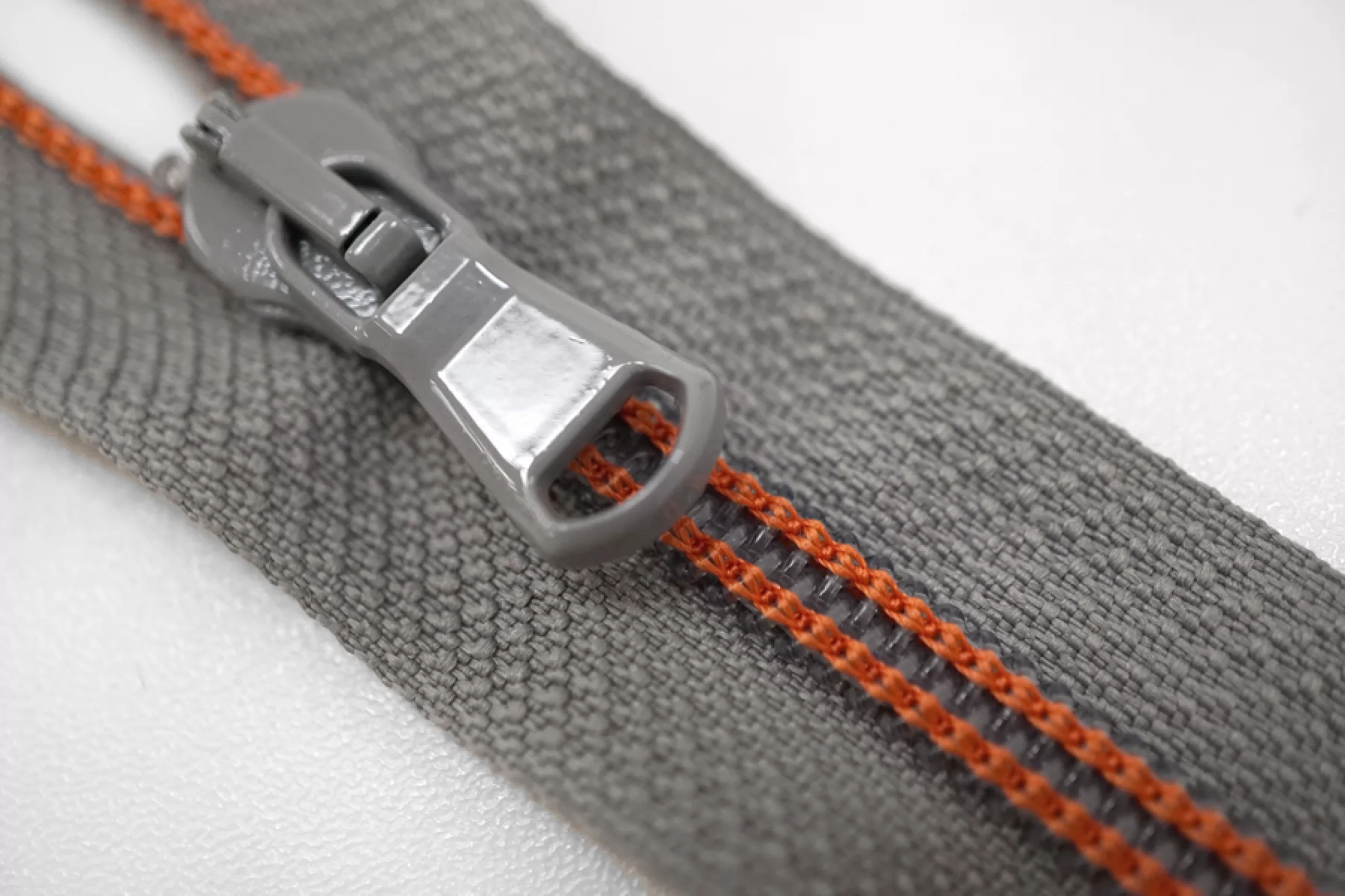 Молния декоративная спиральная разъёмная, однозамковая, серого цвет, зубцы обрамляет оранжевая нить, Lampo. Длина 50 см.