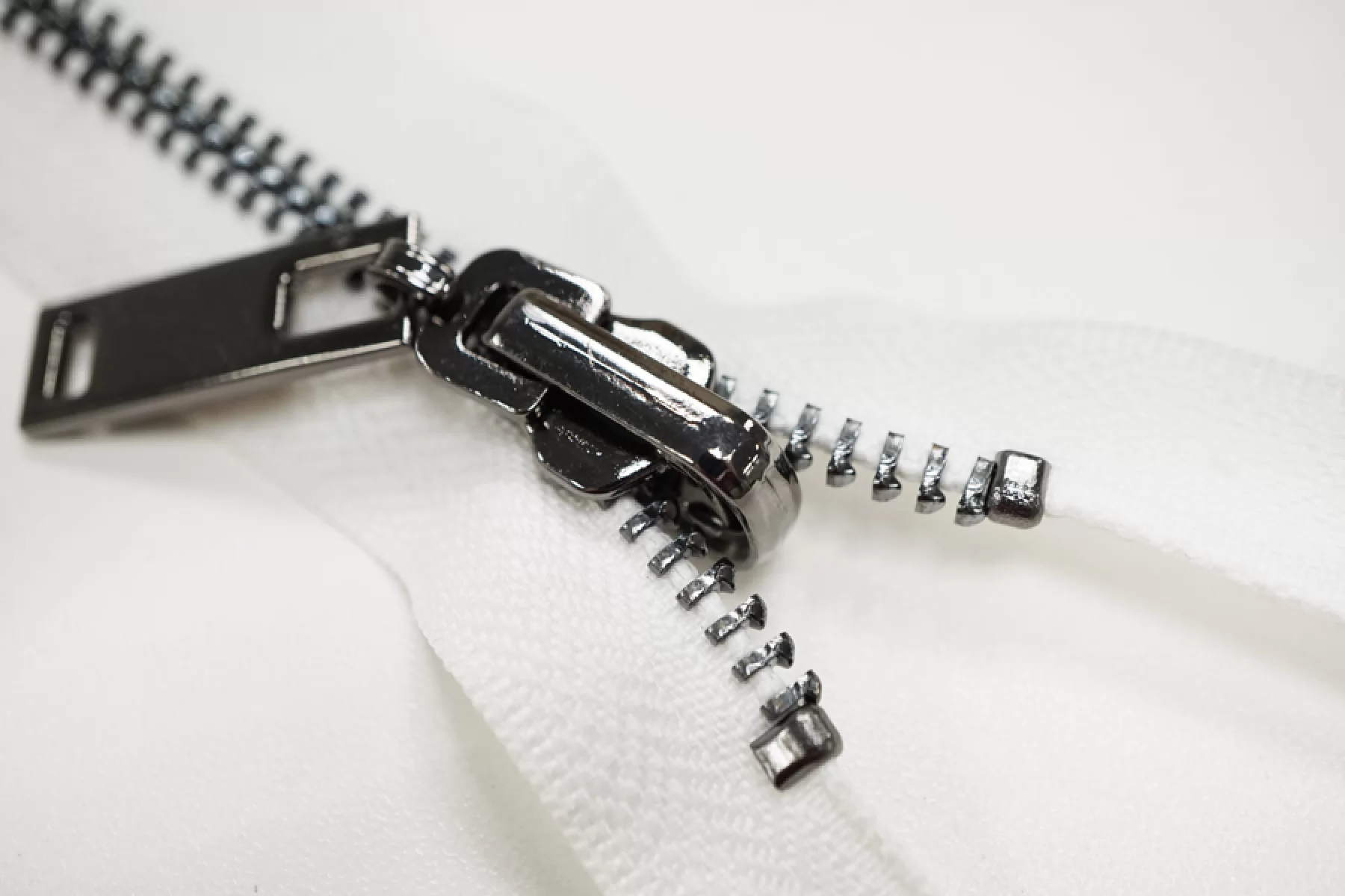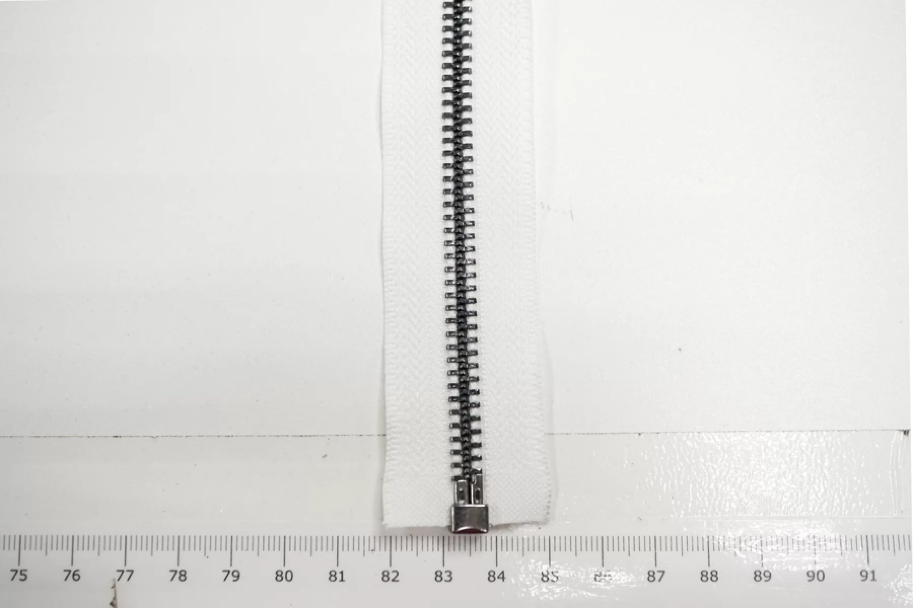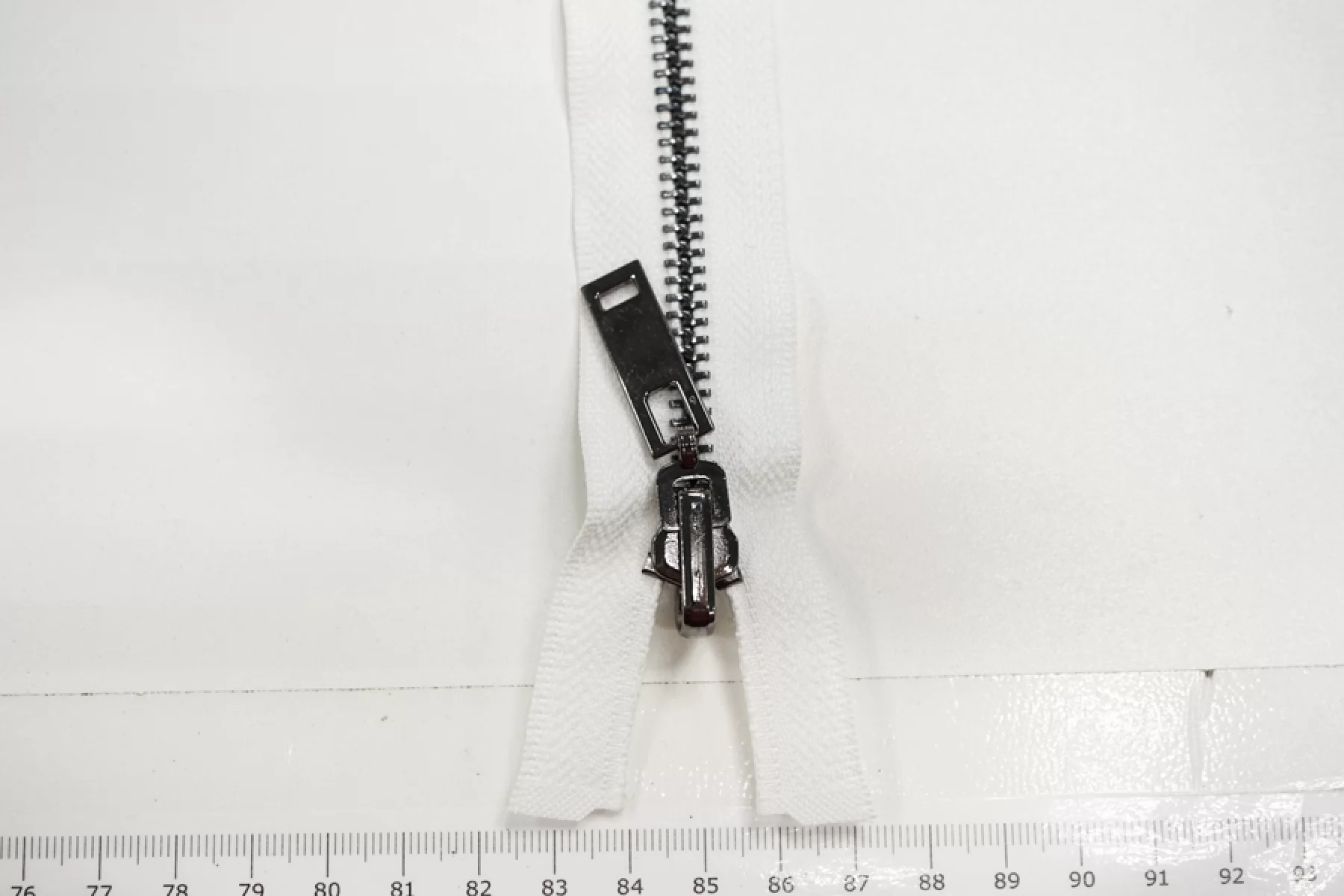 Молния металлическая однозамковая разъёмная белого цвета с зубцами под никель и перекидным язычком. Длина молнии 95 см, ширина зубьев 6 мм, вес 60 г. Подходит для пальто, курток и пуховиков.