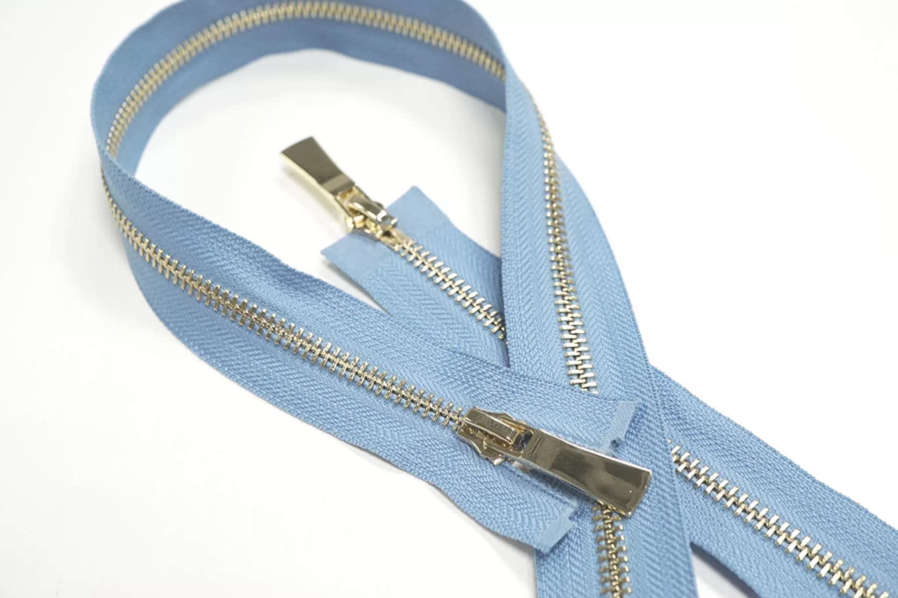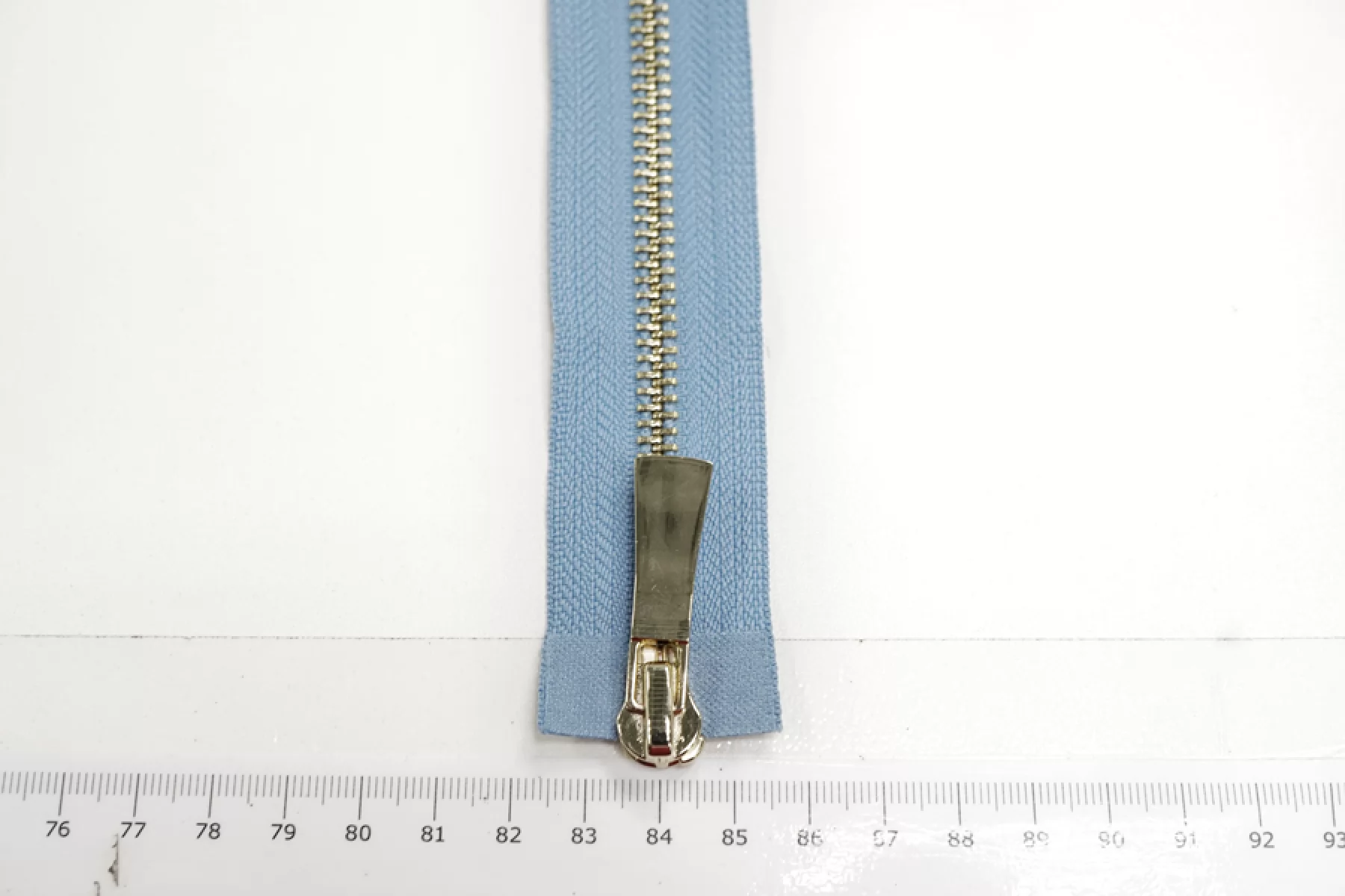 Молния металлическая двухзамковая разъёмная голубого цвета с сиреневым подтоном, с золотыми зубцами. Длина молнии 90 см, ширина зубьев 6 мм, вес 64 г. Подходит для пальто, курток и пуховиков.