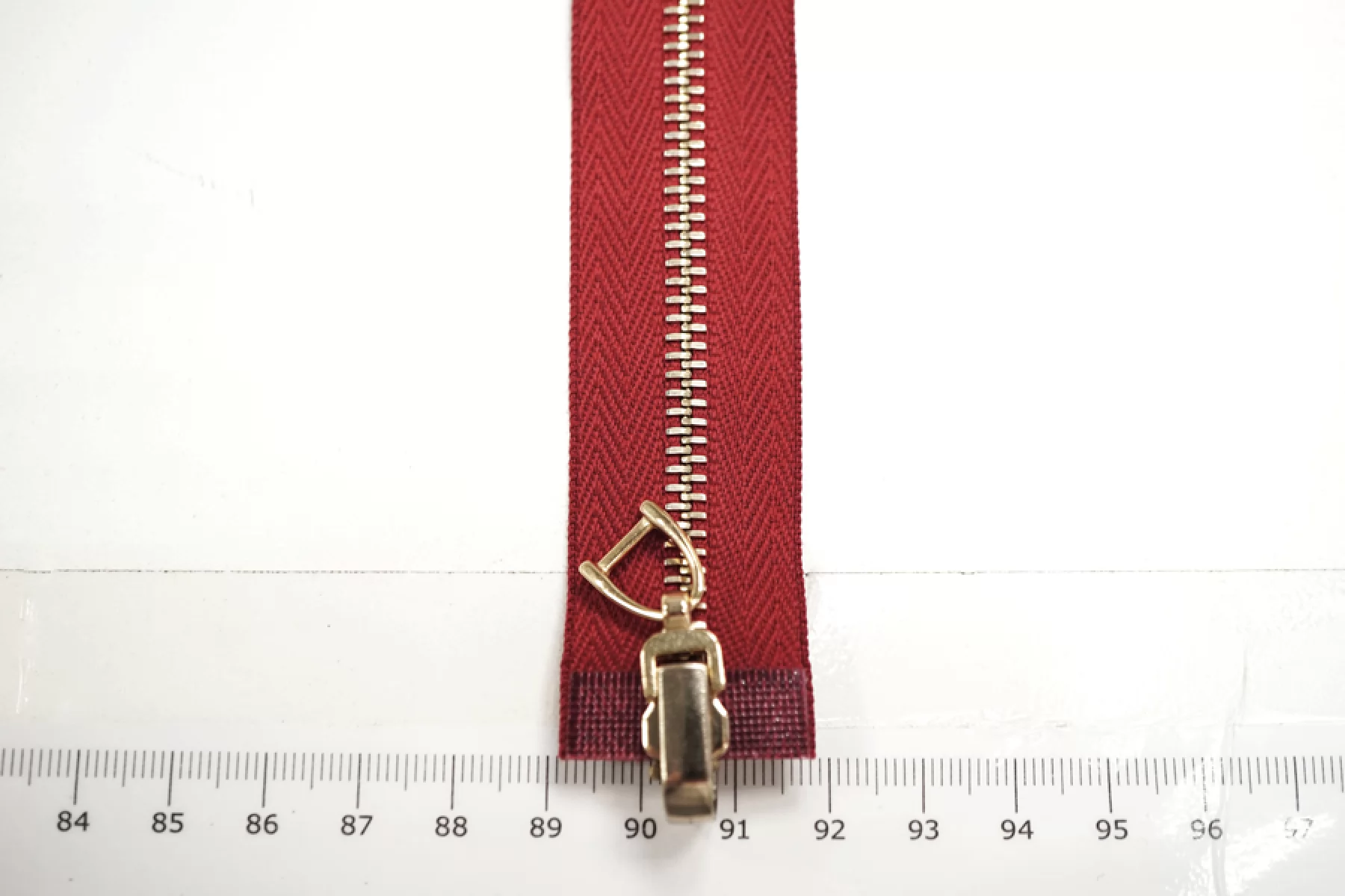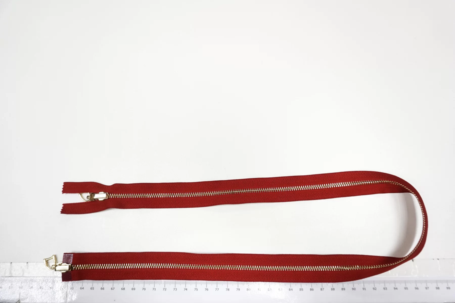 Молния металлическая двухзамковая разъёмная темно-красного цвета с золотыми зубцами и перекидным язычком. Длина молнии 71 см, ширина зубьев 5 мм, вес 38 г. Подходит для пальто, курток и пуховиков.