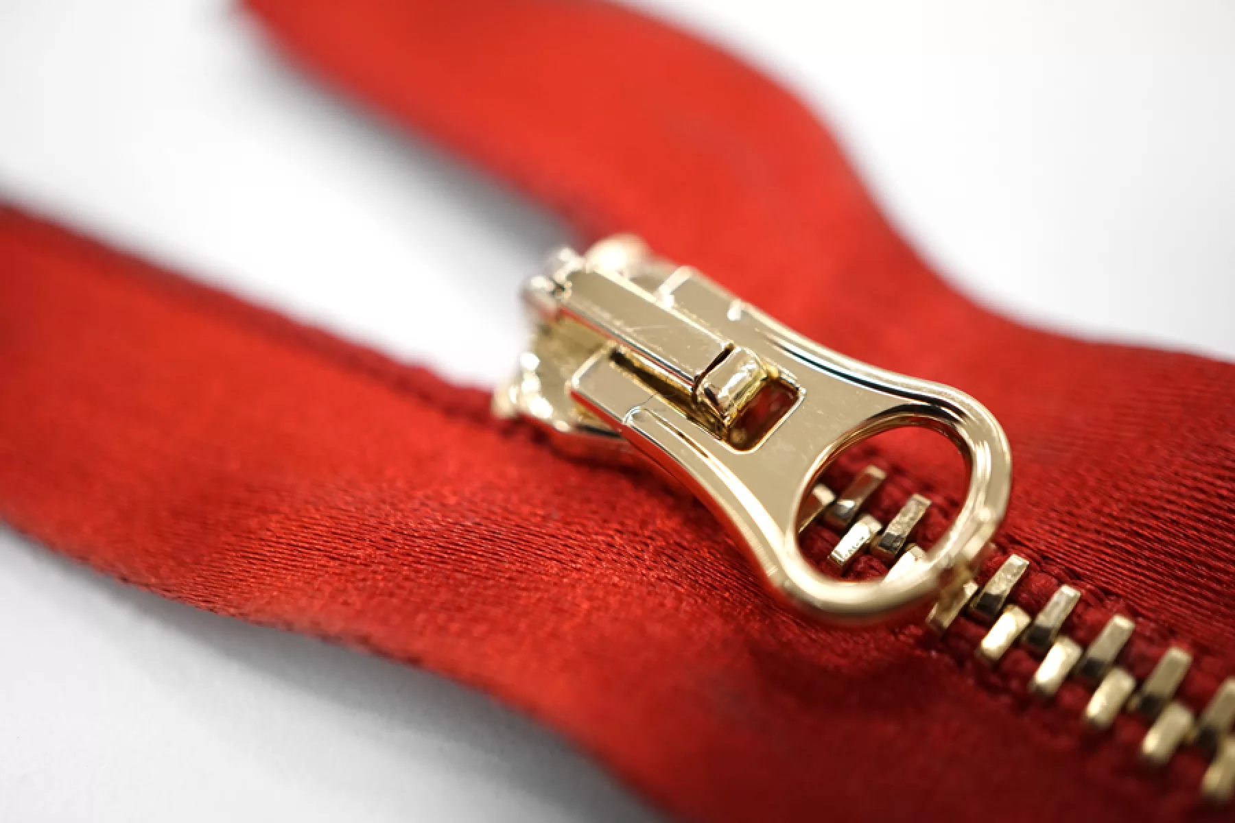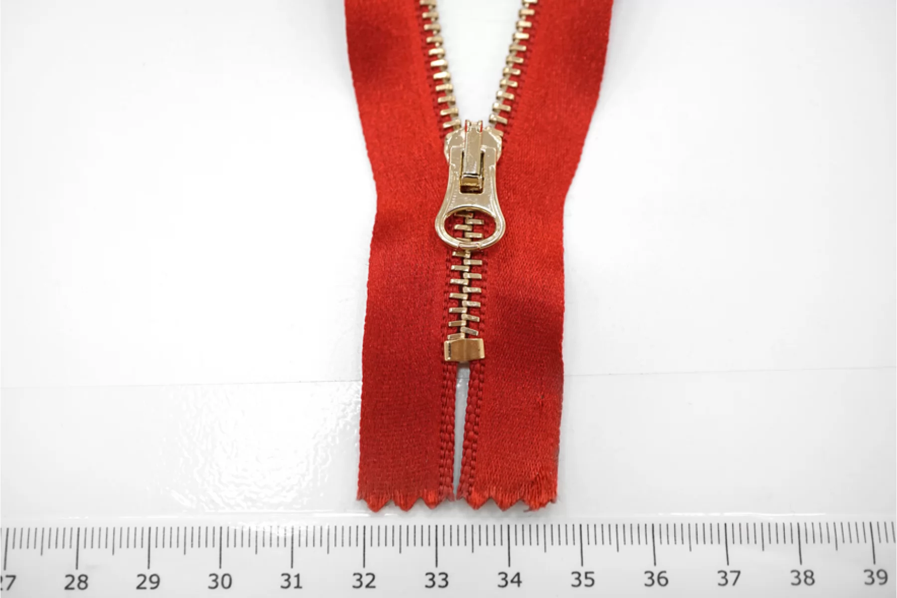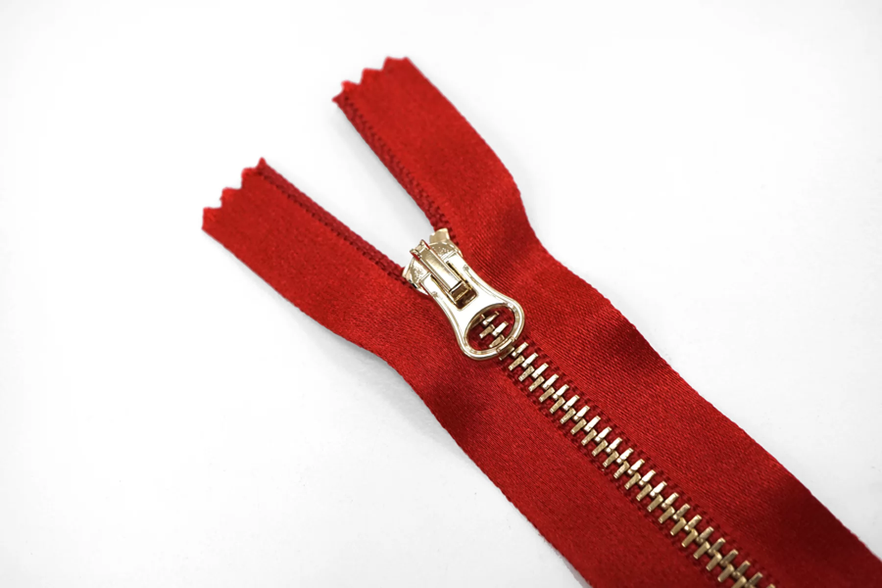Молния металлическая атласная однозамковая от "Lampо" неразъёмная, красного цвета, цвет зубцов и пуллера золотистый. Длина 11 см.