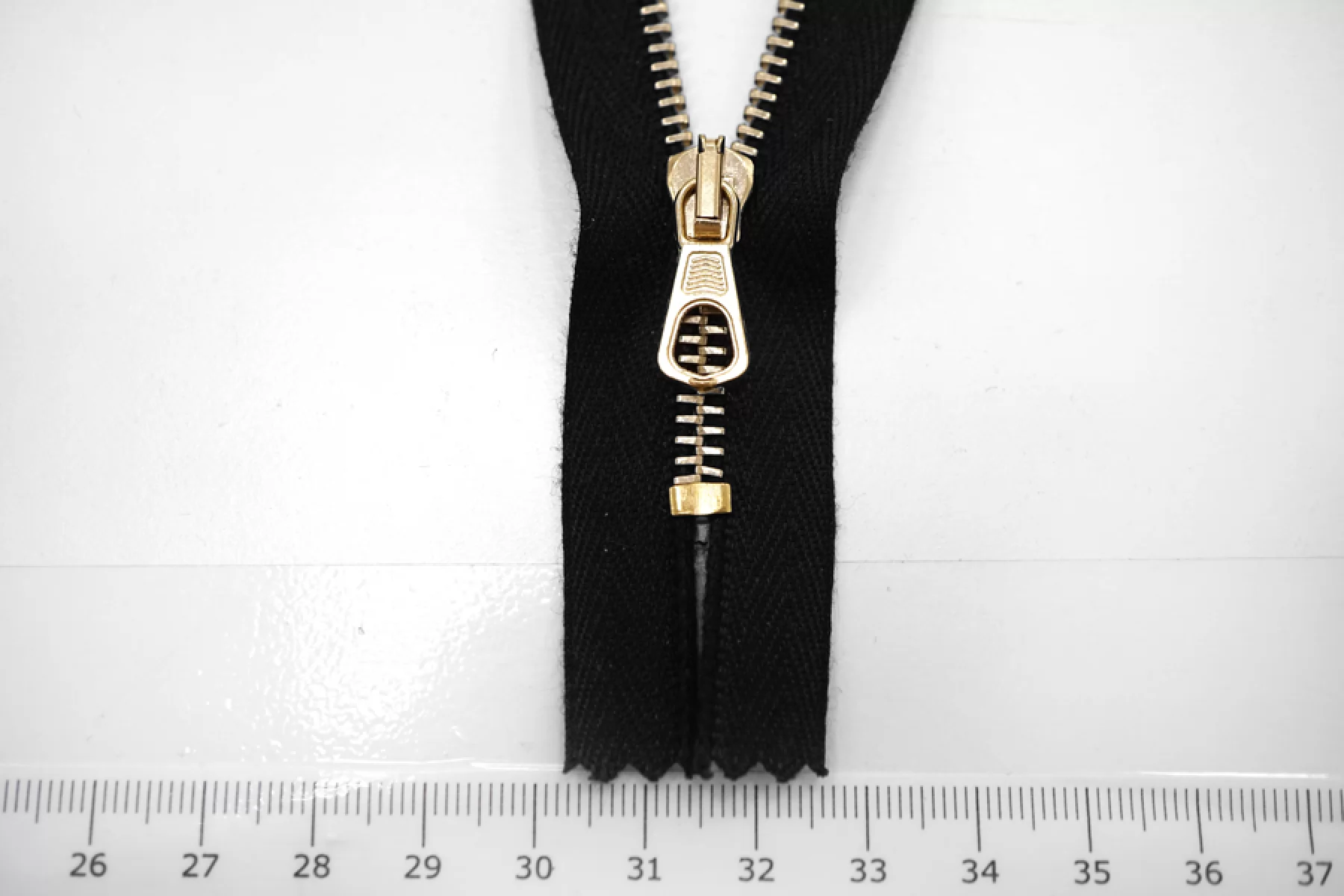 Молния черная от "Lampo " неразъемная, цвет зубцов и пуллера золотистый . Длина 9 см.