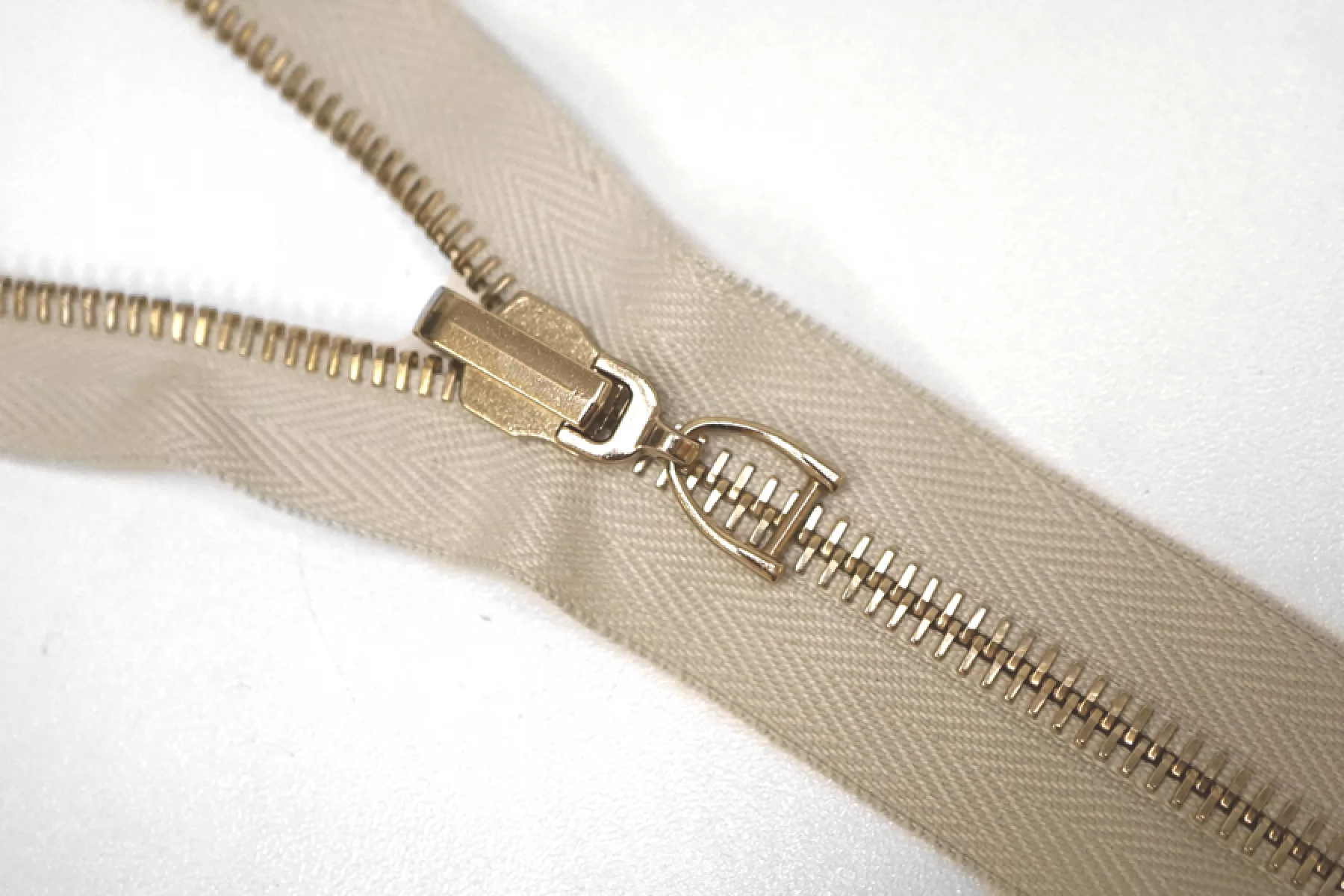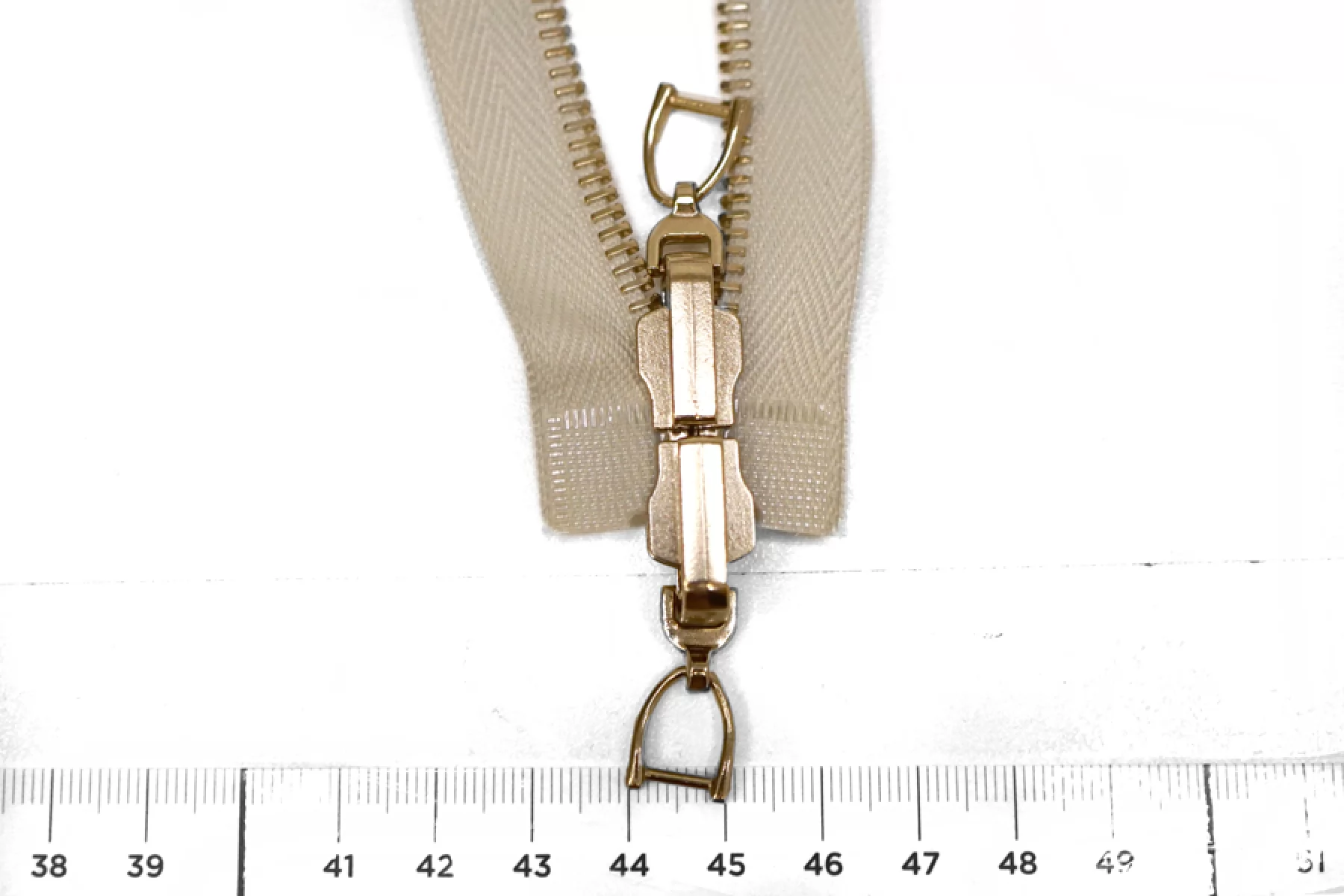 Молния металлическая двухсторонняя от Max Mara разъемная двухзамковая. Цвет молнии молочно-серый, цвет зубцов, пуллера и слайдера золотой. Длина 94см. Ширина молнии 3см, ширина зубцов 6мм.