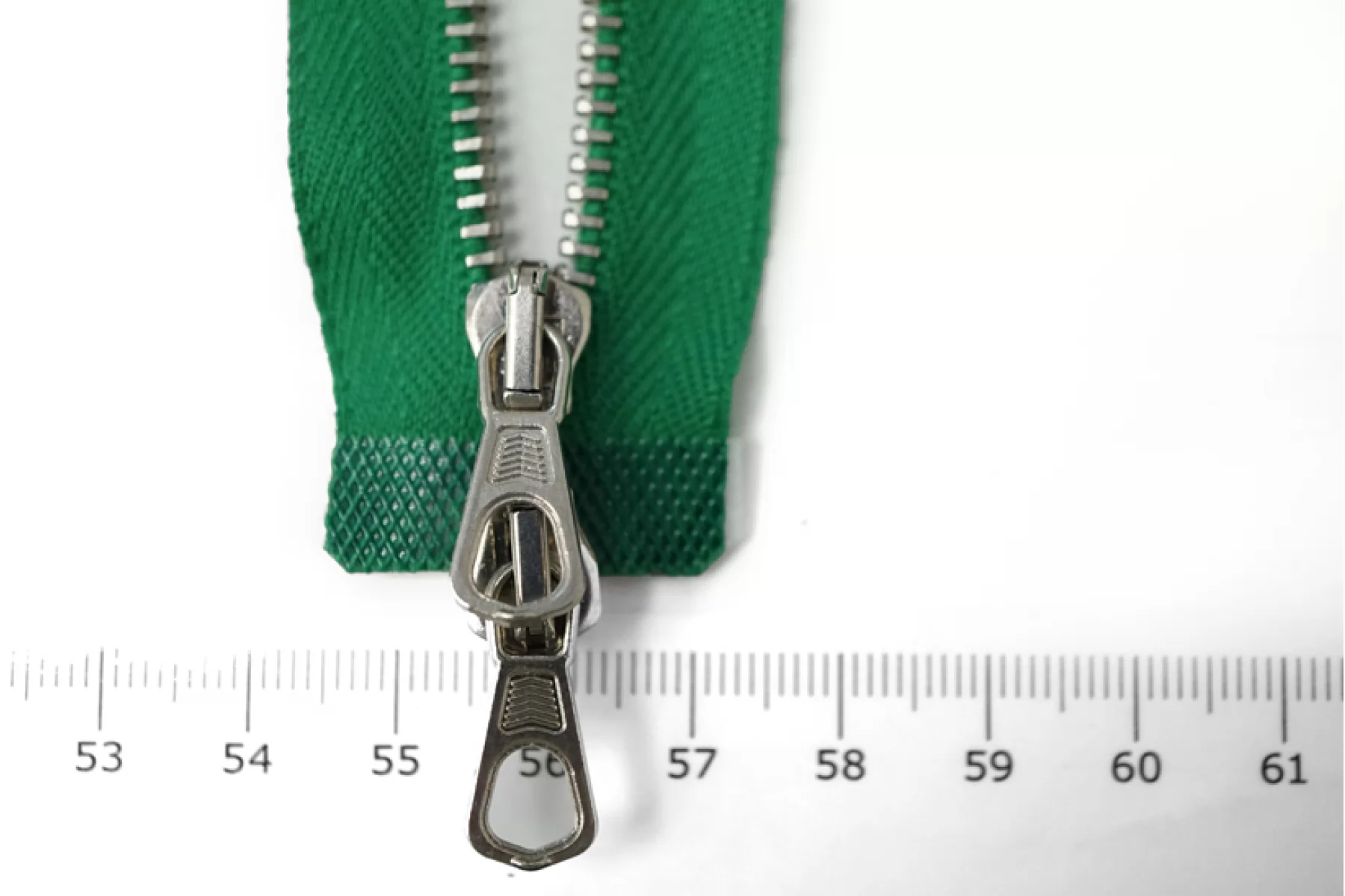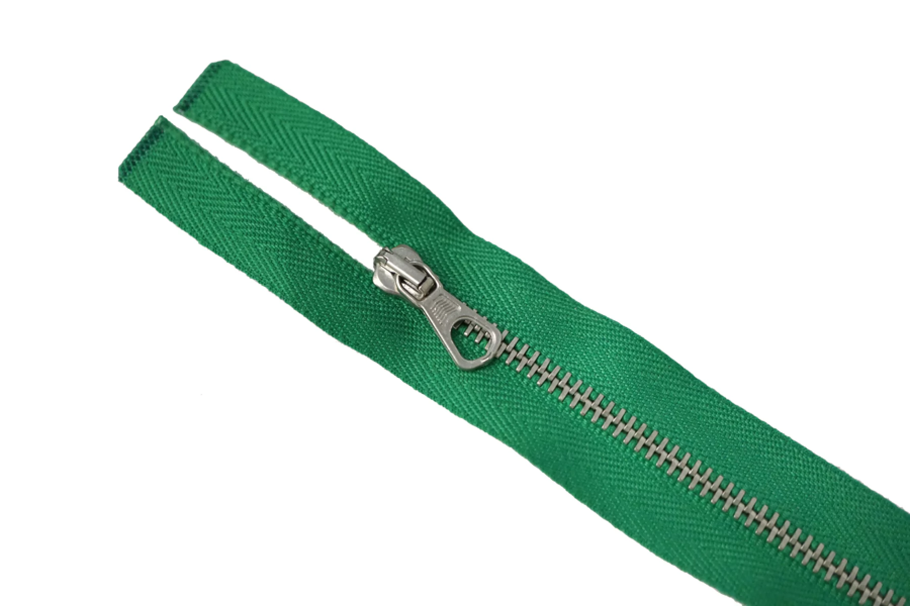 Молния металлическая, двухзамковая от "Lampo" разъёмная. Цвет молнии зеленый. Материал основы - киперная лента, достаточно мягкая, цвет зубцов - серебряный. Слайдер и пулер также серебряные. Ширина молнии - 2.7 см, ширина зубцов 0,5 см. Длина молнии 30 см.