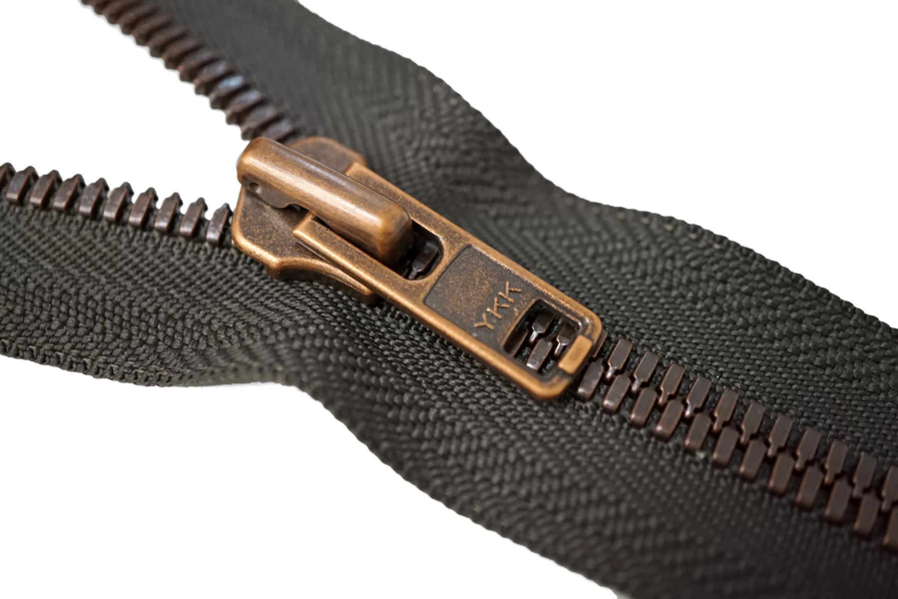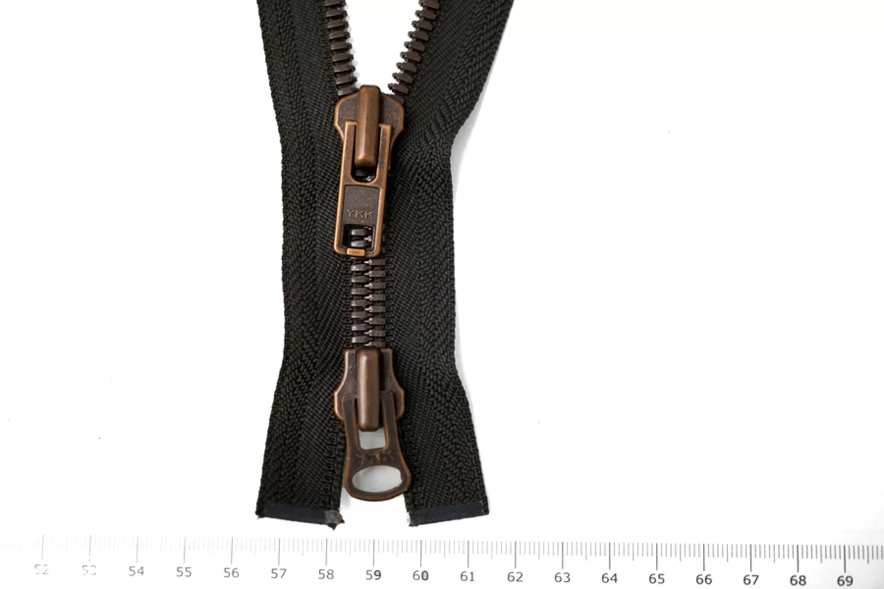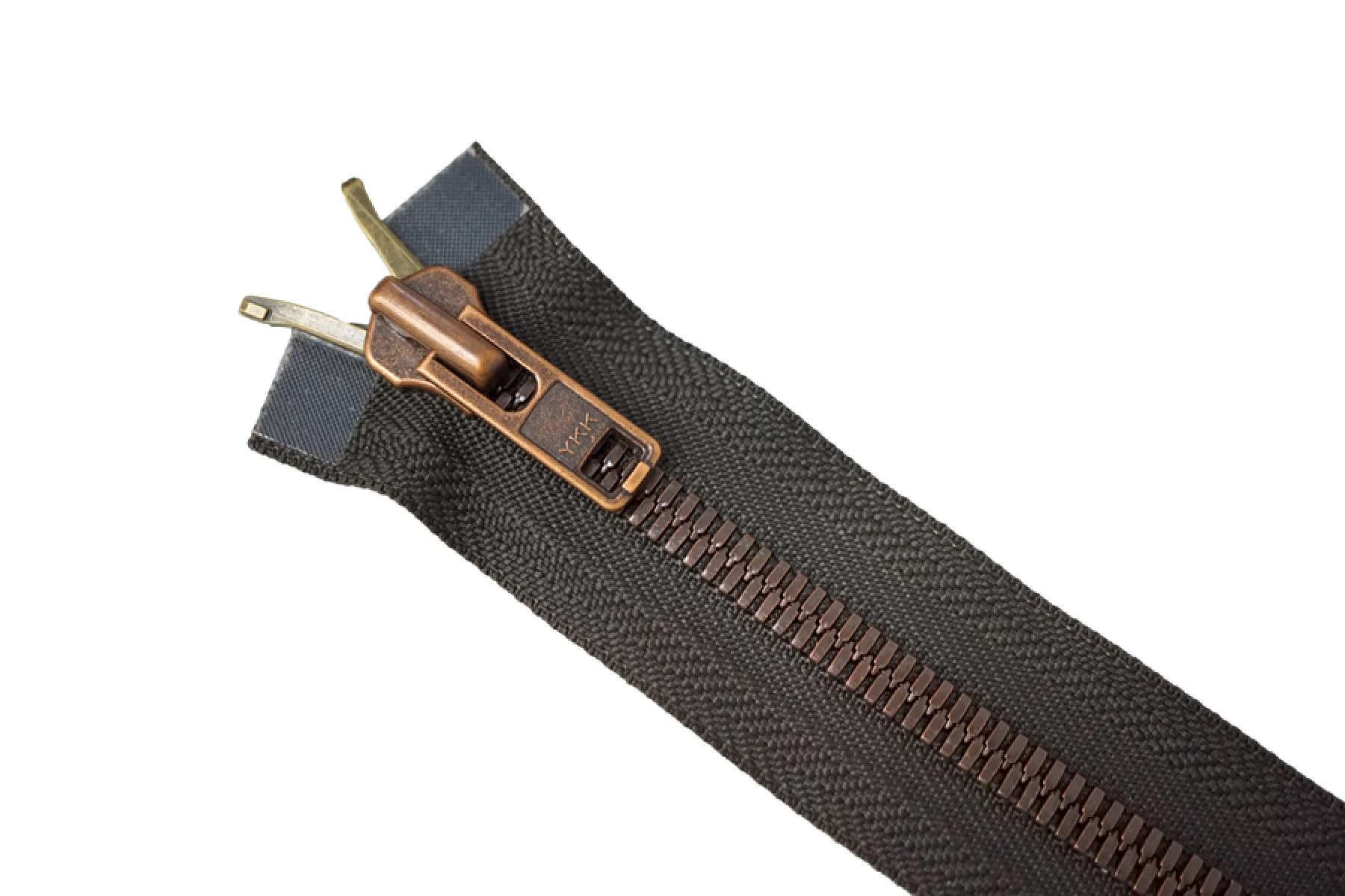 Молния металлическая, двухзамковая от Японского производителя "YKK", разъёмная. Цвет молнии серо-зеленый. Материал основы - киперная лента, плотная. Цвет зубцов - бронзовый. Слайдер и пулер также бронзового цвета. Ширина молнии - 3.7 см, ширина зубцов 0,7 см. Длина молнии 56 см.