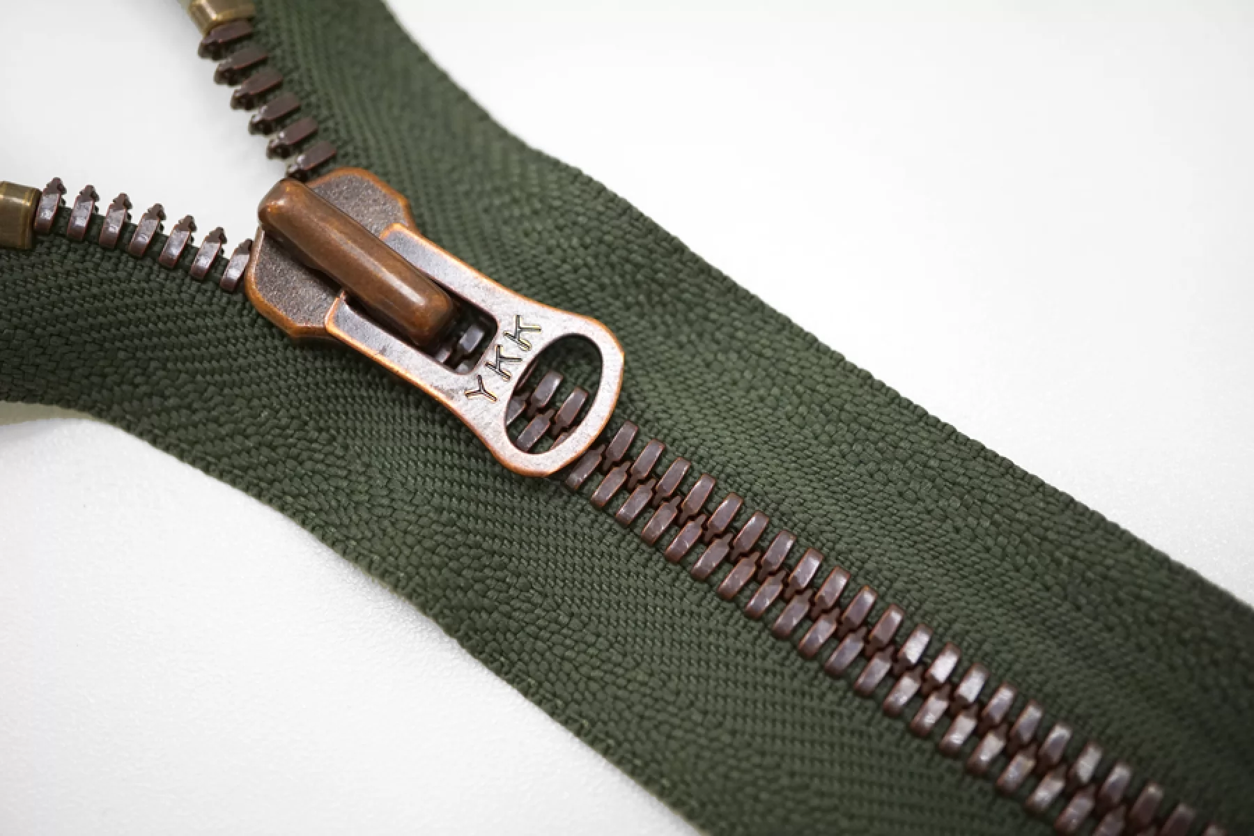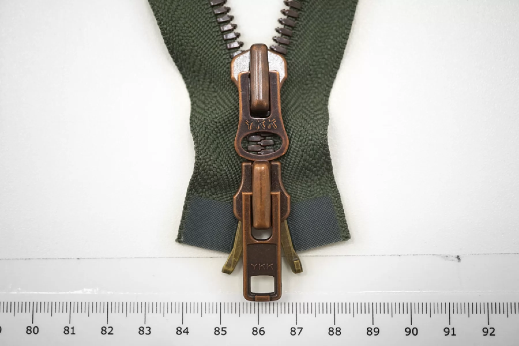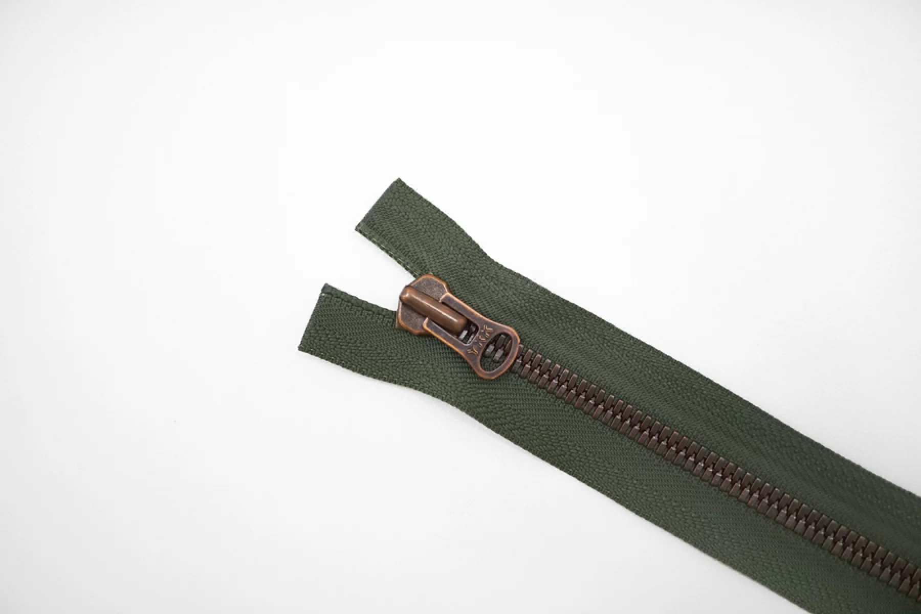 Молния металлическая двухзамковая от "YKK" разъёмная, темно-зеленая, цвет зубцов - бронза. Длина 54 см.