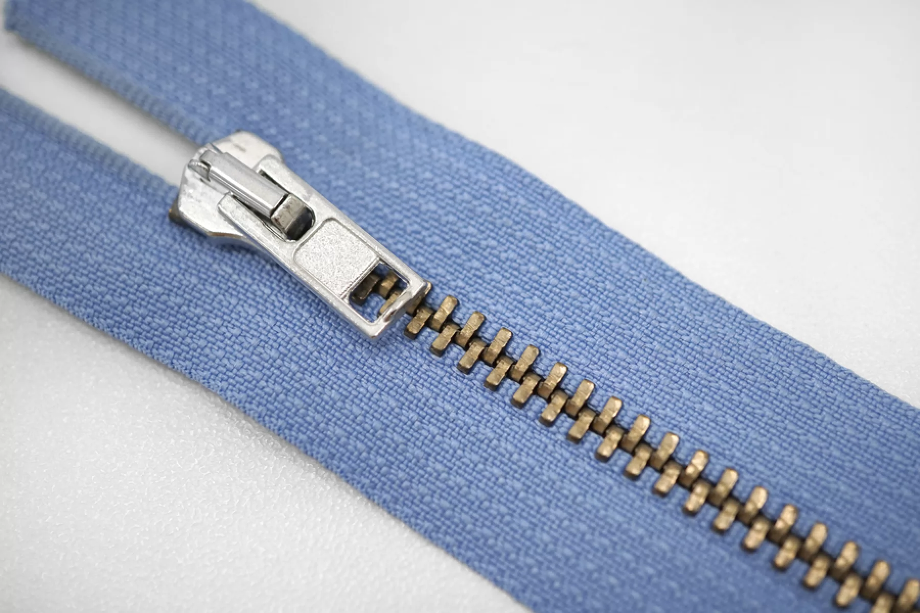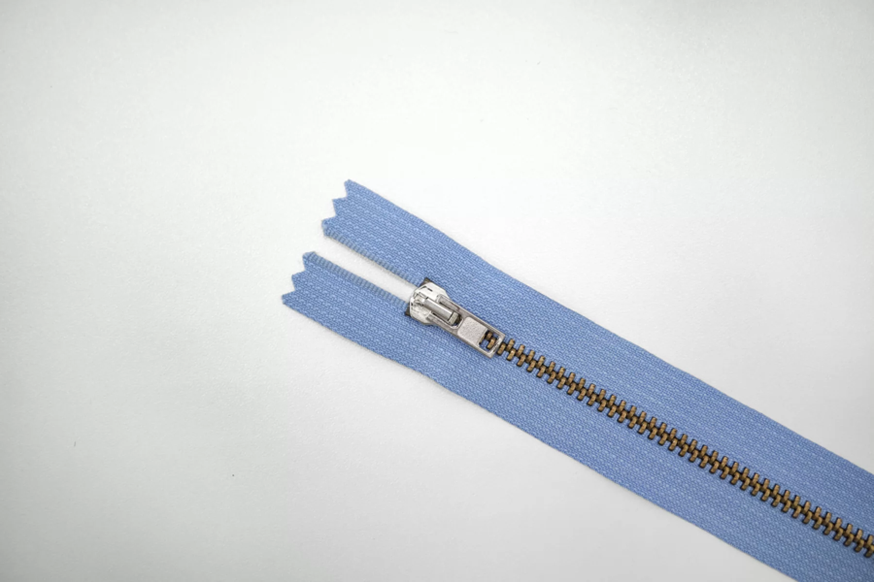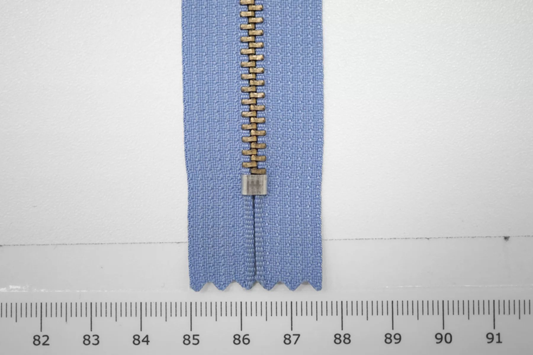 Молния металлическая неразъемная, голубая, цвет зубцов золотистый, слайдер и пуллер серебристый. Длина 12 см.