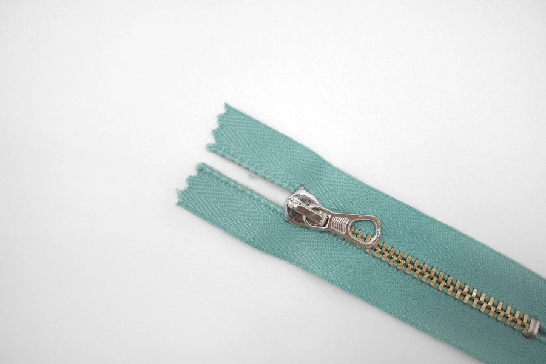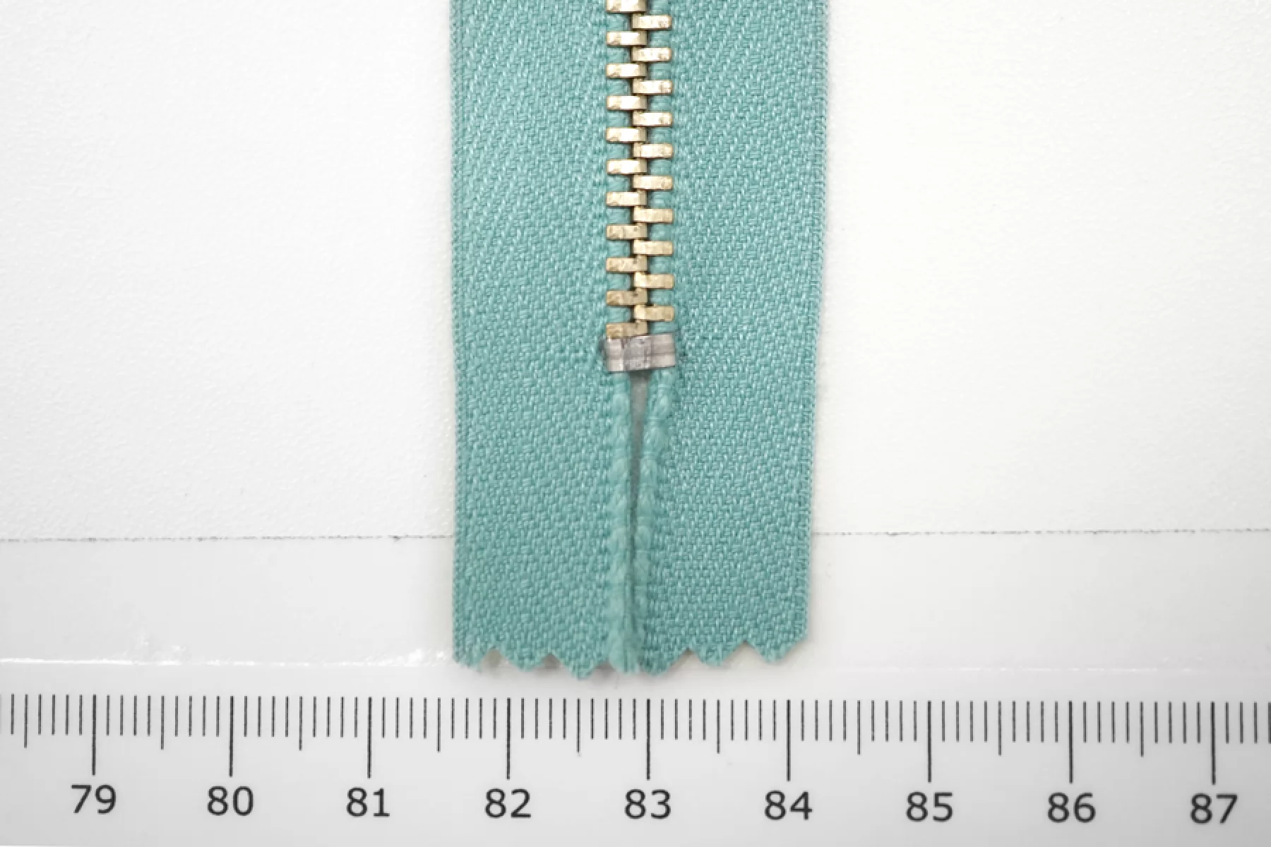 Молния от "Lampo" неразъемная, бирюзовая, цвет зубцов золотистый, слайдер и пуллер серебристый. Длина 8 см.
