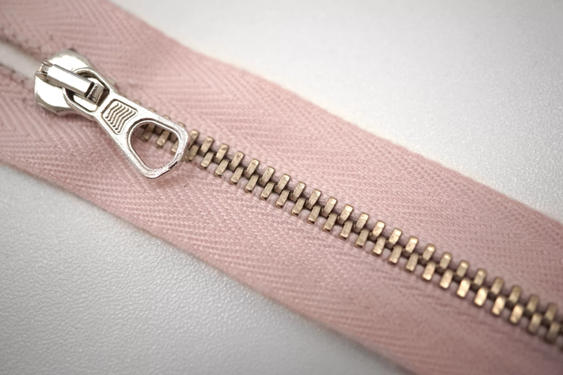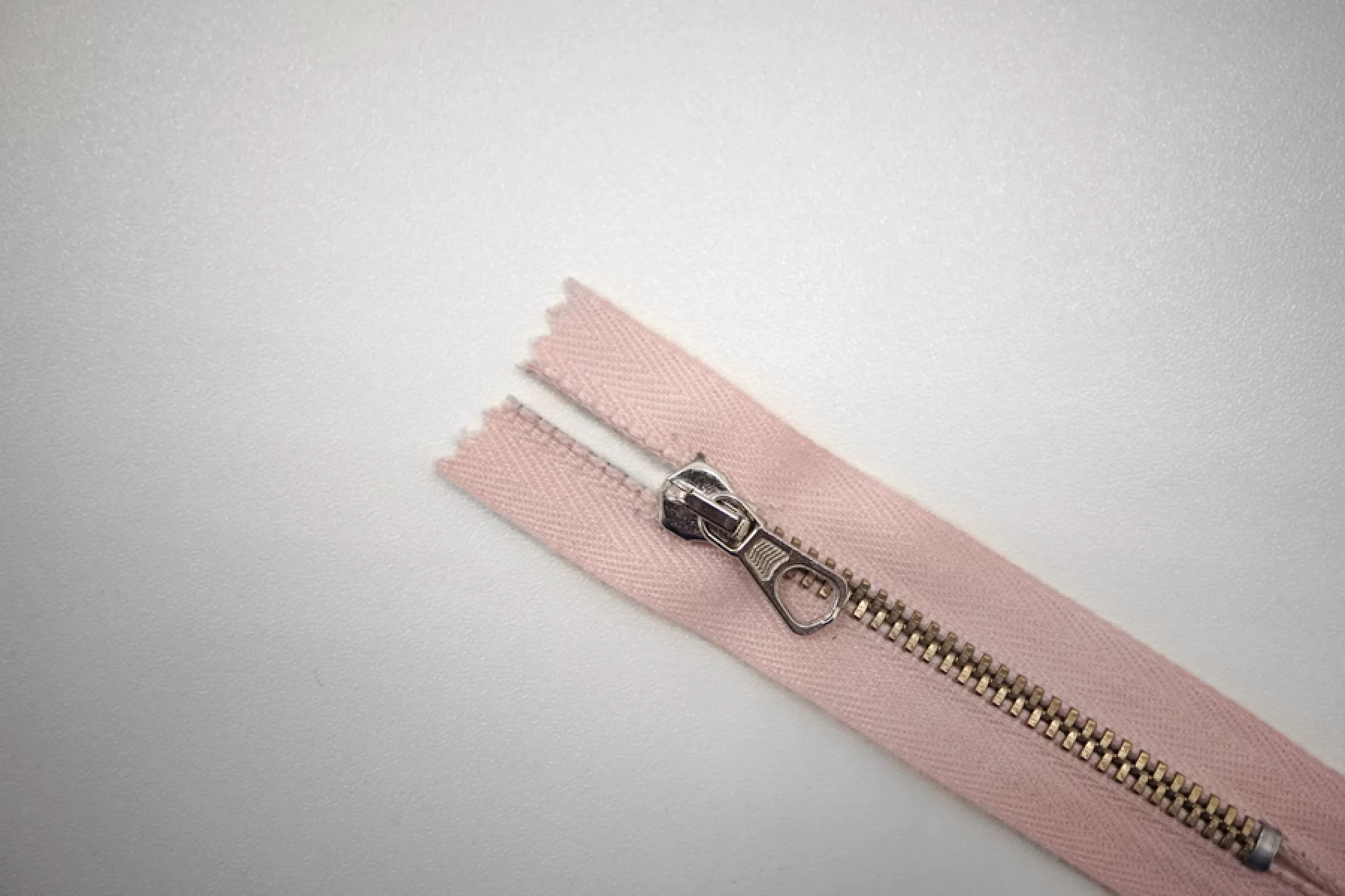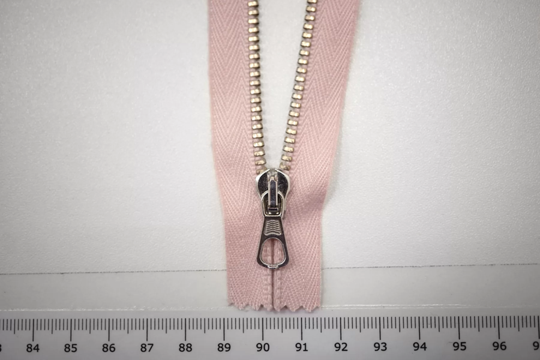 Молния металлическая от "Lampo" неразъемная, бледно-розовая, цвет зубцов золотистый, слайдер и маленький пуллер серебристый. Длина 8 см.