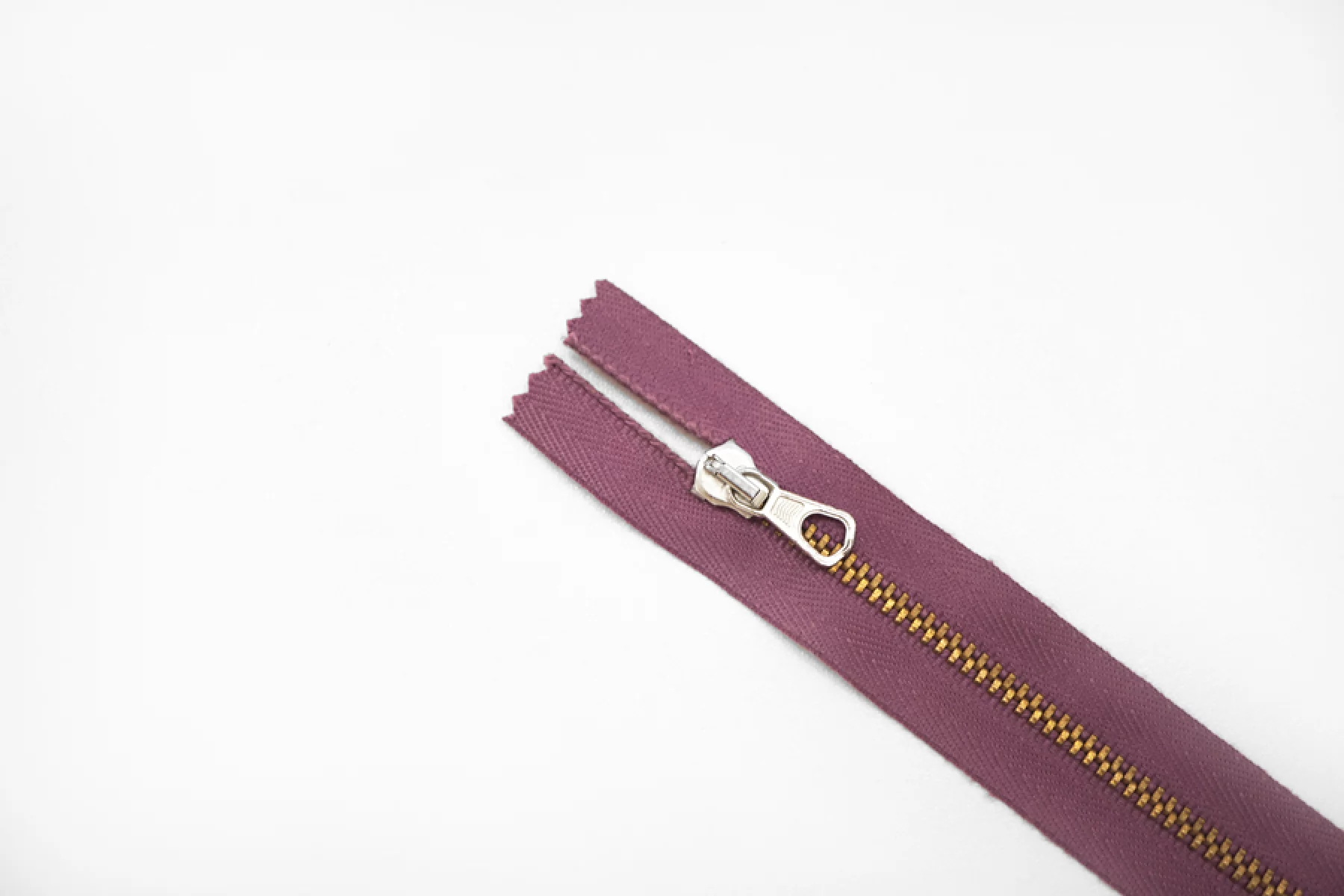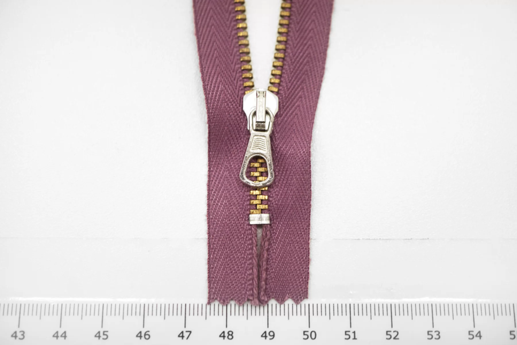 Молния от Lampo неразъемная, однозамковая, фиолетового цвета, цвет зубцов золотистый, пуллер и слайдер серебристые. Длина 7 см.