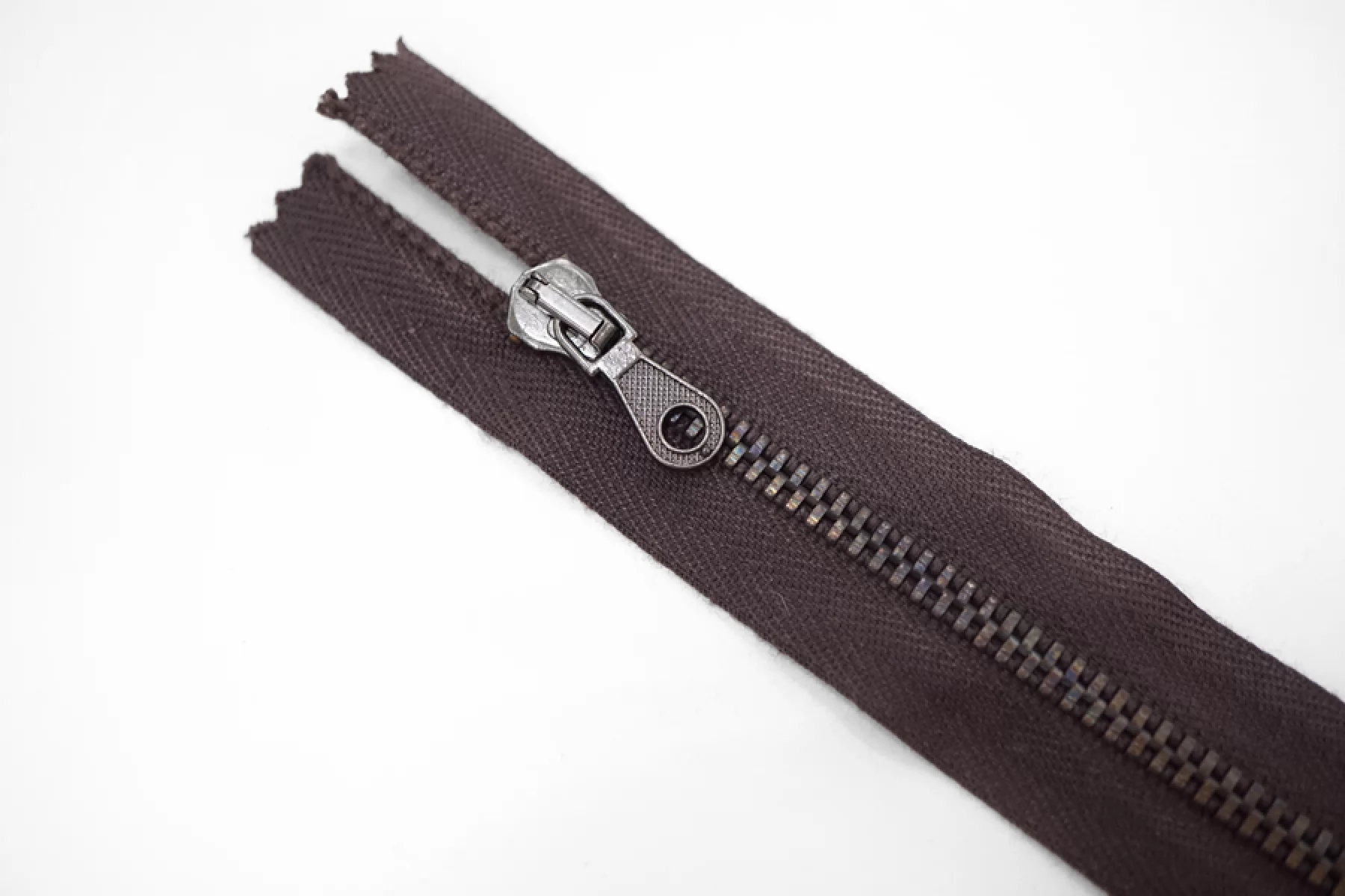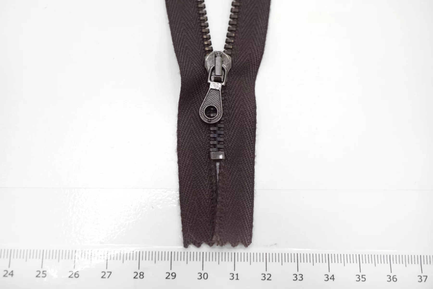 Молния металлическая однозамковая от "Lampо" неразъёмная, коричневого цвета, цвет зубцов и пуллера - никель. Длина 20 см.