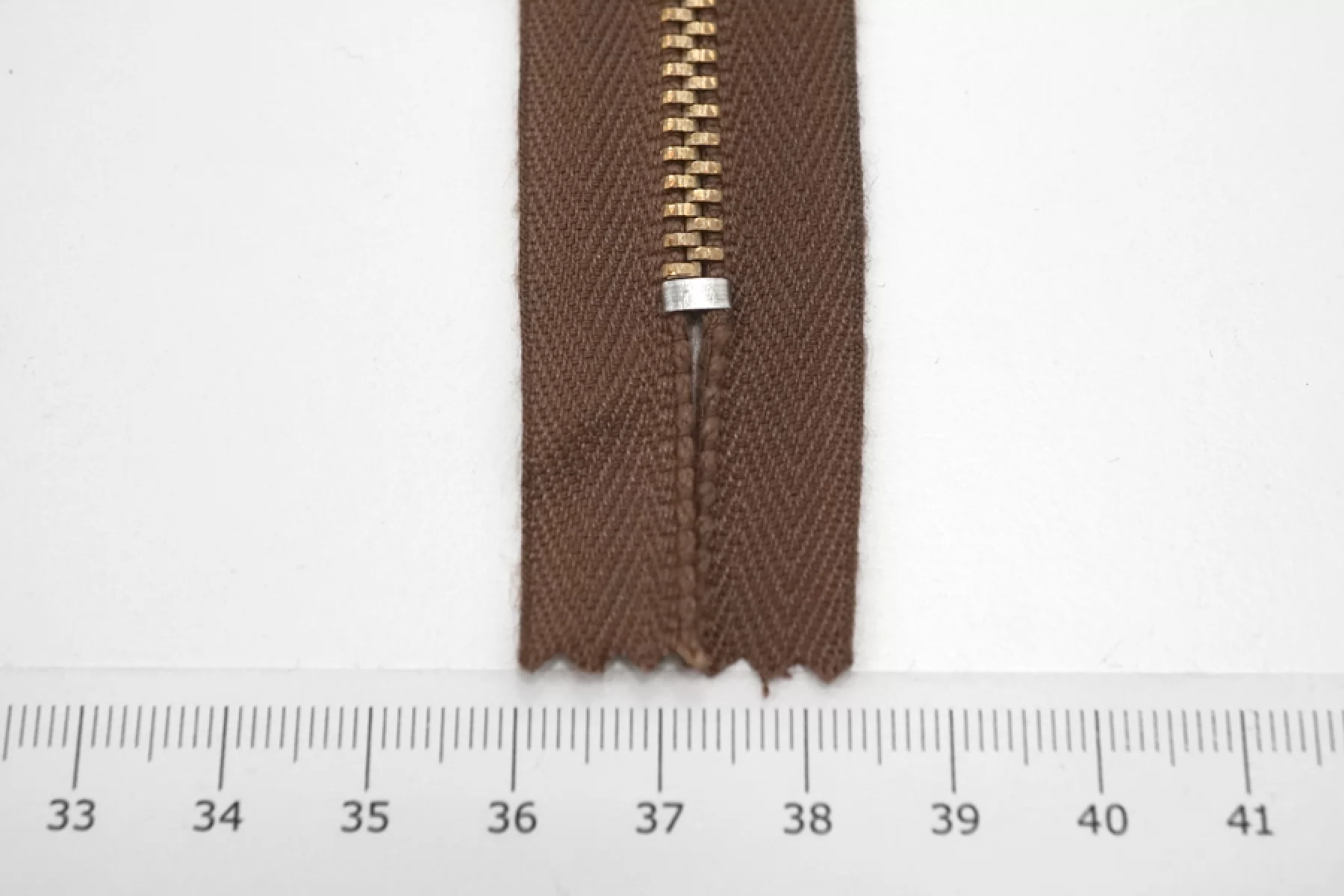 Молния от "Lampo" неразъемная, коричневая, цвет зубцов - золотистый, крупный слайдер серебристого цвета. Длина 13 см.