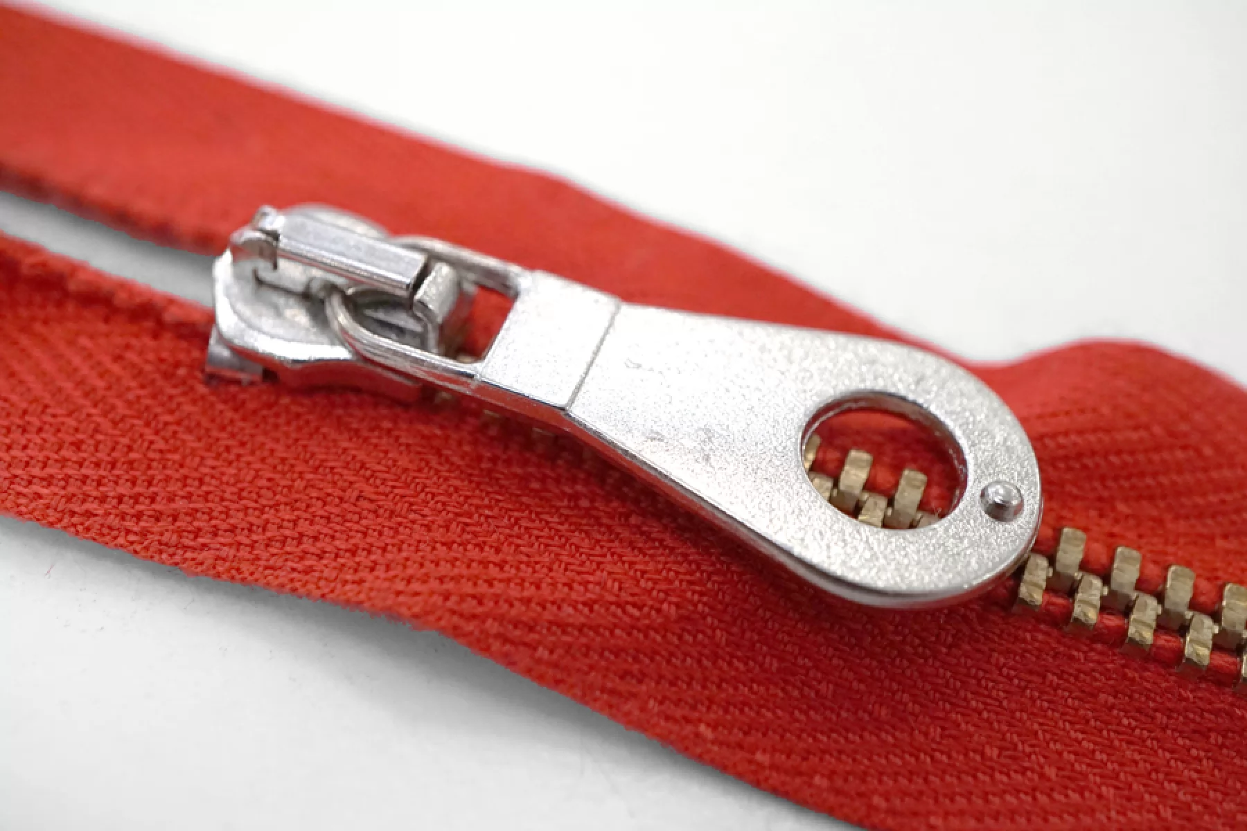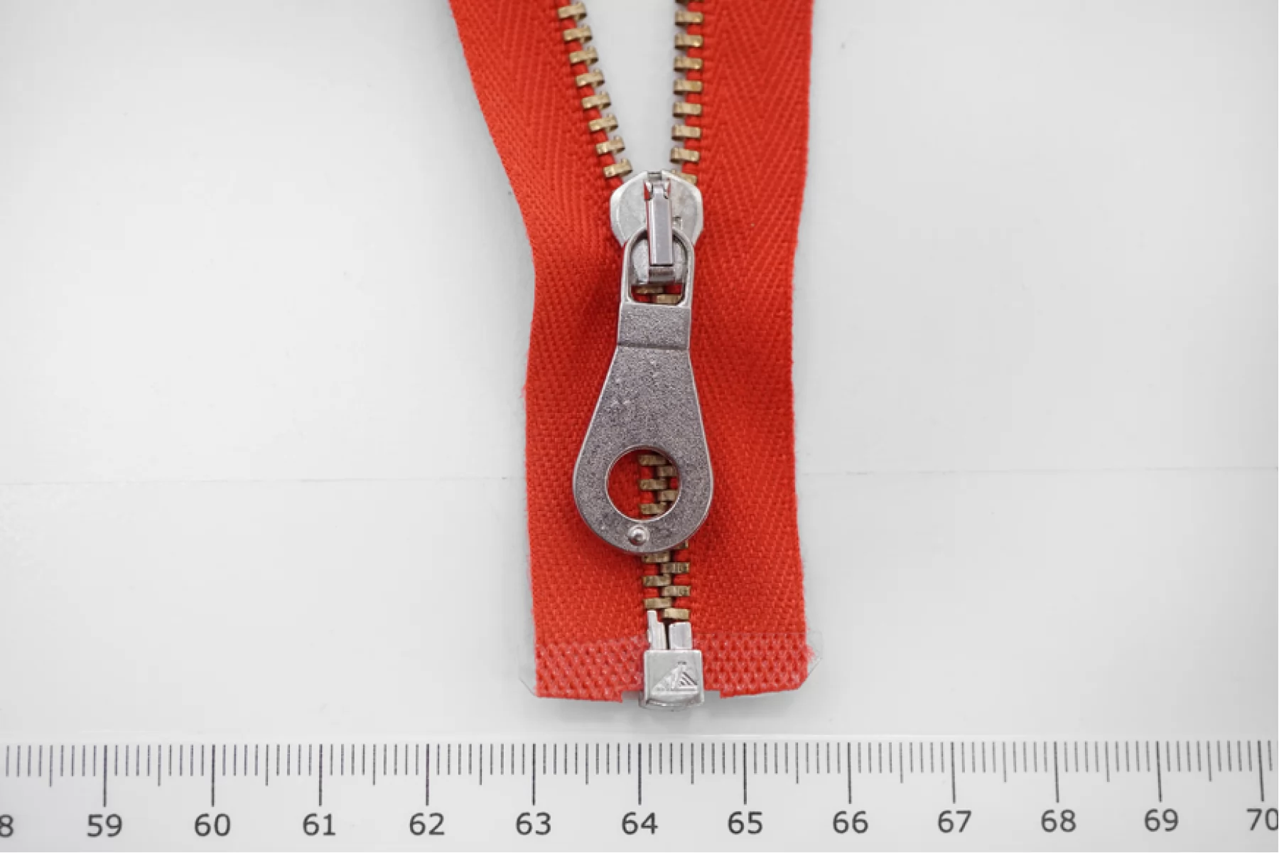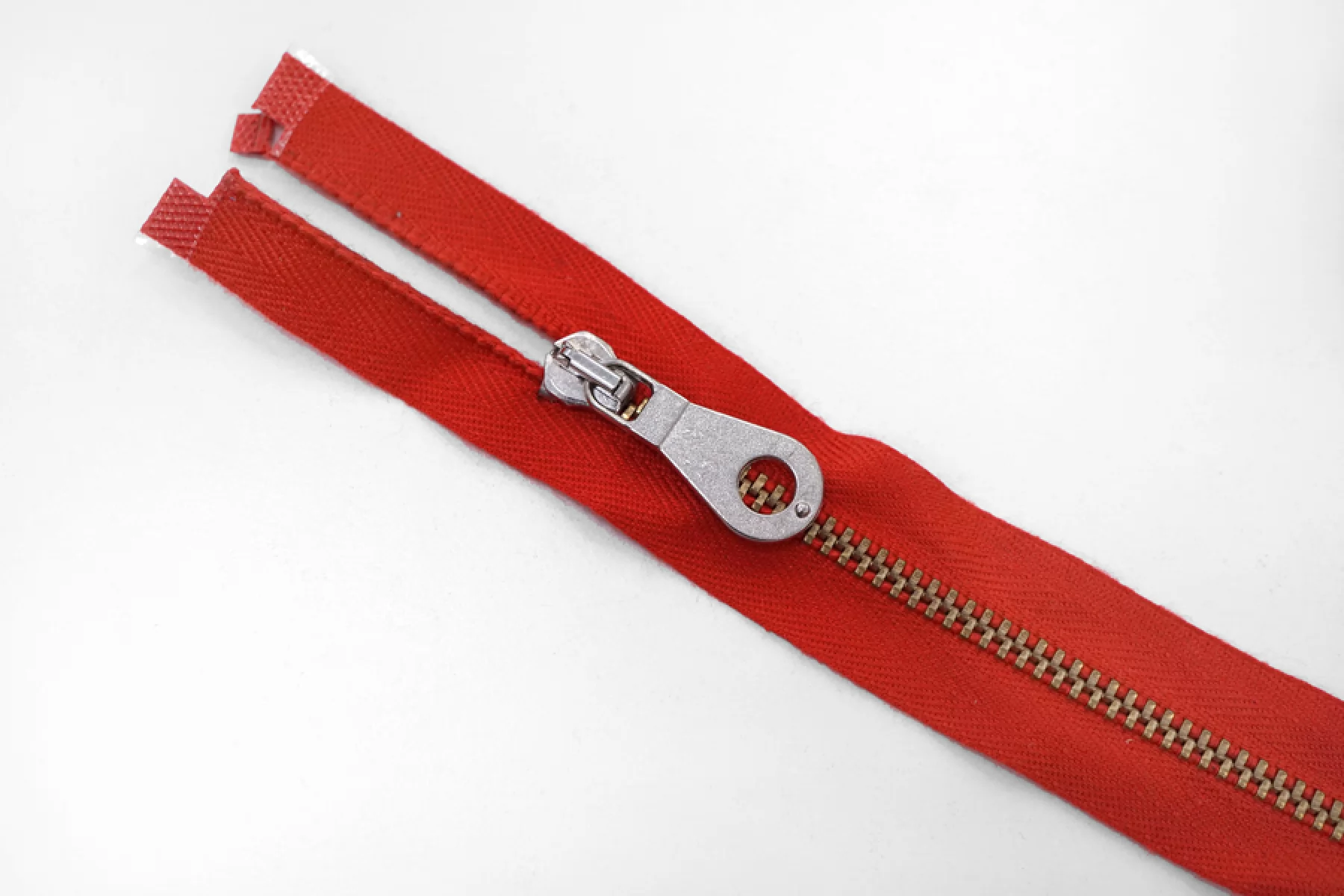 Молния от "Lampo" неразъемная, однозамковая, красного цвета, цвет зубцов золотистый, цвет пуллера серебристый. Длина 60 см.